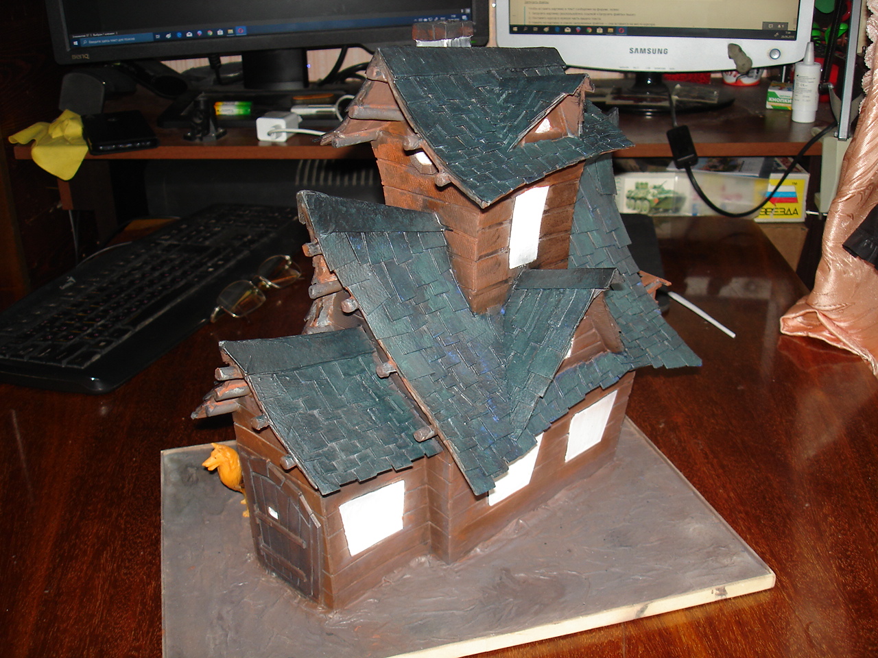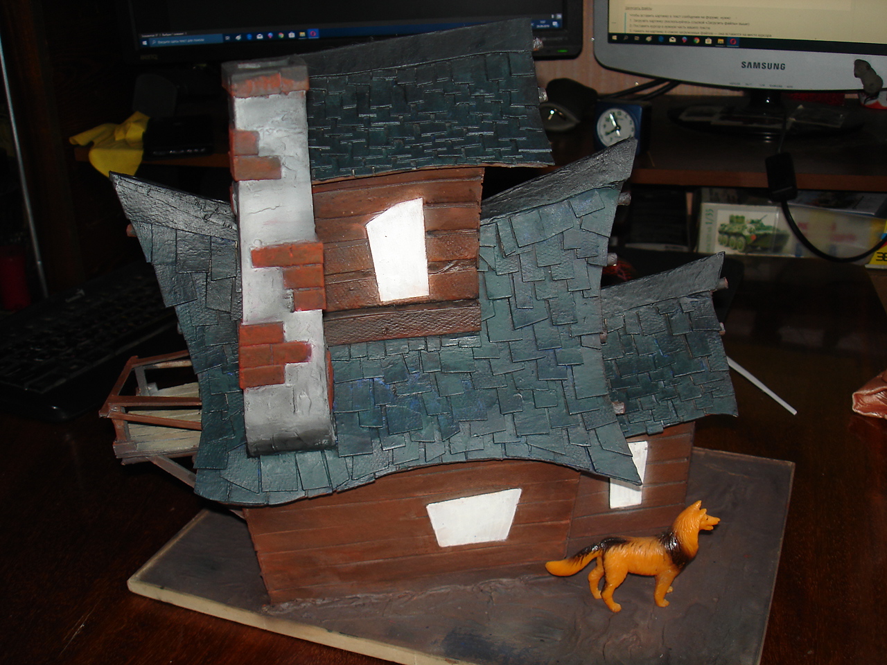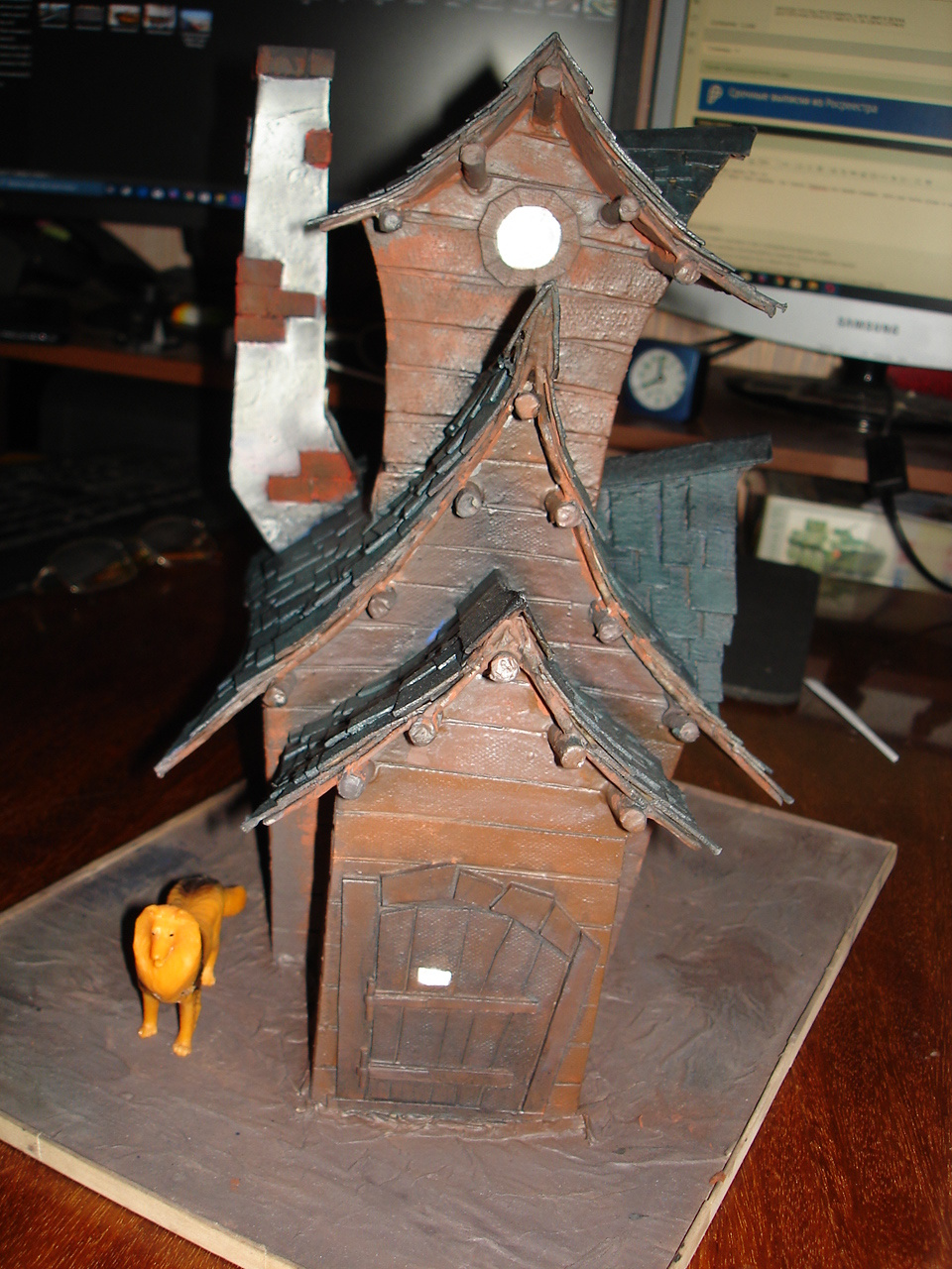 Василий,а домик классно получился,да со структурой картона немного вышла осечка,нужно было его немного грунтануть обычной строительной шпаклевкой,тонким слоем просто убрать структуру