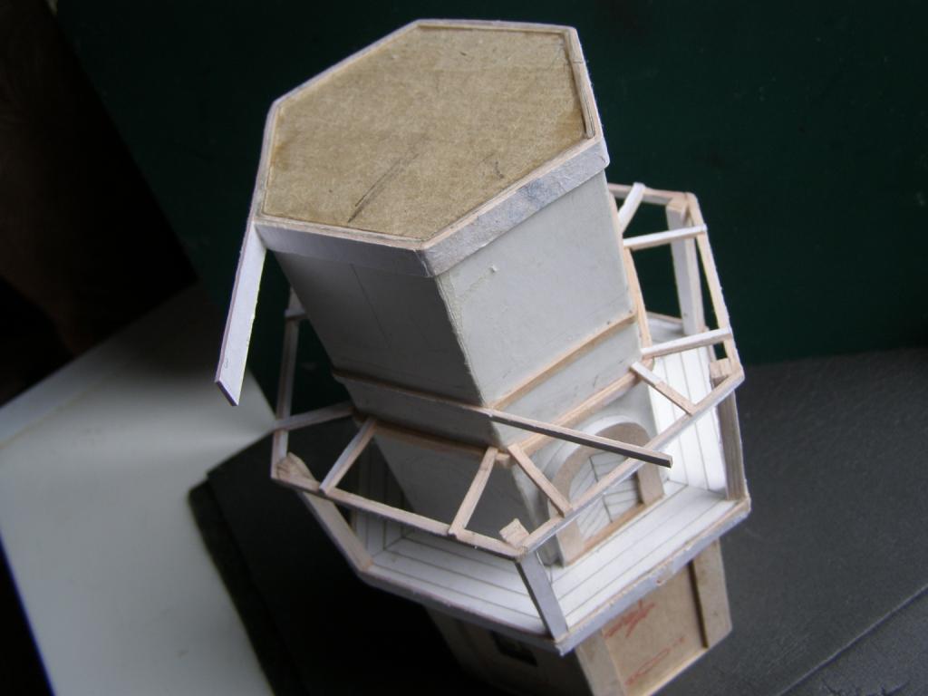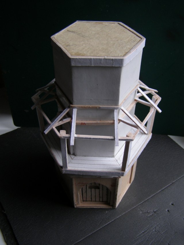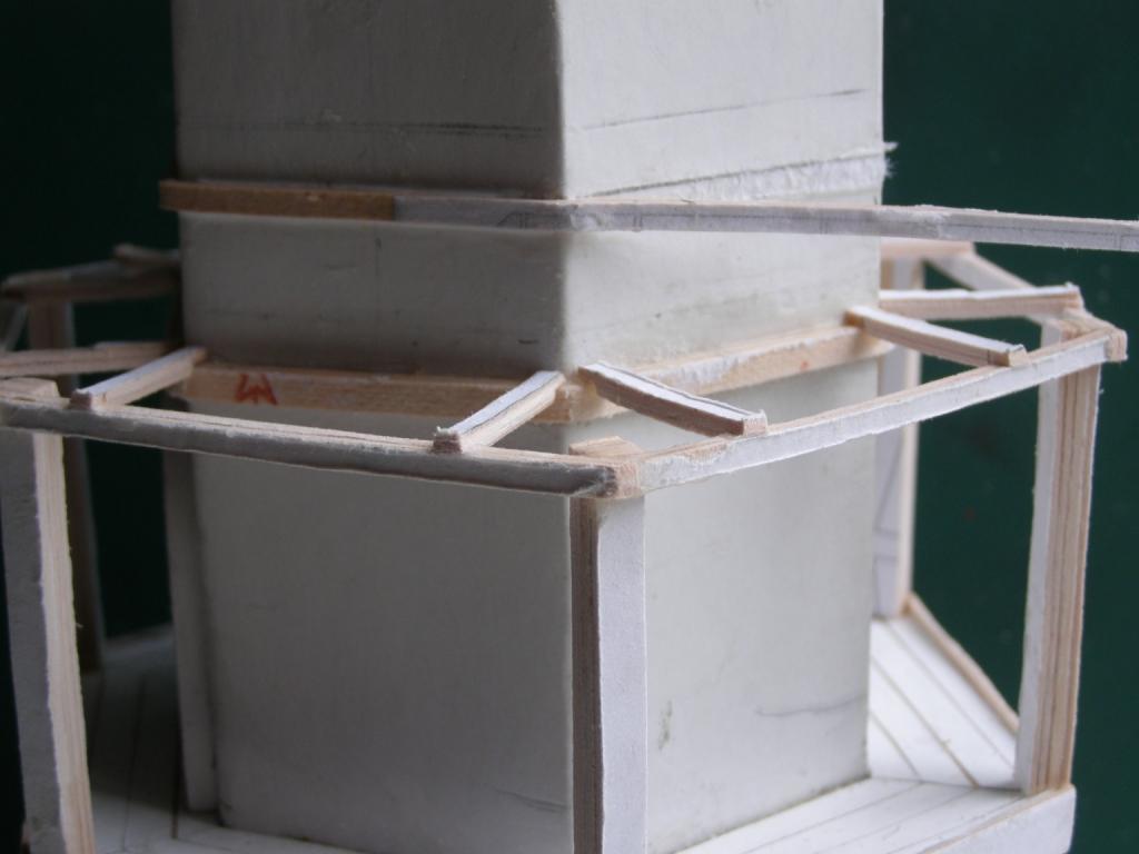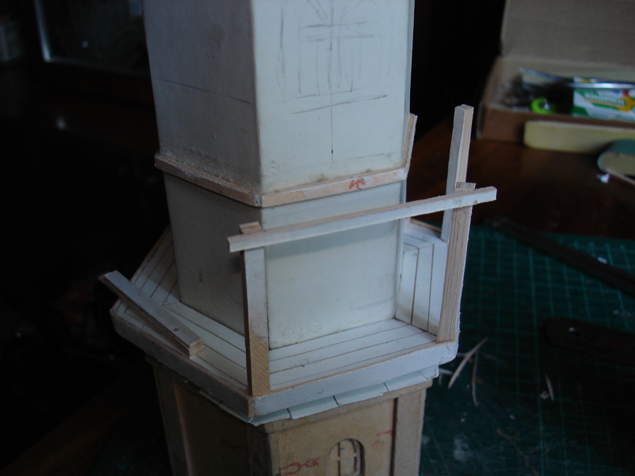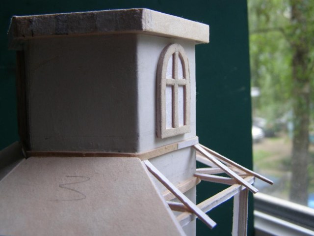 Далее монтируем основную конструкцию. Следующий шаг перила ограждения площадки. Оглядываясь после выполнения работы видишь и огрехи и другие решения... Думаю это многим знакомо и переделывать так можно ой как много. Крыша всю эту паутину скроет. Так что принял решение оставить все как есть. Так как это не храм то строгость линий тут явно неуместна и работа не претендует на точность, в ней будет много условностей.