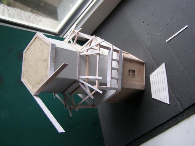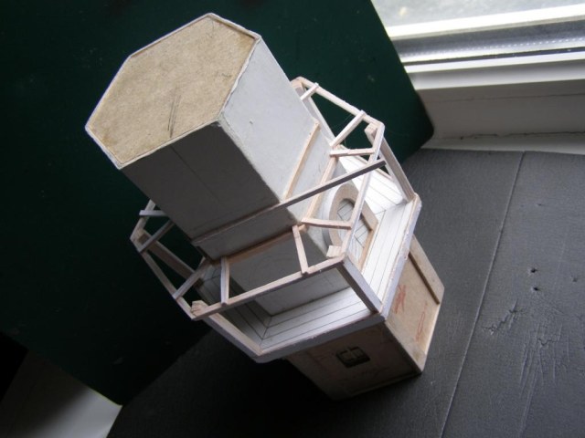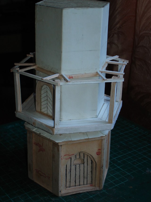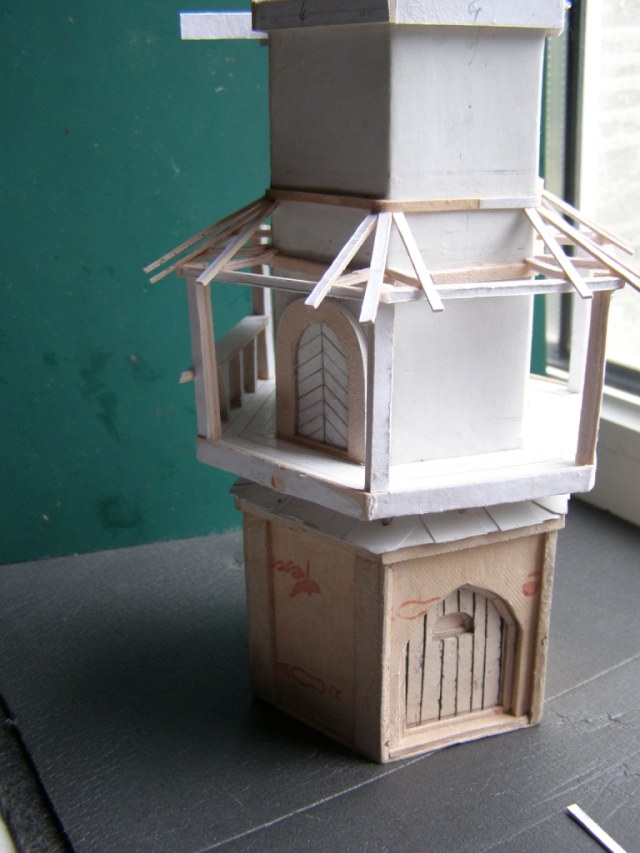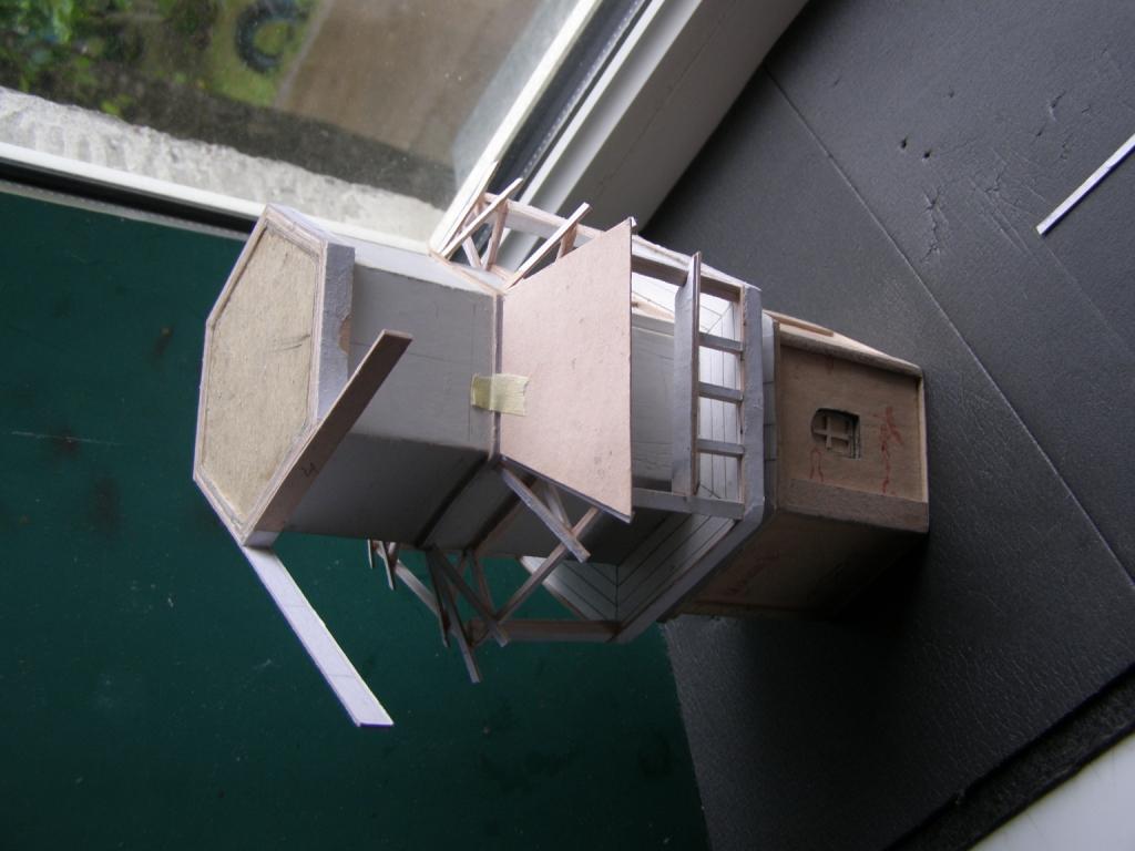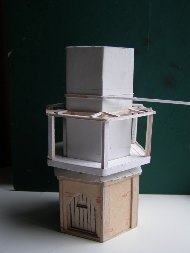 Далее монтируем основную конструкцию. Следующий шаг перила ограждения площадки. Оглядываясь после выполнения работы видишь и огрехи и другие решения... Думаю это многим знакомо и переделывать так можно ой как много. Крыша всю эту паутину скроет. Так что принял решение оставить все как есть. Так как это не храм то строгость линий тут явно неуместна и работа не претендует на точность, в ней будет много условностей.