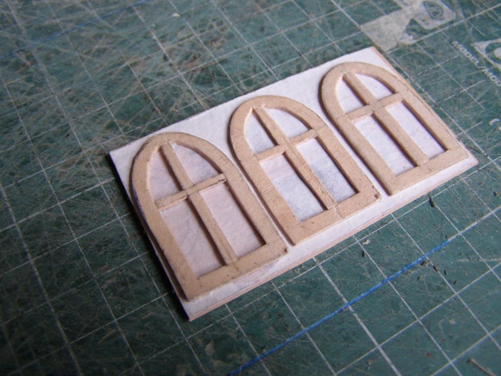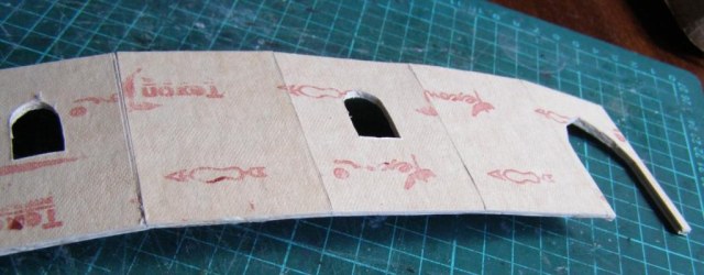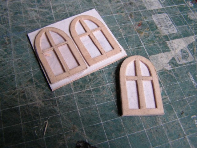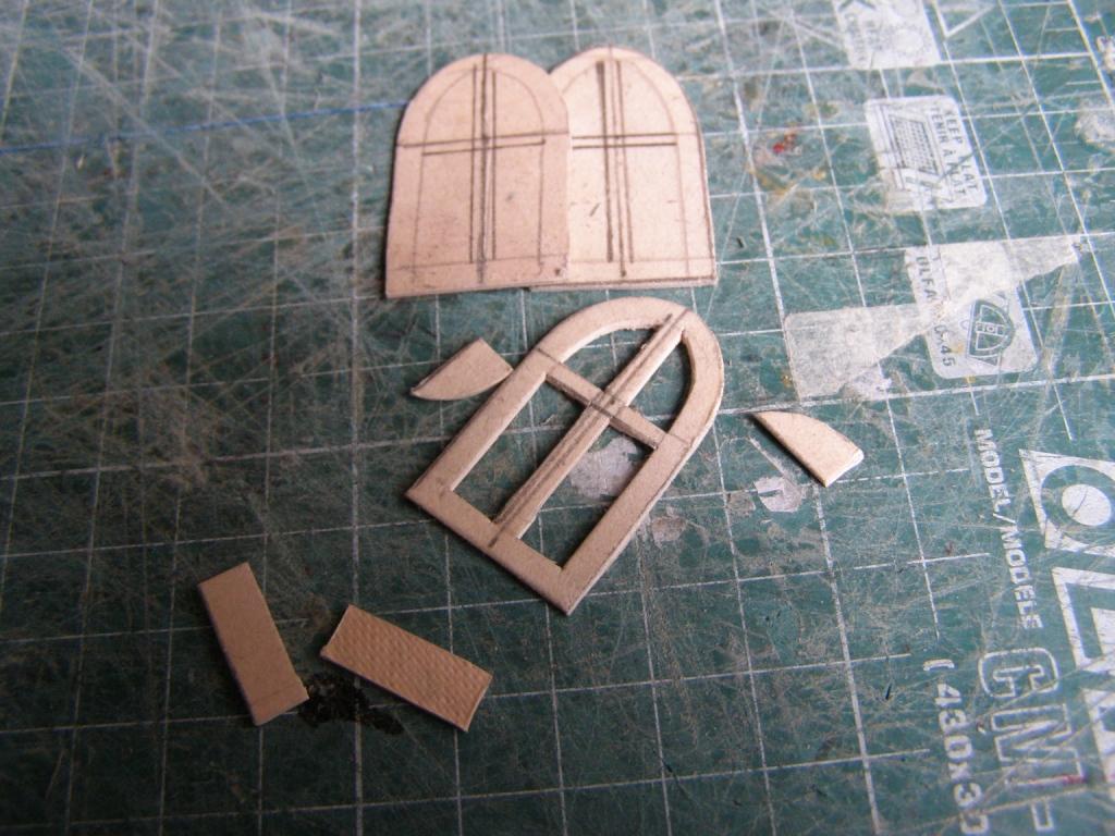 на заготовке прорезаем проемы окон и двери. Объем стены делаем наклеив дополнительные фрагменты на лицевой, а на дверном проеме еще и внутри. Также по дверному приклеил четвертую накладку внутри и обрезал ее обозначив тем самым косяк двери.