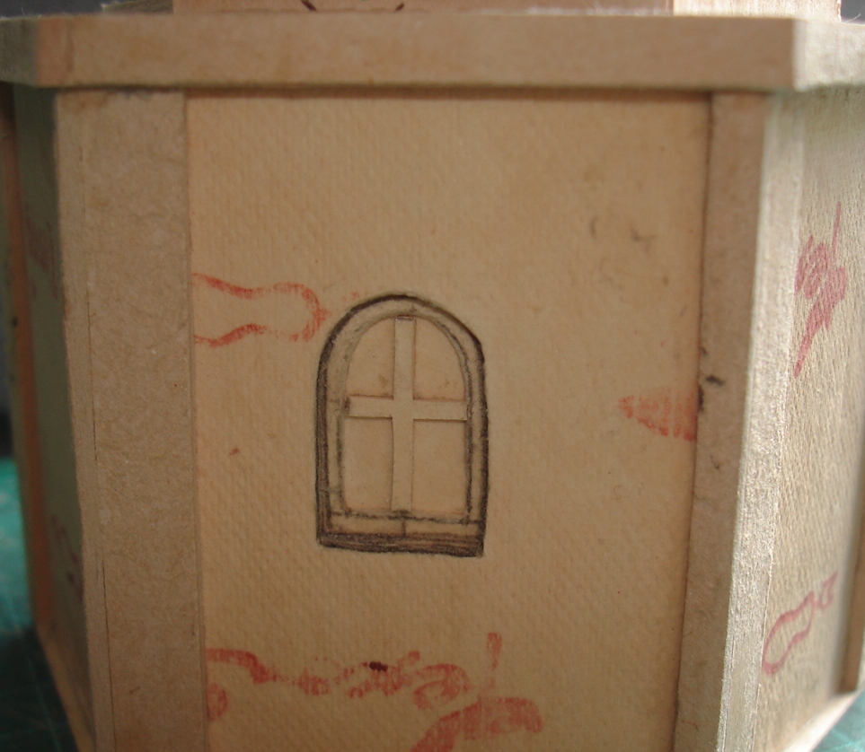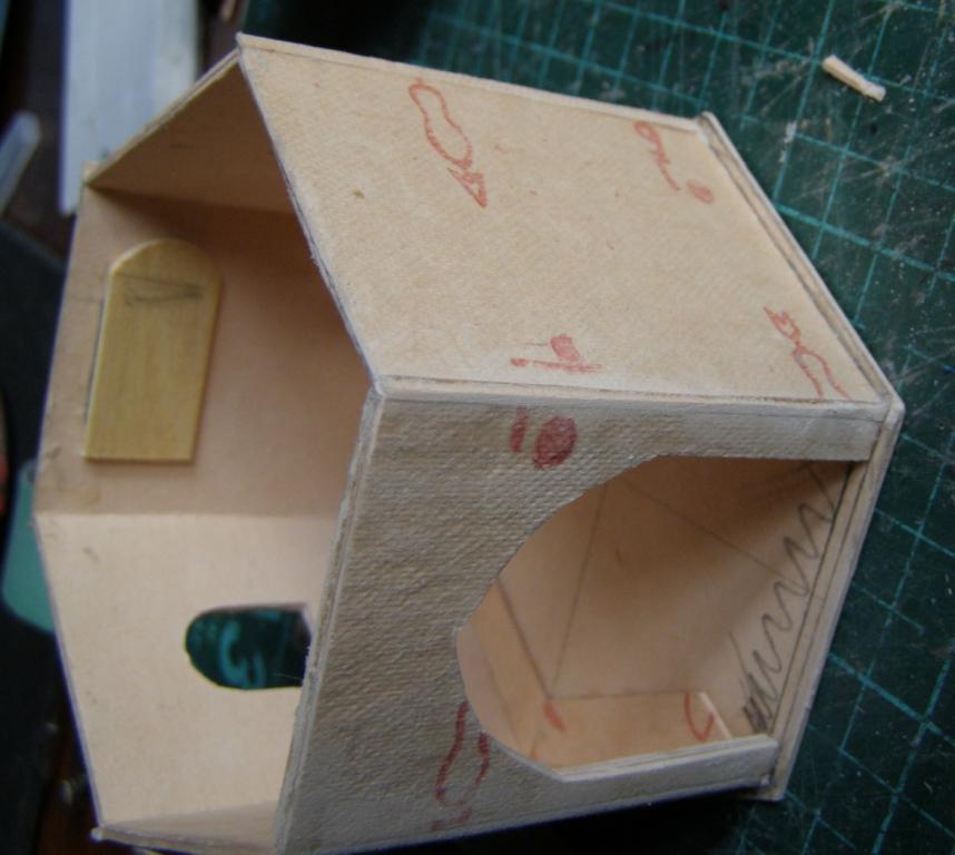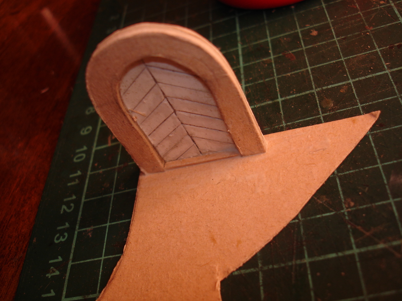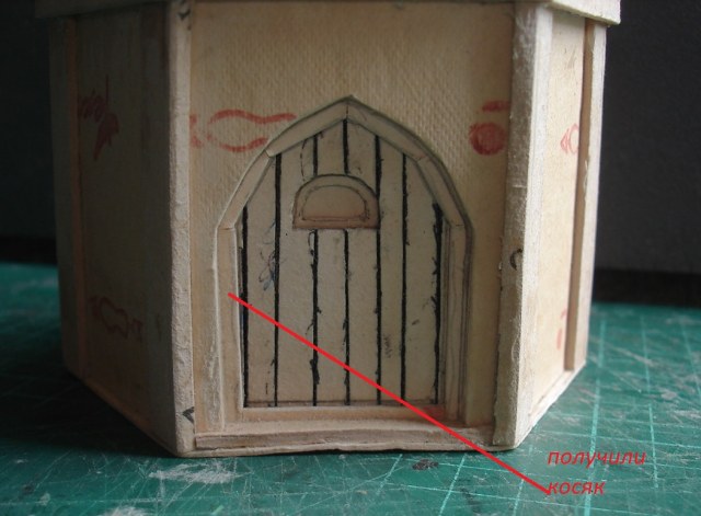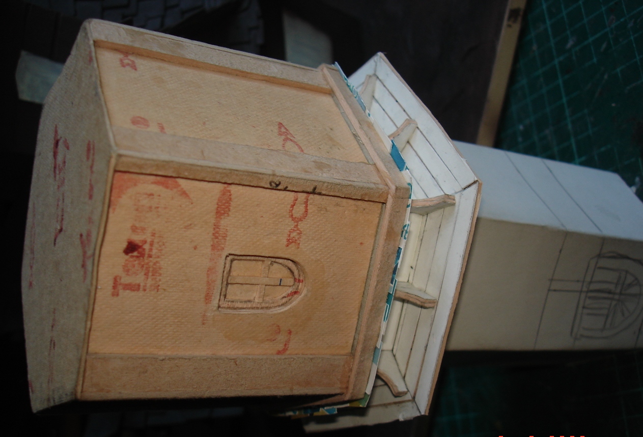 По надрезам сформовали конструкцию и приклеили к основанию. приклеили и обозначили порог двери. с дверь поступили просто на заготовку прямоугольную наклеили имитацию доски , вырезали смотровое окно и по той же технологии рама и остекление