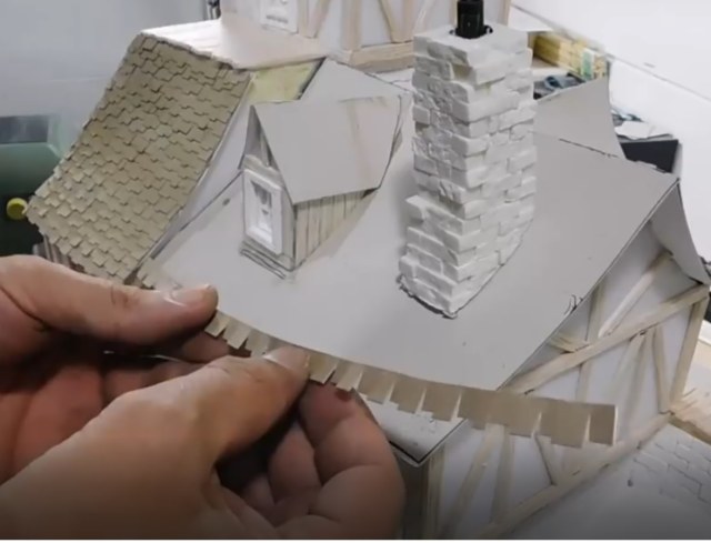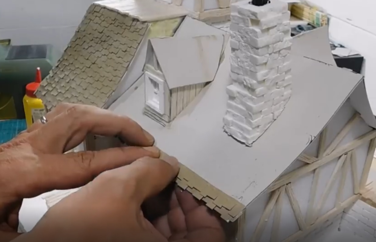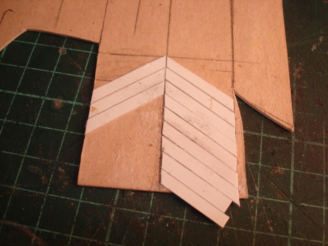 придаем форму полоски и наклеиваем на крышу, следующую смещаем на половину и клеим....