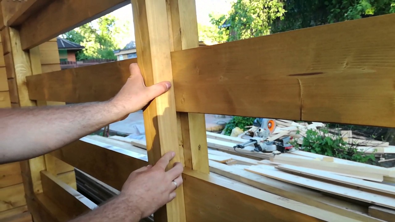 Обшили площадку по периметру. пустили брус по стенам по кругу. на него лягут элементы крыши.