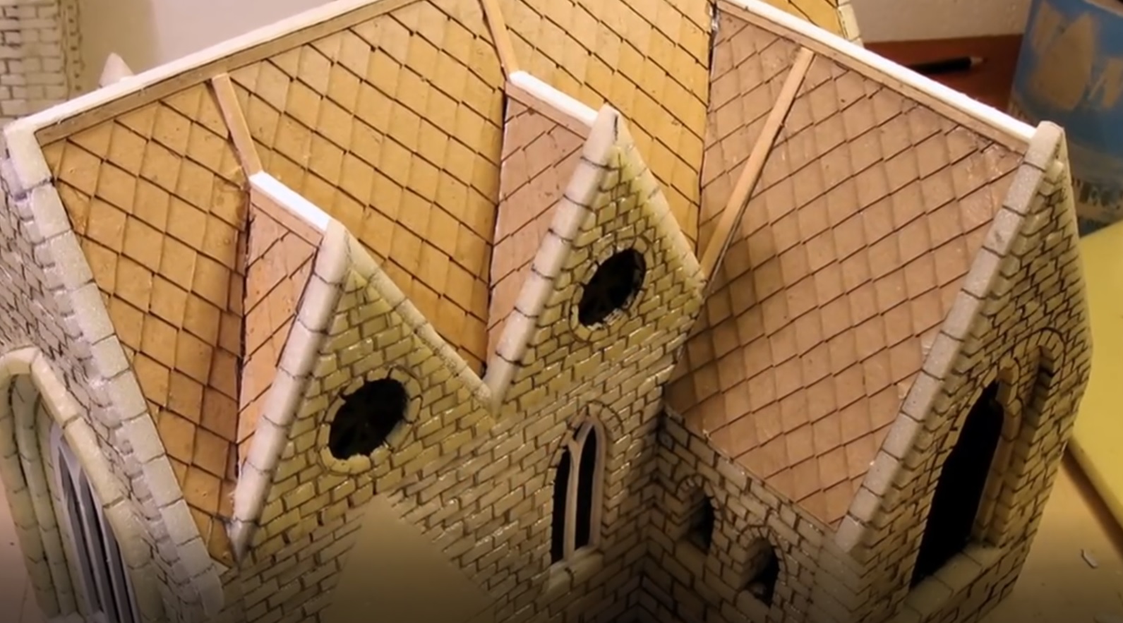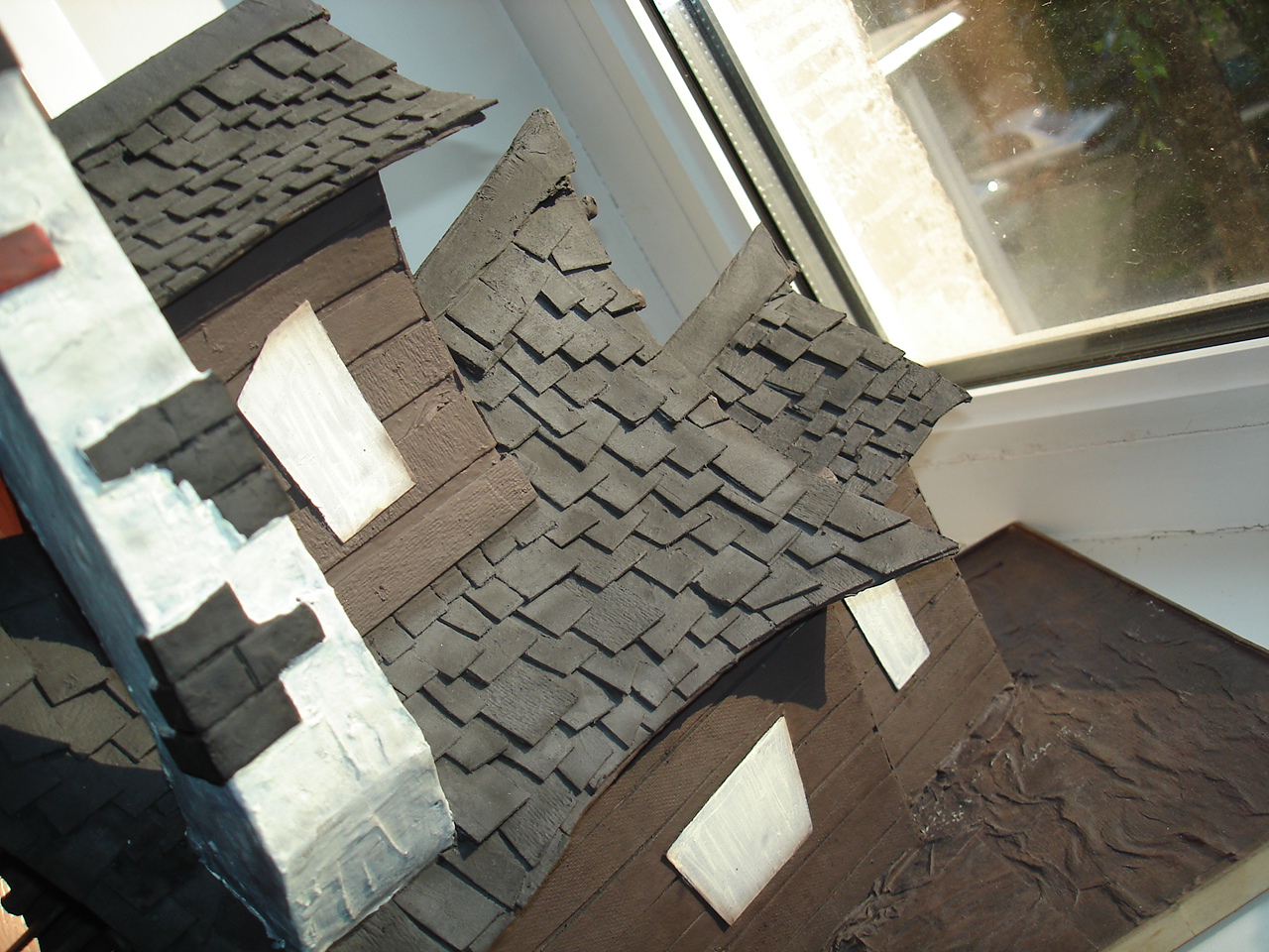 примерил одну секцию крыши, обозначил рельеф доски внизу. кровля будет под черепицу.