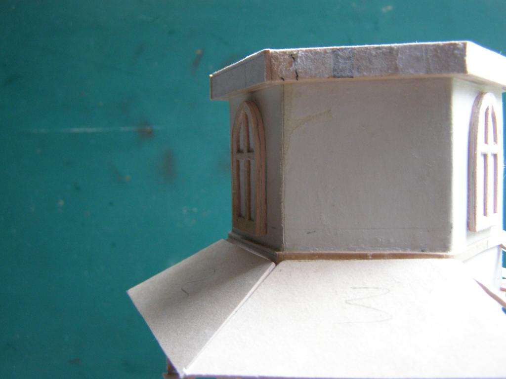 Сегодня занимался секциями крыши балкона, также сделал окна третьего этажа.. Вот только решил проемы сделать объемными. окна занимают свои стороны на гранях двери и окон первого этажа.