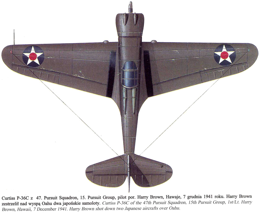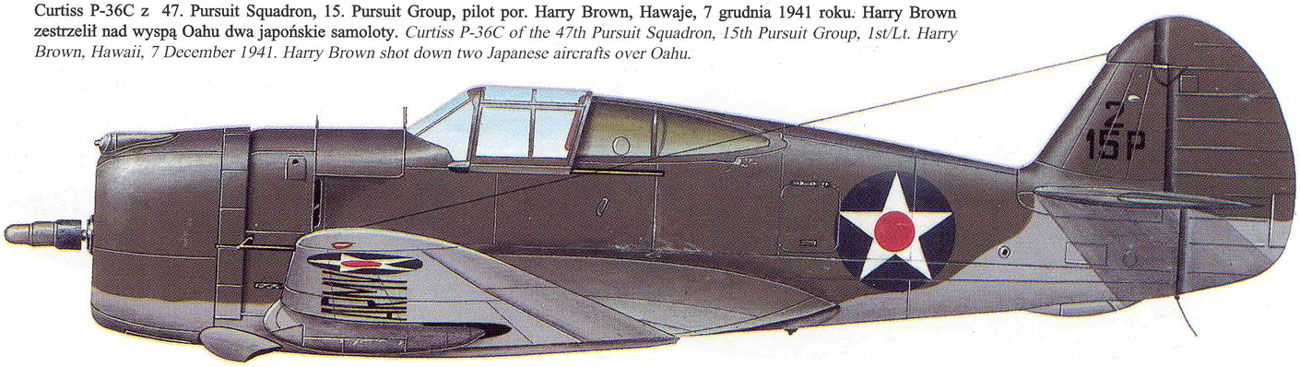 Старший лейтенант Гарри Браун рано утром 7 декабря 1941 года вернулся после вечеринки вместе со своим соседом Джонни Дэйнсом, и собирался лечь спать, когда над головами пилотов прошла первая ударная волна японских самолетов. Прыгнув в машину, они понеслись на ближайшую базу, аэродром Халейва, подобрав на пути еще одного пилота, Боба Роджерса. На пути им пришлось уклоняться от атаки Зеро, который обстрелял их машину. Прибыв на аэродром, он взлетел в паре с младшим лейтенантом Малколмом Муром из 46 эскадрильи на истребителе П-36 с номером 2/15Р, по одним данным варианта П-36А, по другим П-36С. Летный костюм Брауна был весьма странен - брюки от смокинга, пижамная куртка, тапочки, летный шлем и очки. После взлета, оказалось что заряжен и работает только один пулемет винтовочного калибра. Несмотря на это Браун и Мур атаковали группу B5N2 Кэйтов с авианосца Сорю, и Браун сбил два из них, став таким образом одним из 5 (или 6) пилотов, кто официально сбил минимум 1 самолет противника во время атаки.