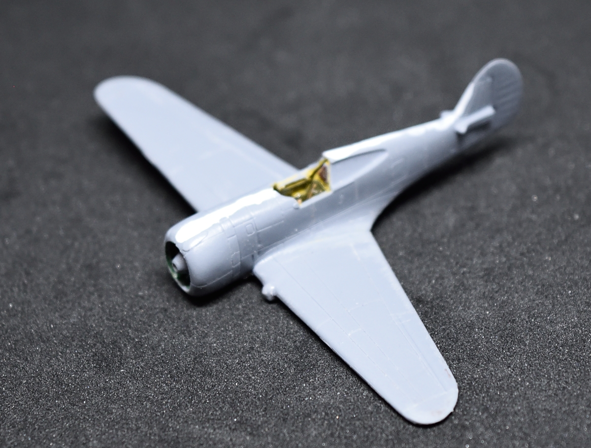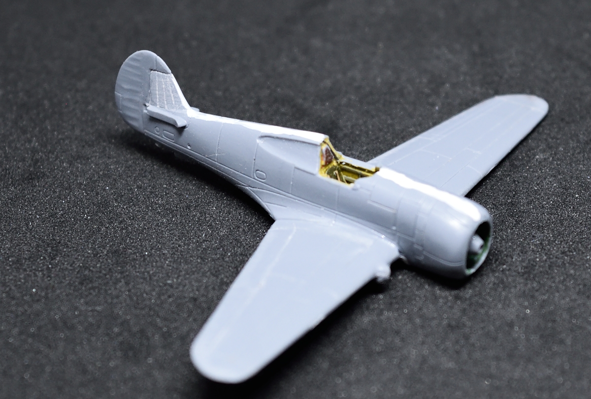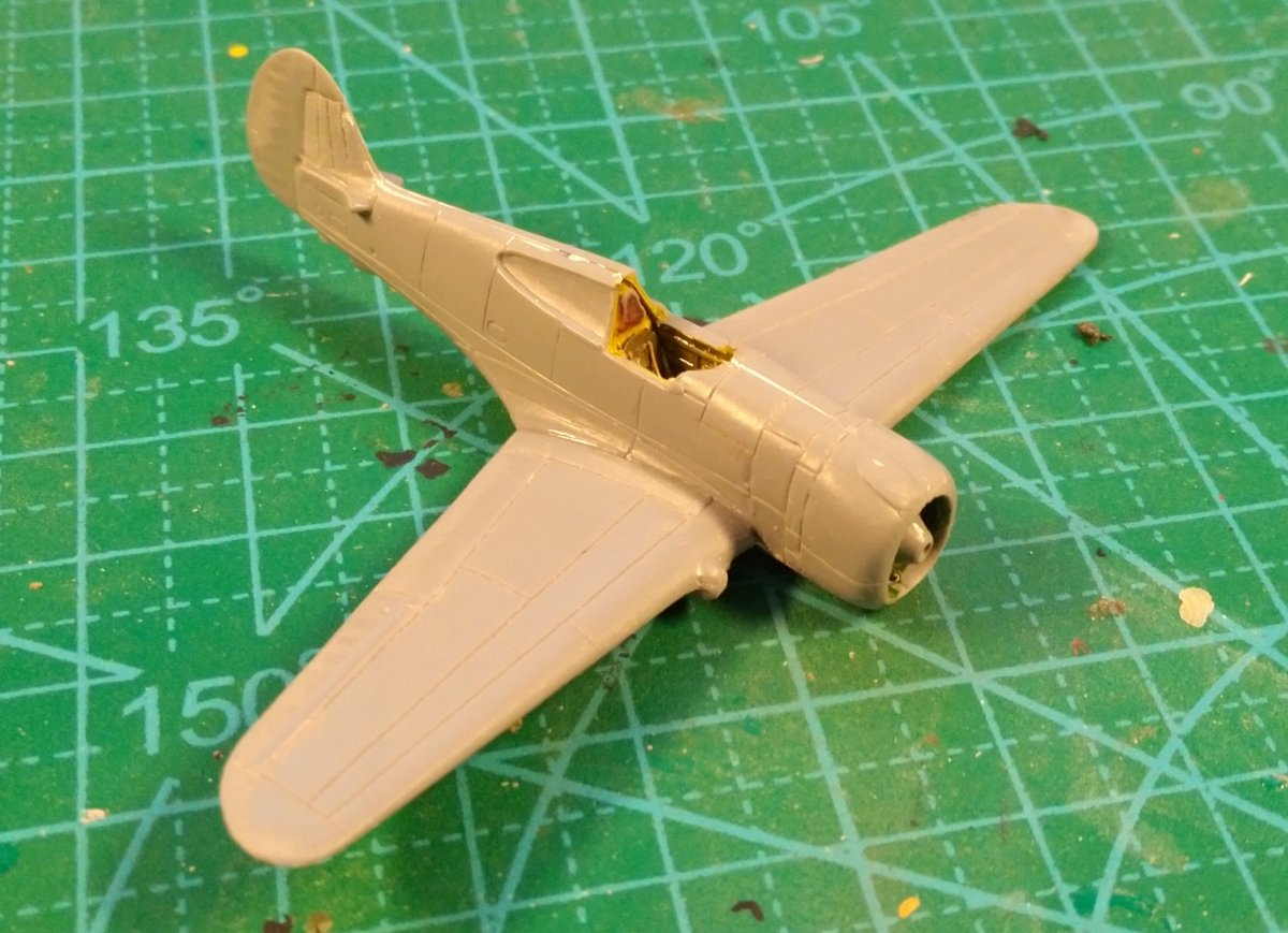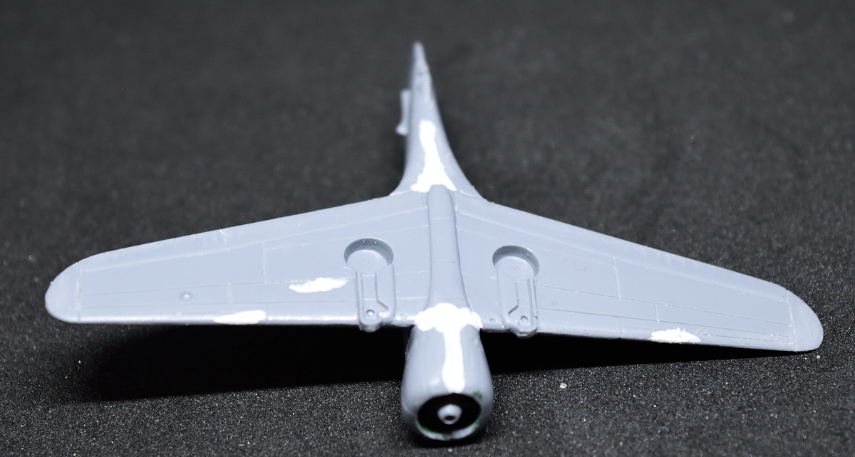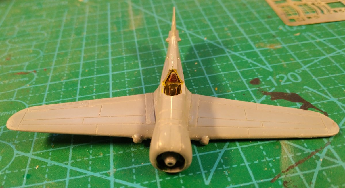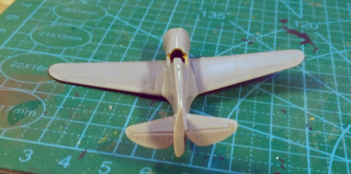 Сейчас вот так выглядит. Закрыл фюзеляж, зашпаклевал швы и дефекты Сурфайсером, сейчас сохнет.