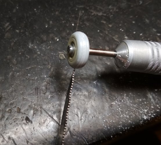 @FROGER написал:Вот: зажимаем колесо в дискодержатель и резцом (надфилем) протачиваем бороздки в бормашине.
