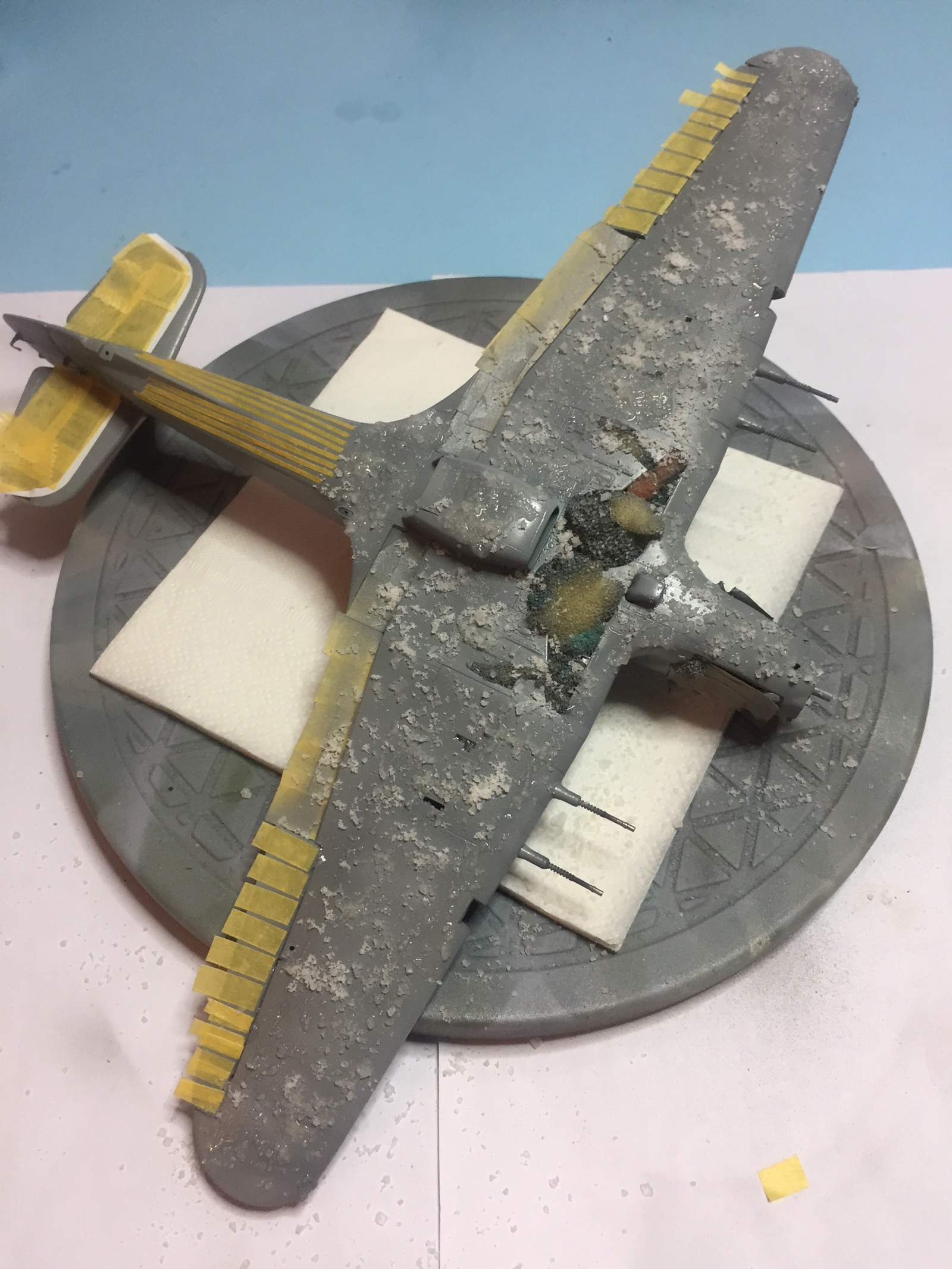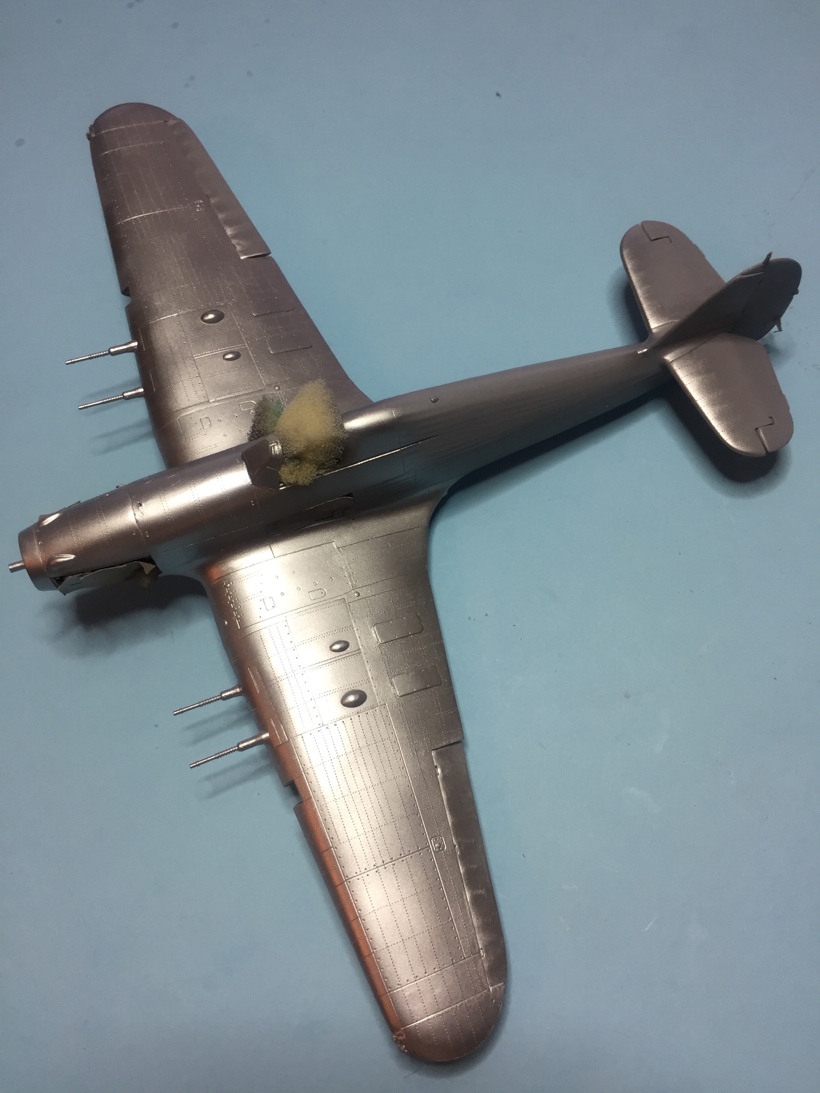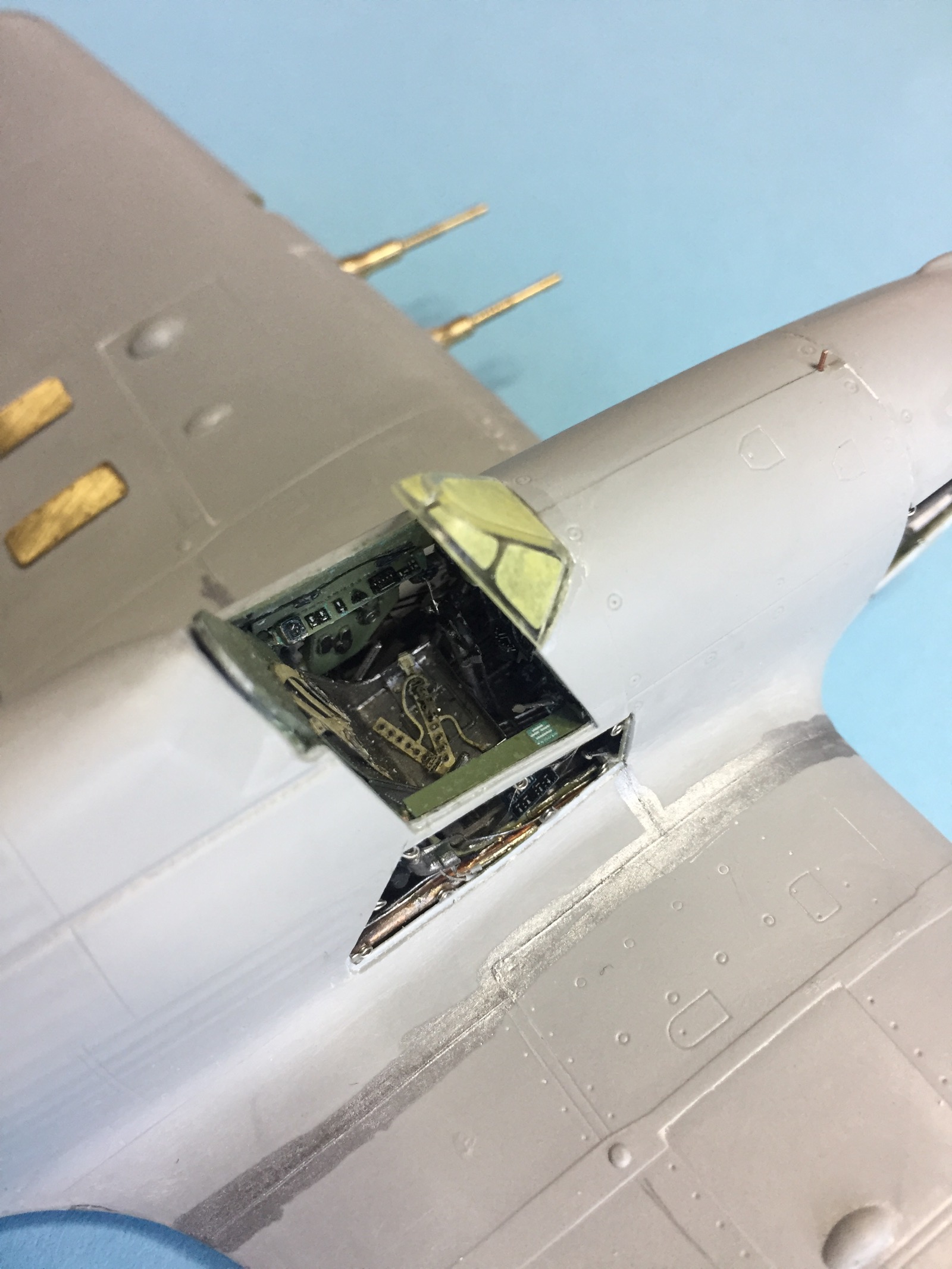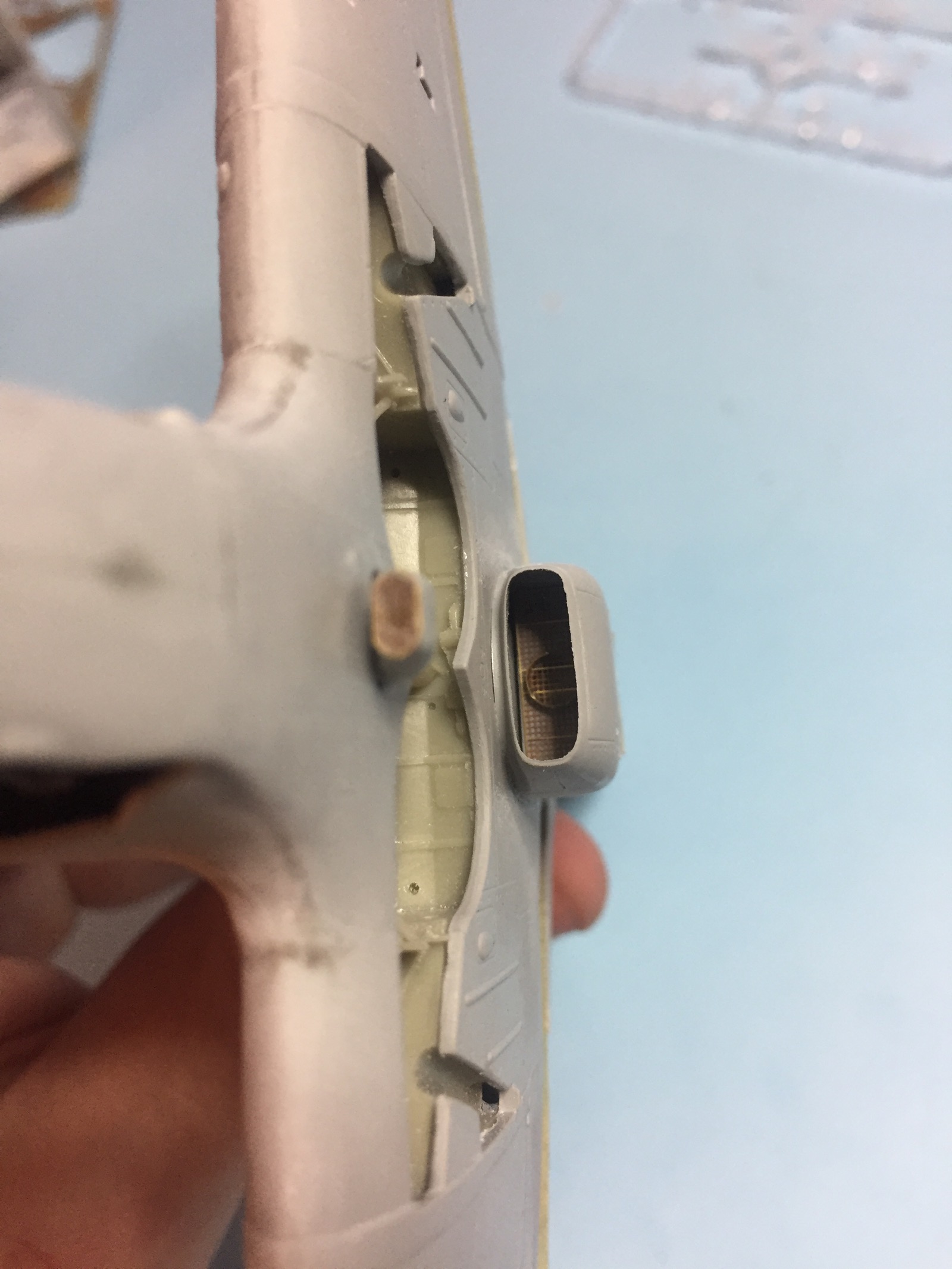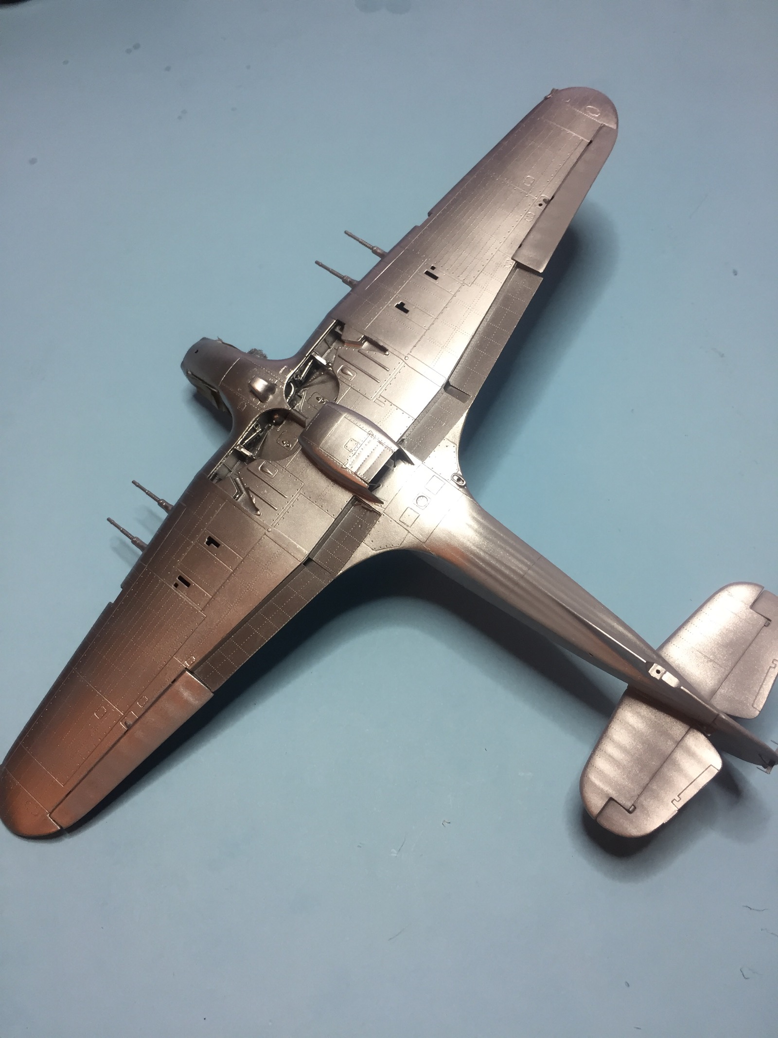 Небольшое обновление. Пока фото с телефона, позже выложу в нормальном качестве. Грунт и суперметаллик ганза. Теперь вопрос по нишам и внутренним поверхностям закрылков. У некоторых они в цвет металл, есть серые и зеленые. Хотелось бы точно знать, как они окрашивались.