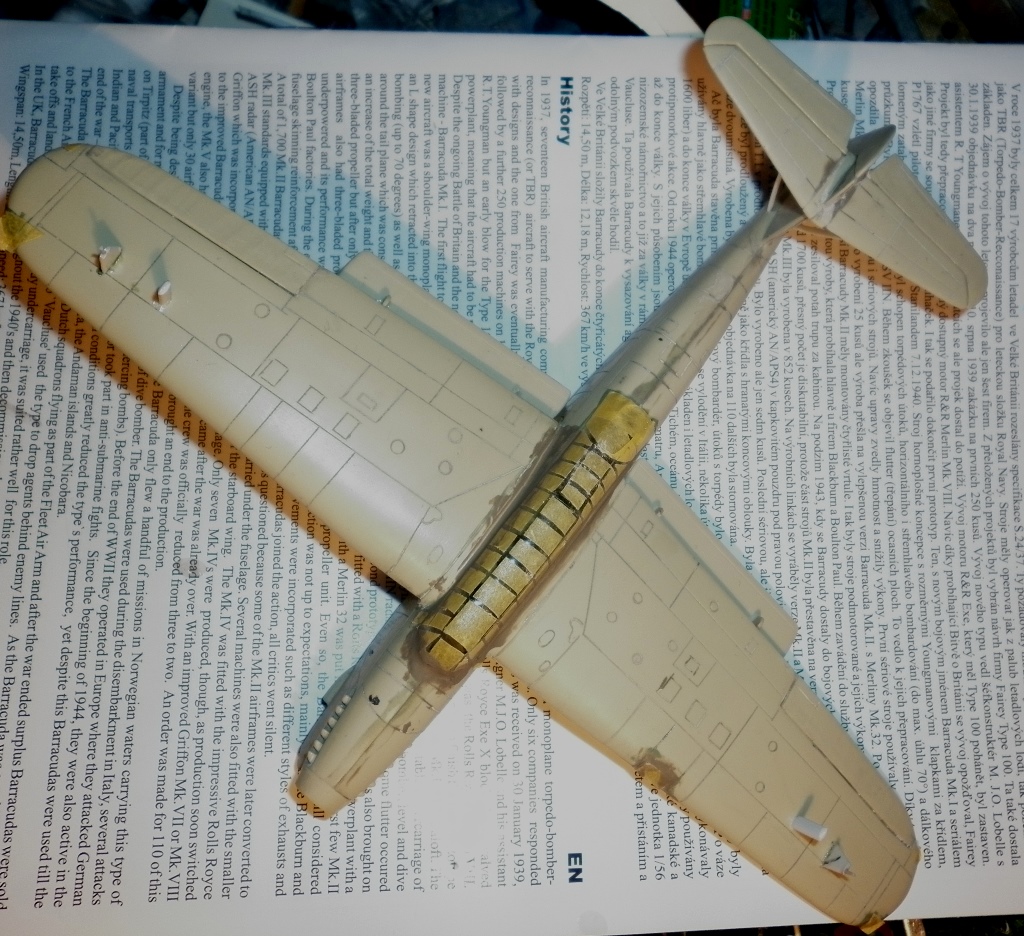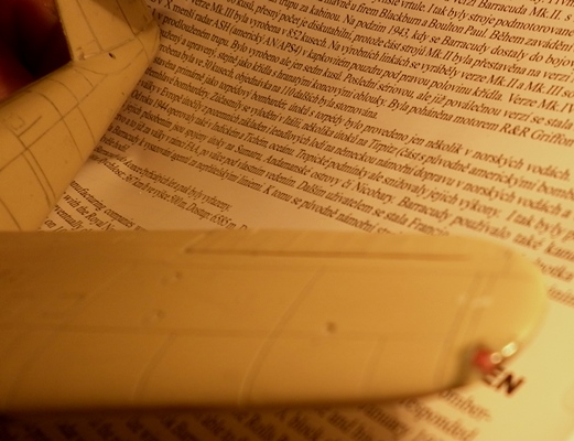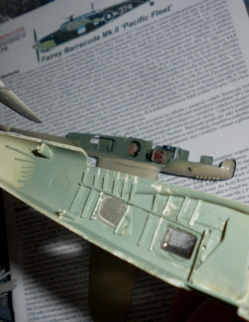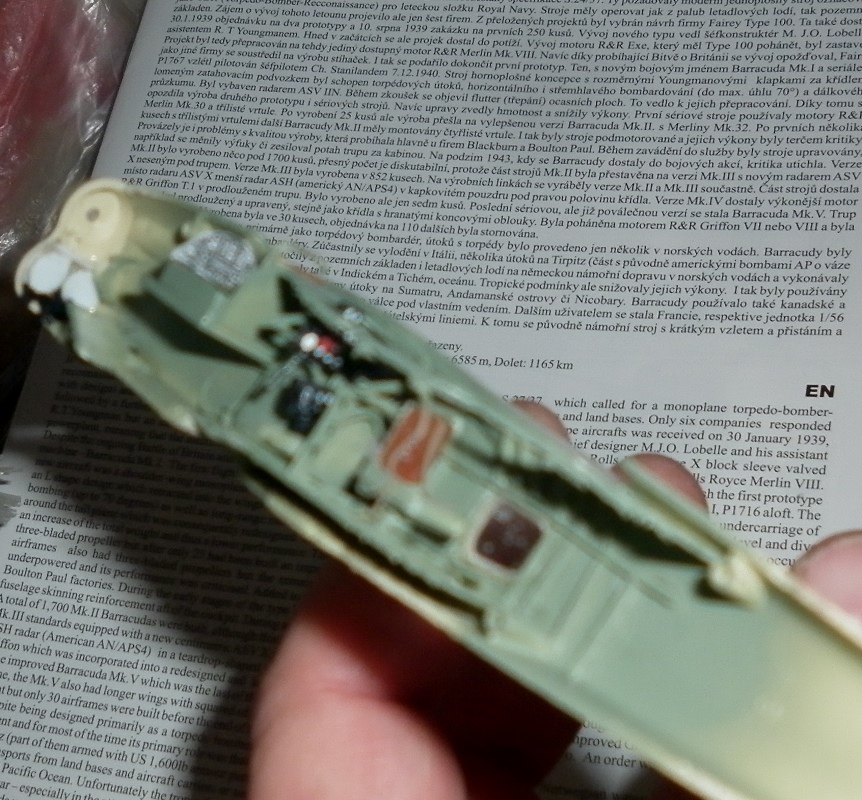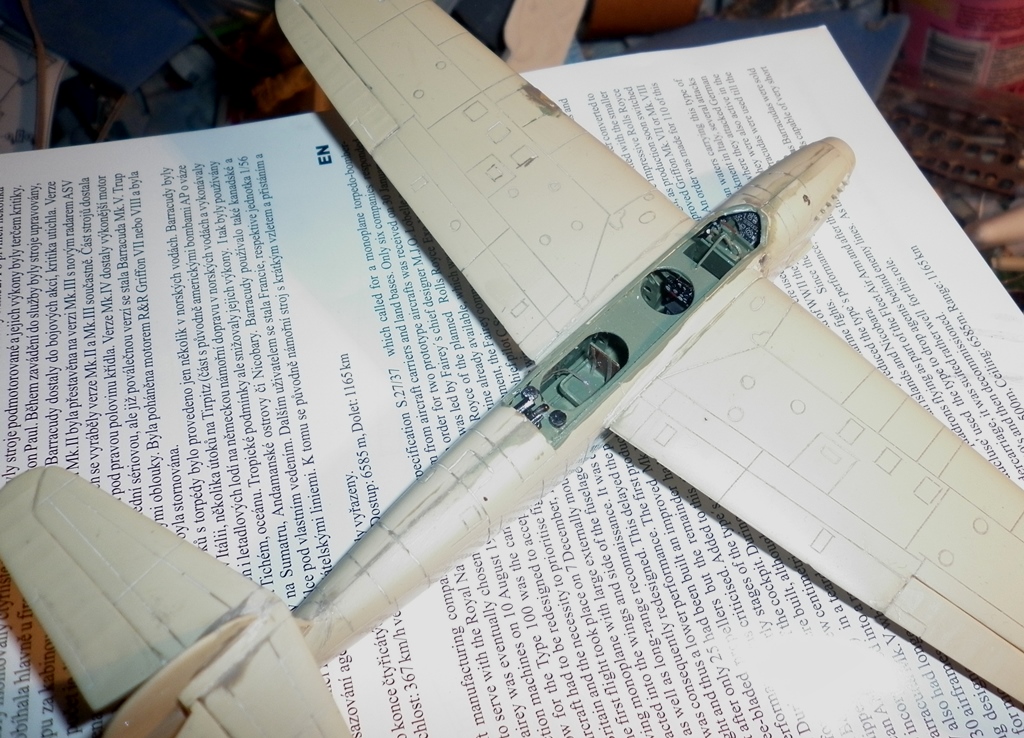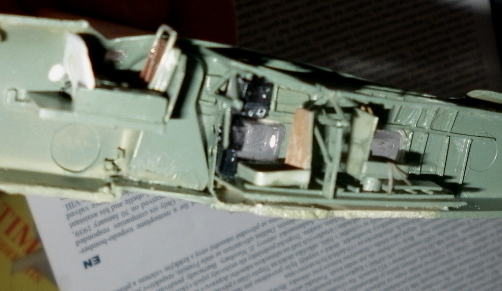 Трудностей со сборкой и нарезанием кроя не было. Пластик очень приятный в работе. Сохранность идеальная. Даже декаль не сильно пожелтела. Планирую ее покрыть лаком и использовать (декали больше 50 лет!). Приборная доска - уменьшенная ксерокопия с иконки продаваемой на Е-бее декали. Интерьер- сыростирол. Цвета - рекомендованные чехами. Будет использована торпеда из чешского набора - в том варианте окраски используются только бомбы. Радиаторы - сеточка от маслофильтра. БАНО- из прозрачного литника. Фонарь давленый, самодельный. Планирую открыть.