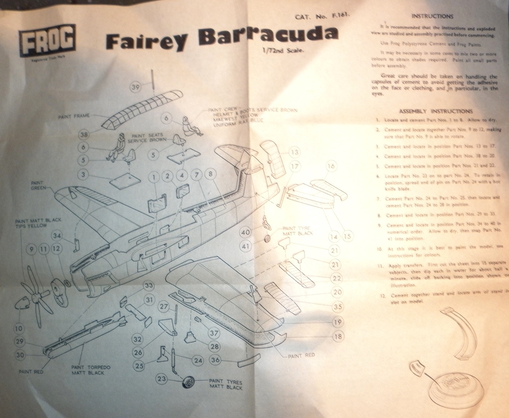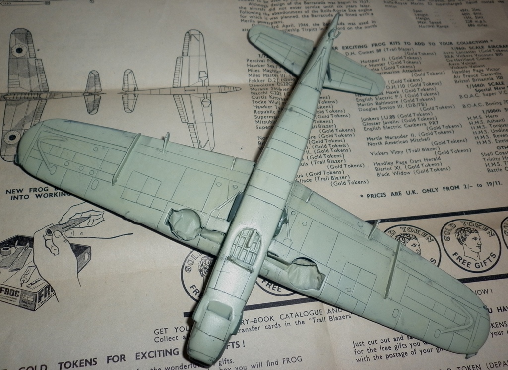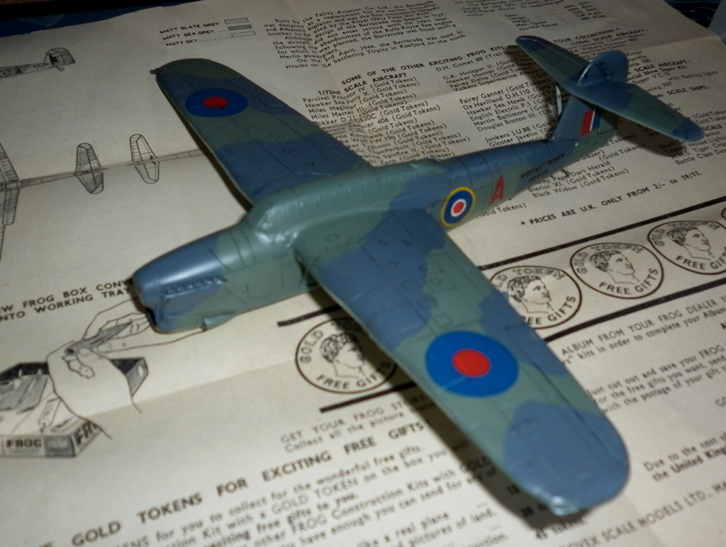 Добрый день, коллеги. скопилось некоторое количество моделей родной для советских моделистов британской фирмы ФРОГ. Грешно было бы не сделать. Итак, дано: модель выпуска 60х годов, судя по коробке. Задано : собрать модель без афтемаркета, по максимуму использовав родные детали и доведя по степени деталировки к модели от Спешиал хобби. В инете нашел фото прототипа. Придется добавить антенны на крыльях