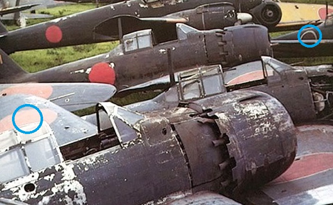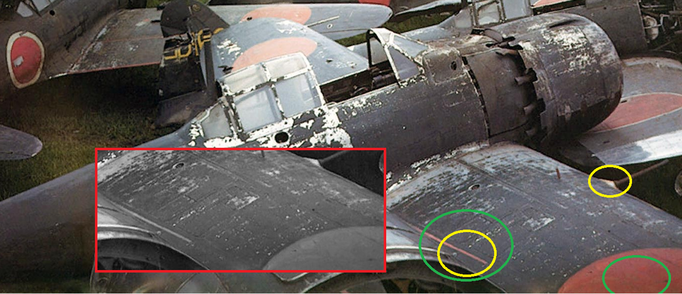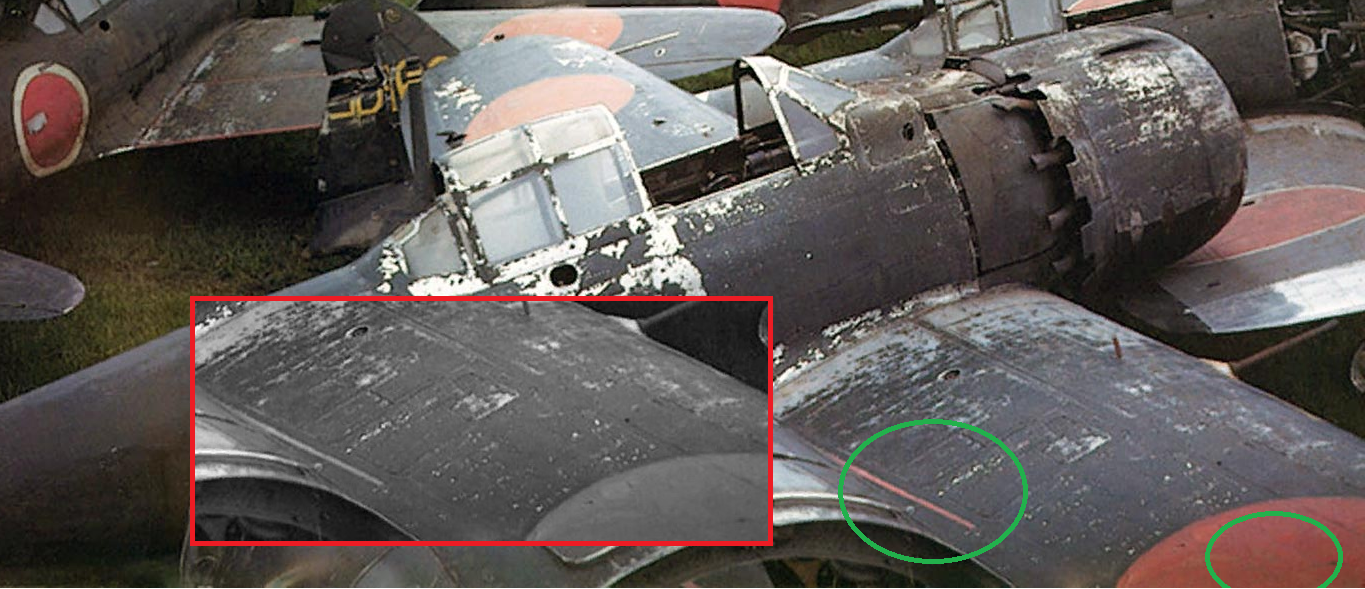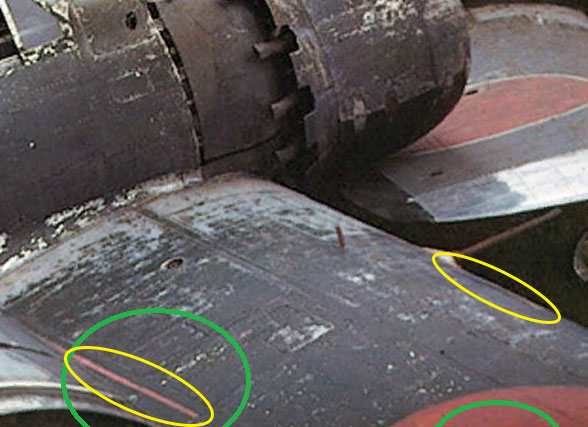 И хотя два фрагмента оттенков (хиномару на левом крыле и средняя часть полосы) совпадают, я всё же думаю, что цвет полосы не совпадает с цветом хиномару. Она (если не синяя) или выцветшая красная, или жёлто-оранжевая (как на передних кромках).