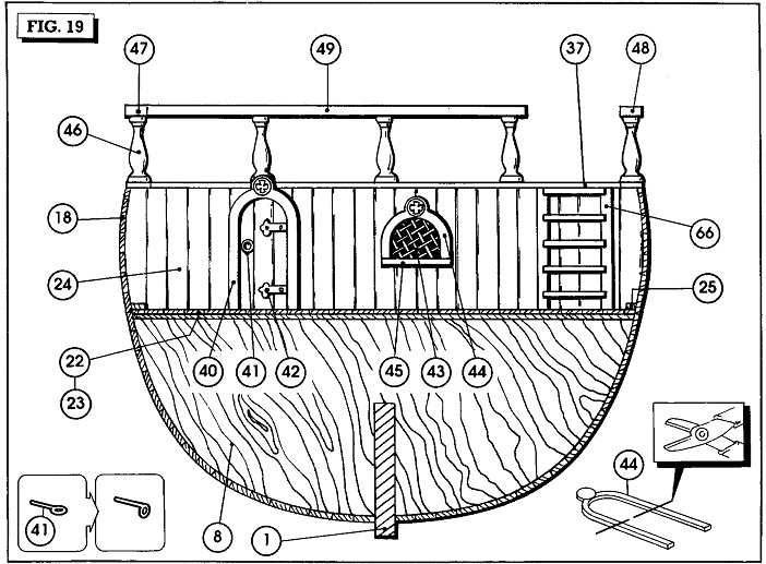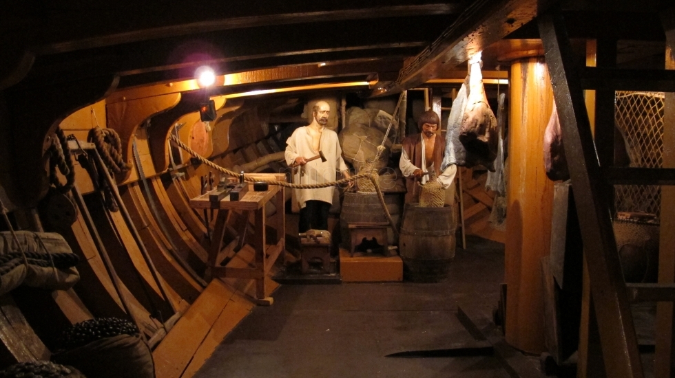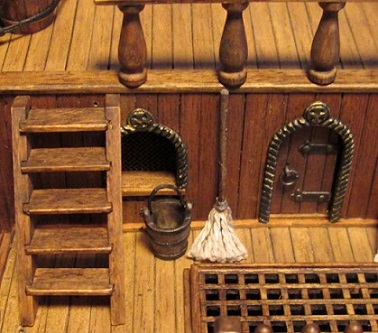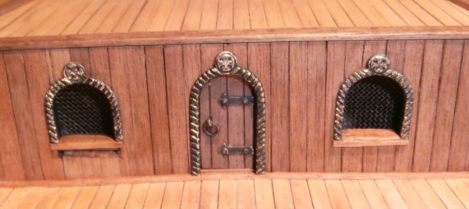 Согласно чертежам Amati взятым за основу корпуса модели: брашпиль в носовой части, грузовой люк не мешает, световой люк в близости от двери, но она открывается внутрь, мачта расположена достаточно далеко от переборки. Орудия всего два и они расположены по версии Amati на палубе.