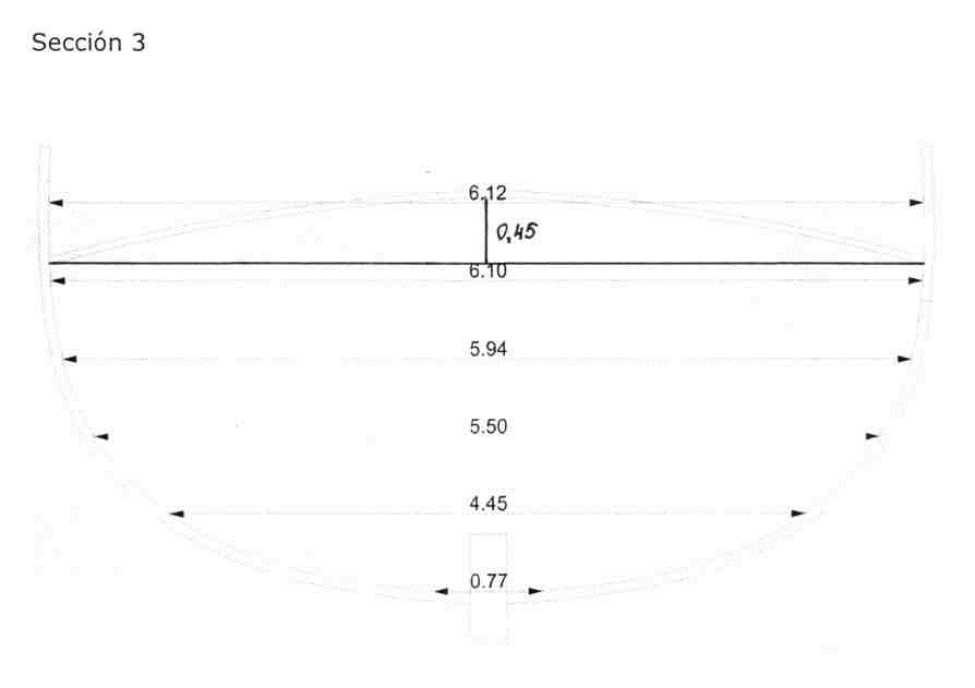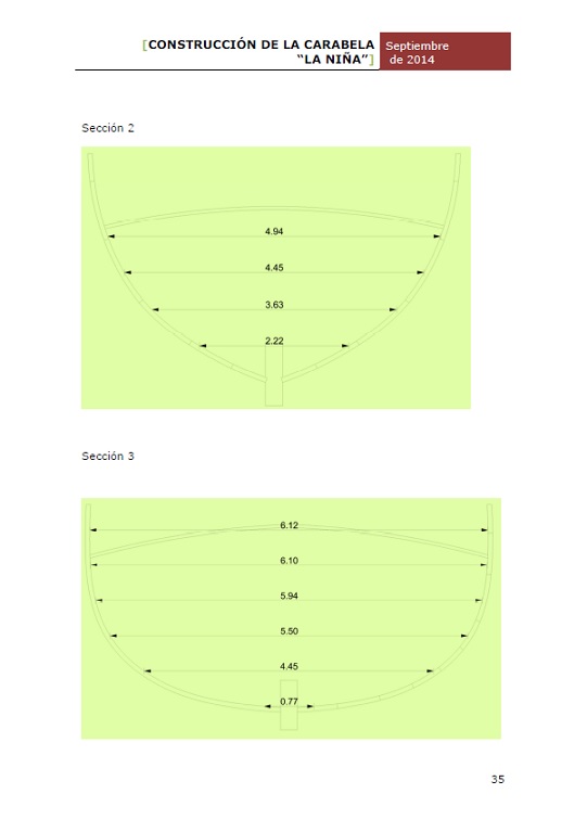 На 35 странице сего труда есть чертеж мидель шпангоута с крутой погибью палубы каравеллы (Seccion 3), размеры даны, как я понял, в метрах.