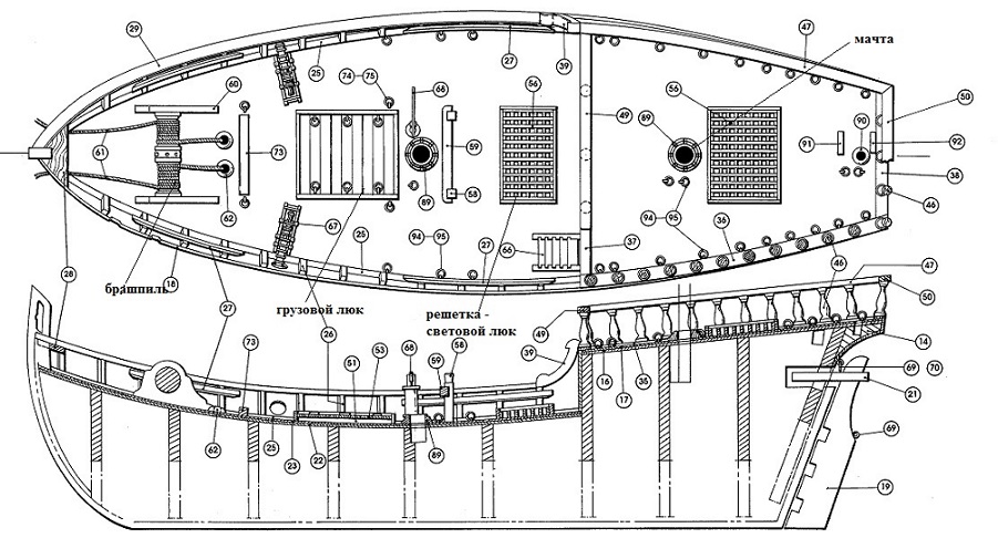 Кроме уже названого главного люка, где-то там, на главной палубе должен располагаться шпиль вокруг которого должно иметься достаточно места для движения матросов, при вращении шпиля...