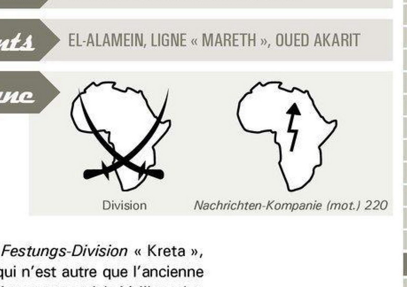 Ну вот тактические эмблемы немецких дивизий Арфиканского Корпуса. Подходит по очертаниям континента только 164th leichte Afrika Division, но на эмблеме перекрещенные сабли, а не свастика.