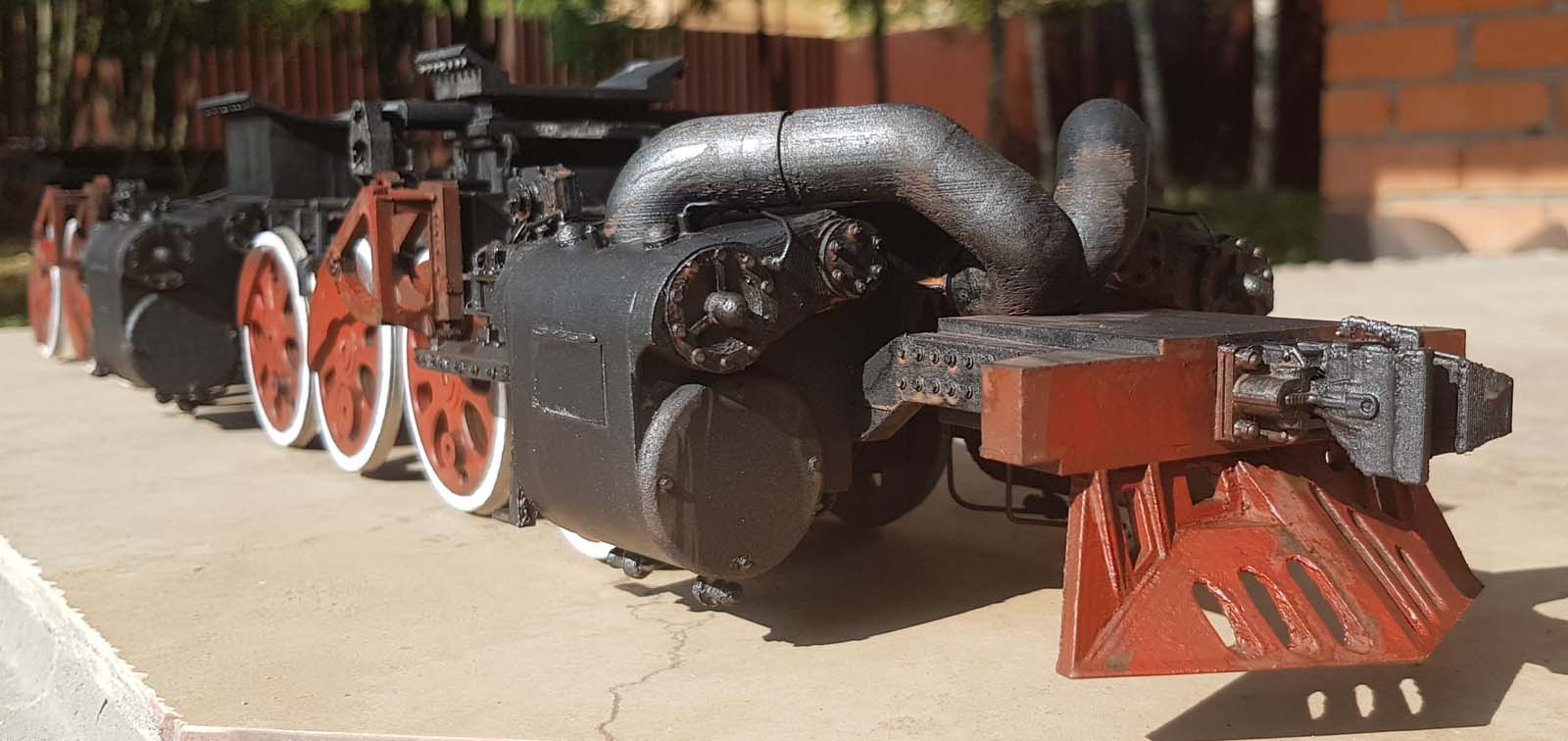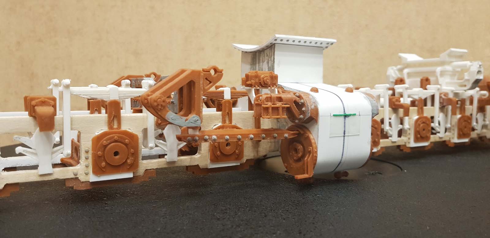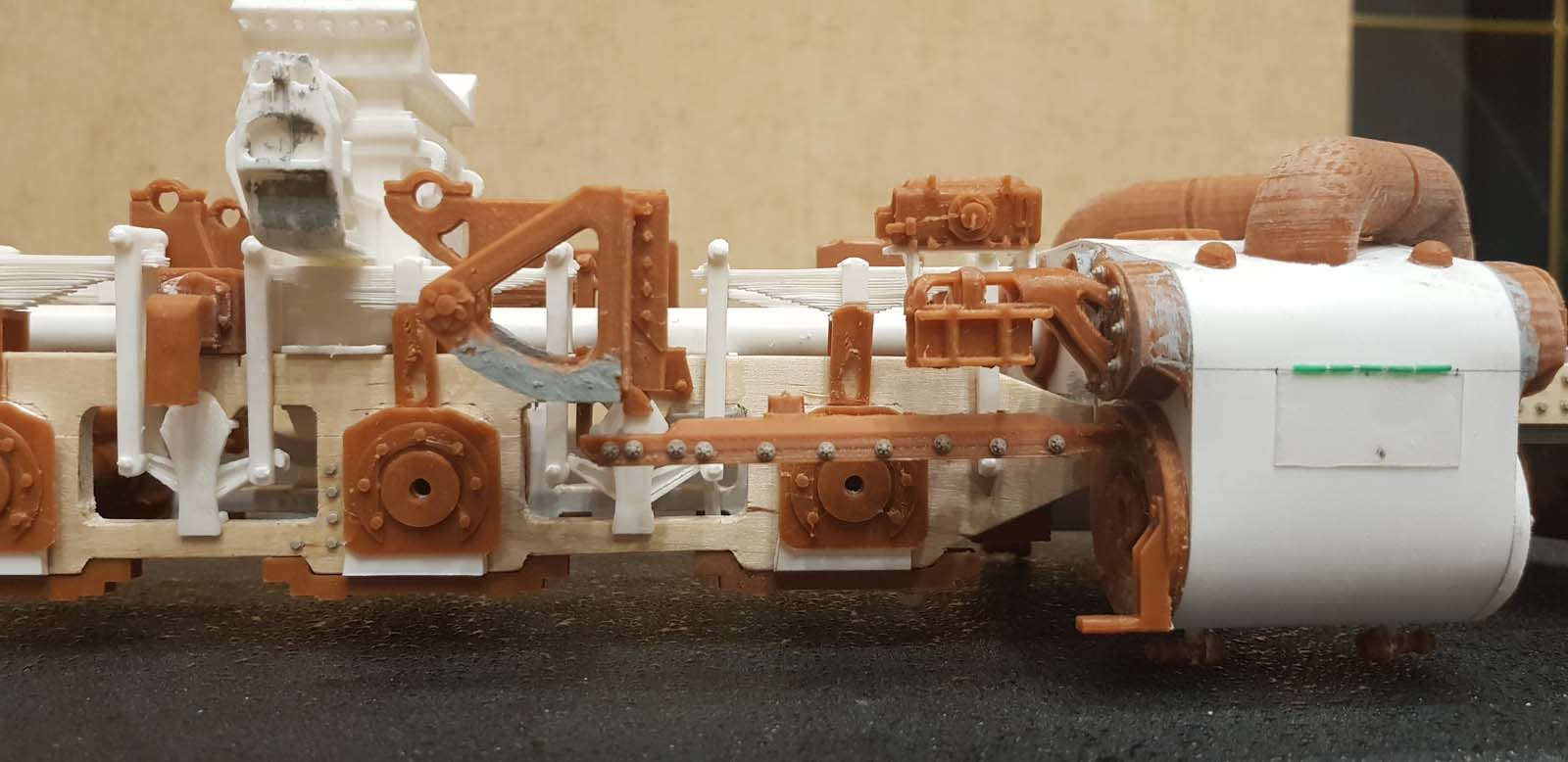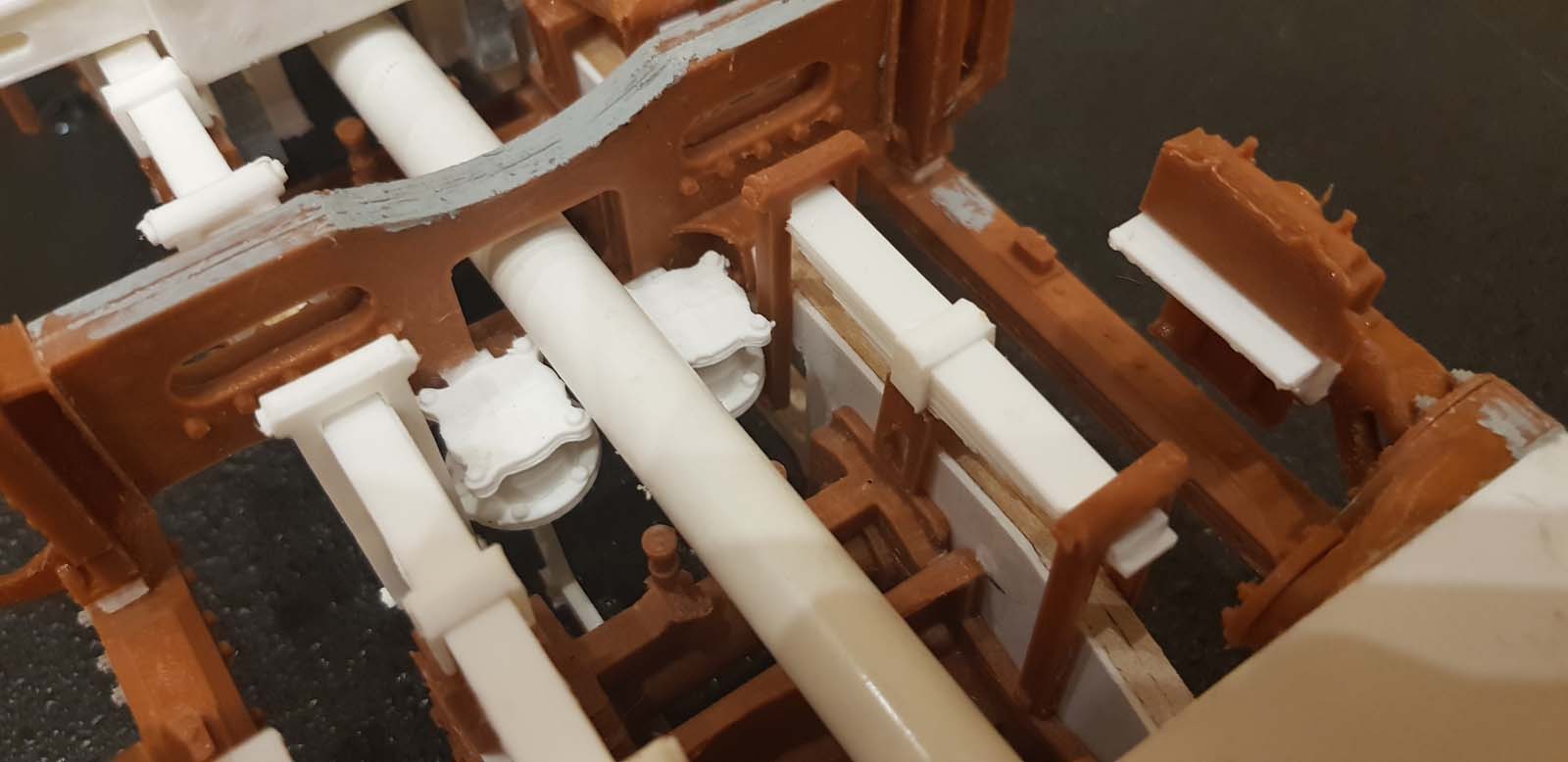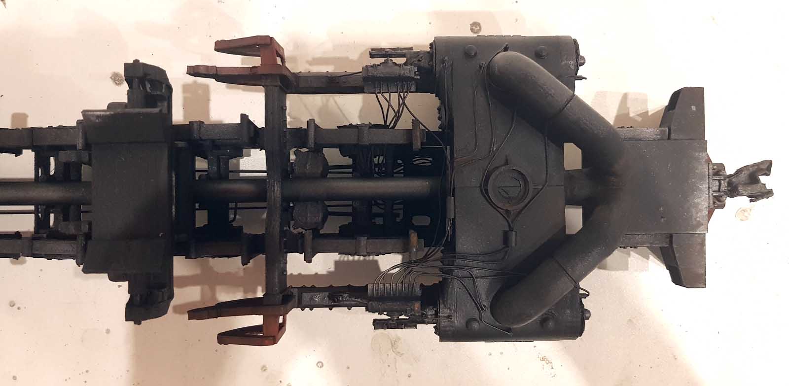 Доделал головной прожектор, установил магистрали подачи песка на переднюю машину, поставил дышла. Детально правый борт