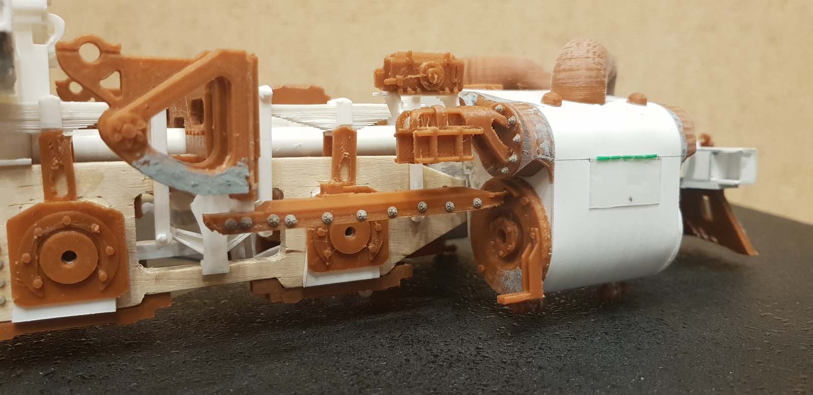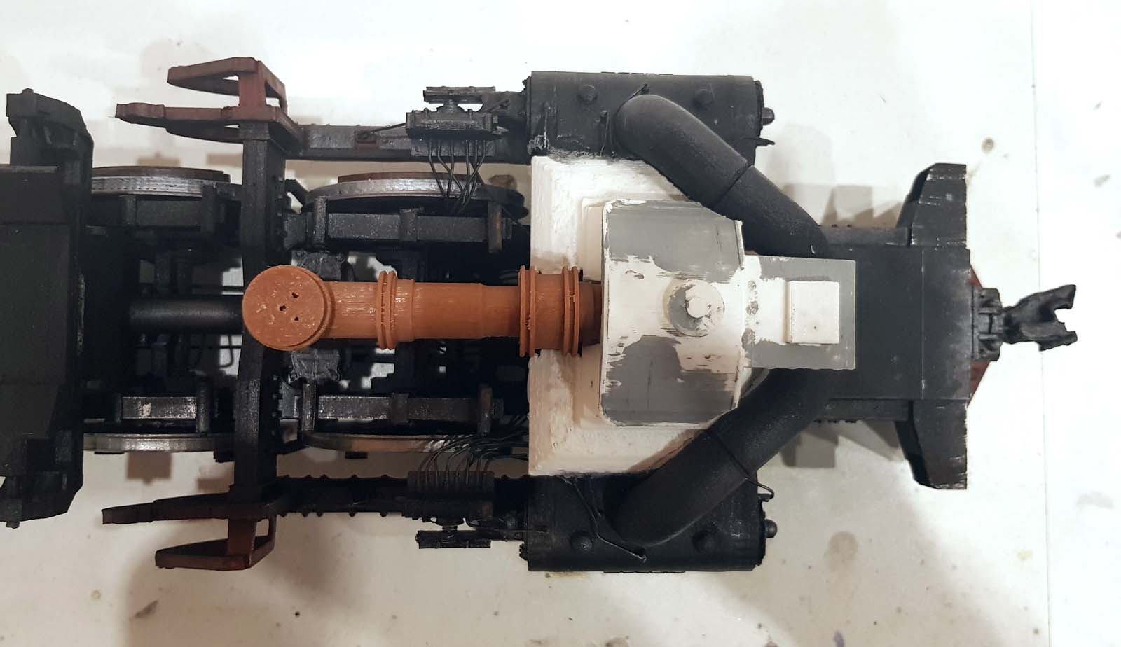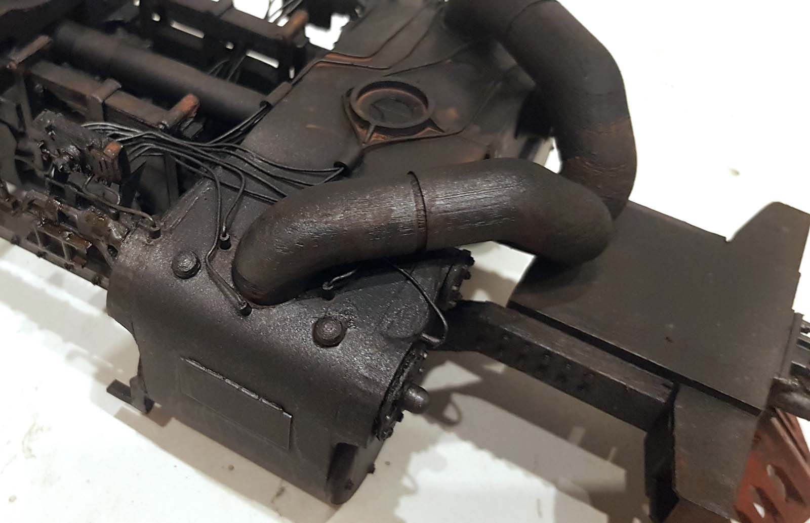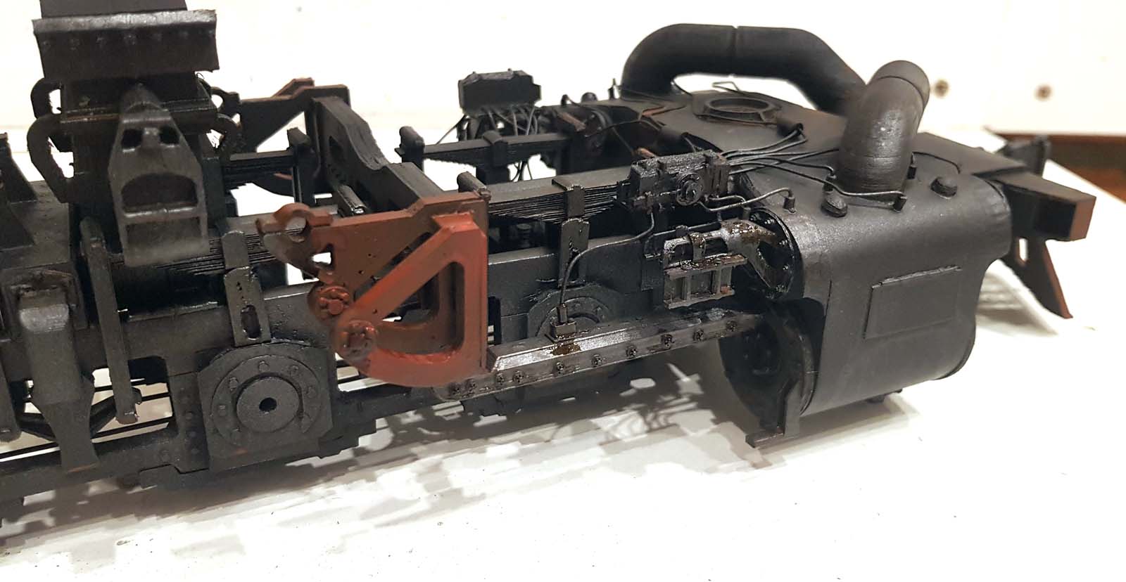 Доделал головной прожектор, установил магистрали подачи песка на переднюю машину, поставил дышла. Детально правый борт
