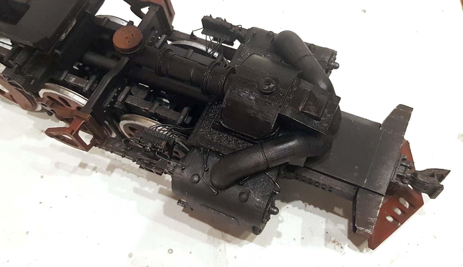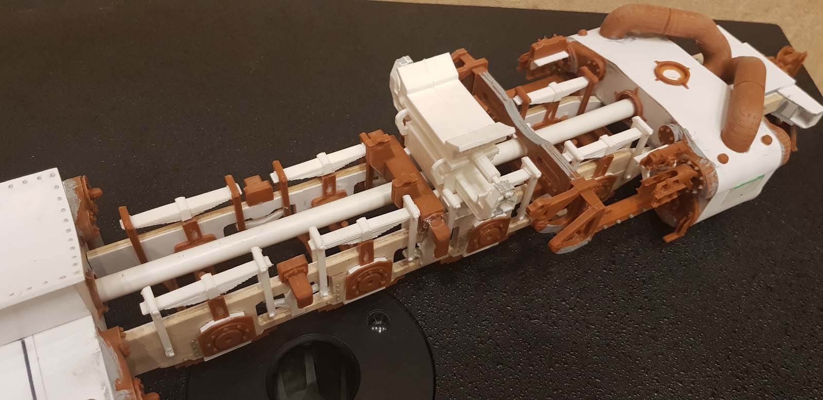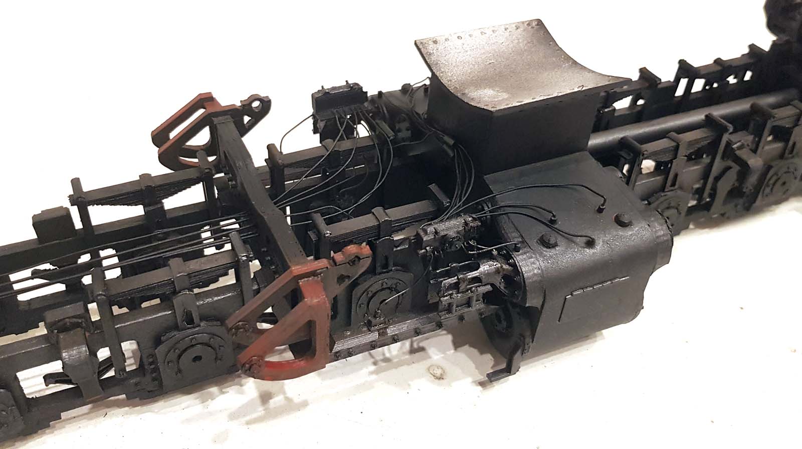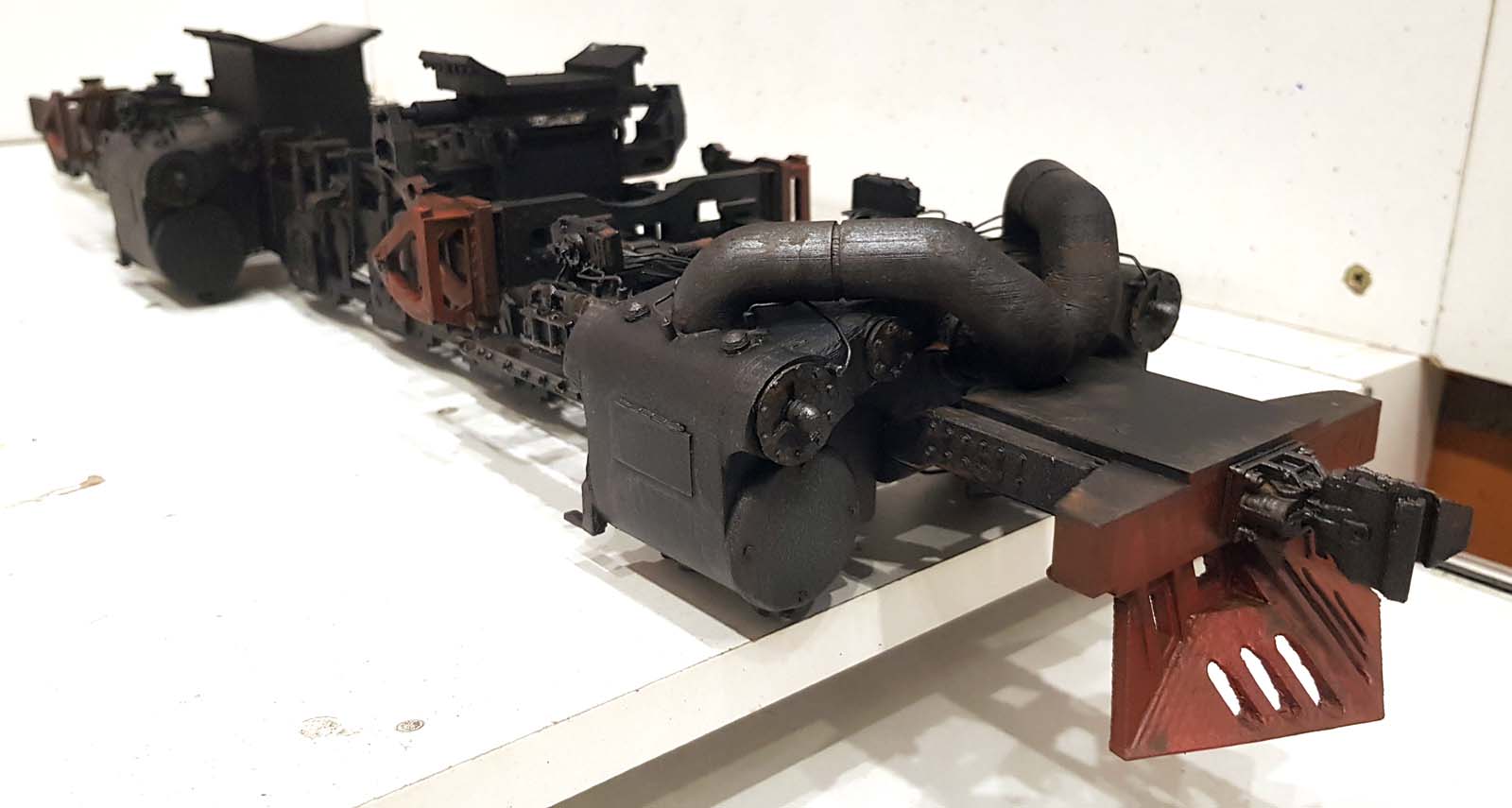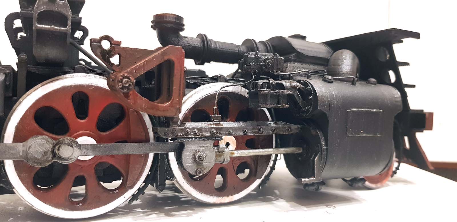 Доделал головной прожектор, установил магистрали подачи песка на переднюю машину, поставил дышла. Детально правый борт