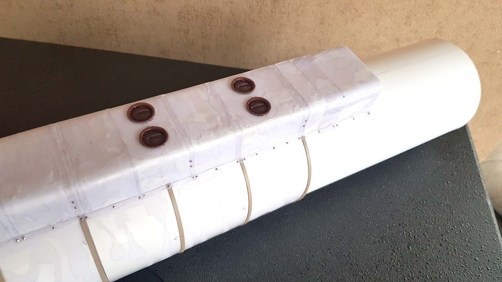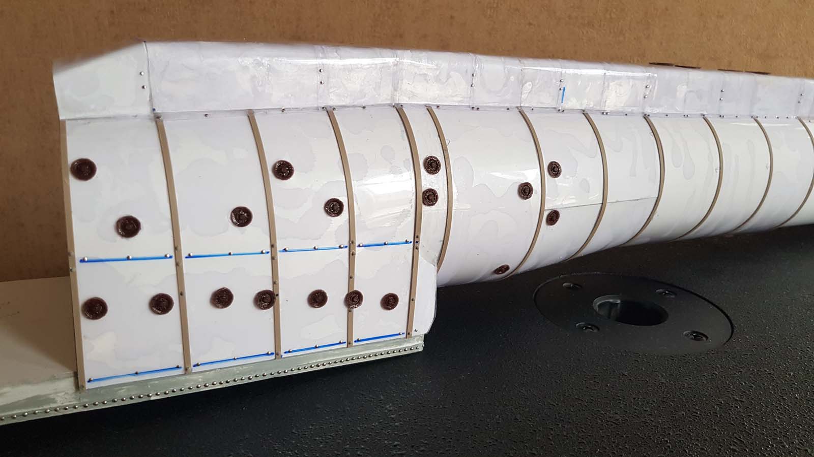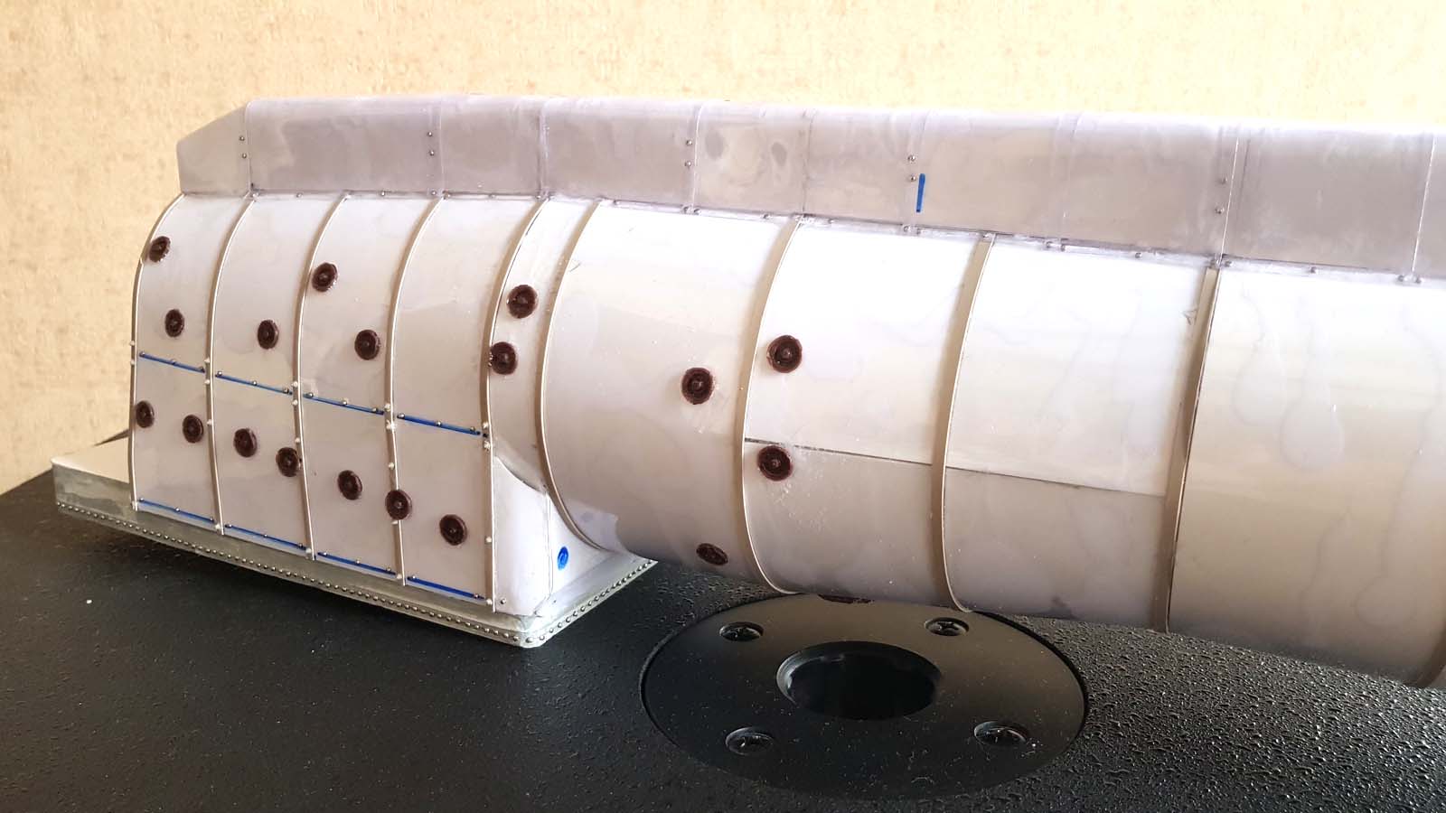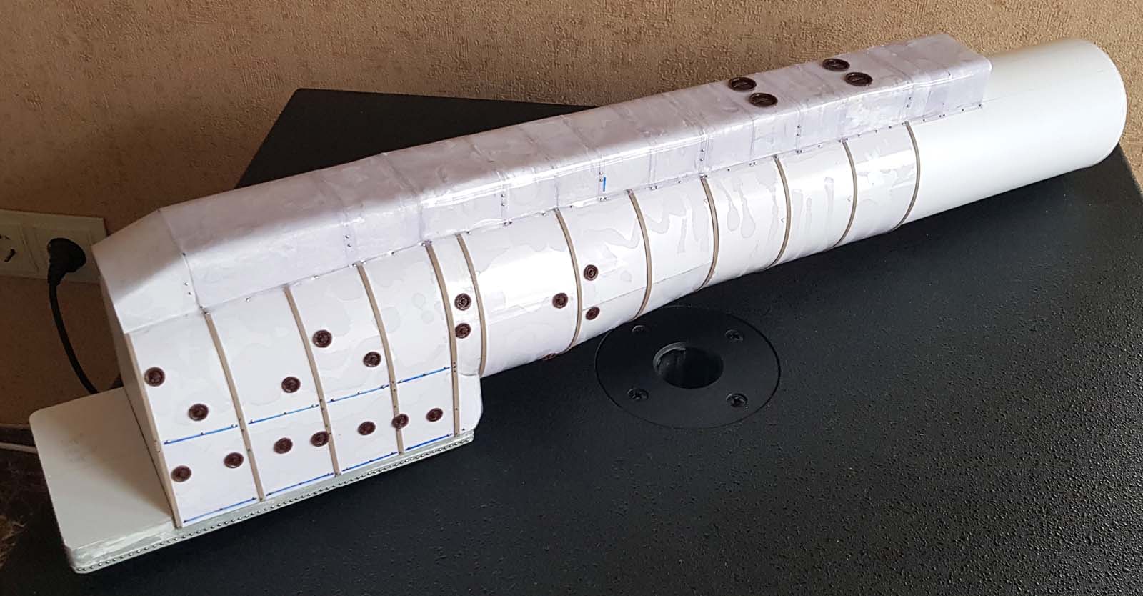 Частично сделанный обтекатель. Печатал его на принтере из 11 частей. Сам удивлен, что сошлось почти без швов