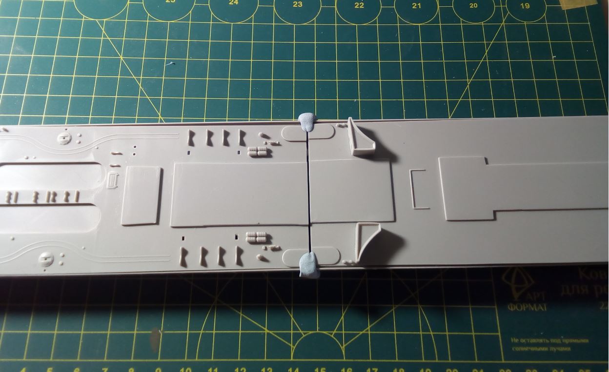 Щель между двумя частями палубы полностью закроют надстройки, сильно шпаклевать не надо, но я подклеил снизу кусок пластика для прочности. И кажется там с длиной палубы не всё в порядке, посмотри внимательно.