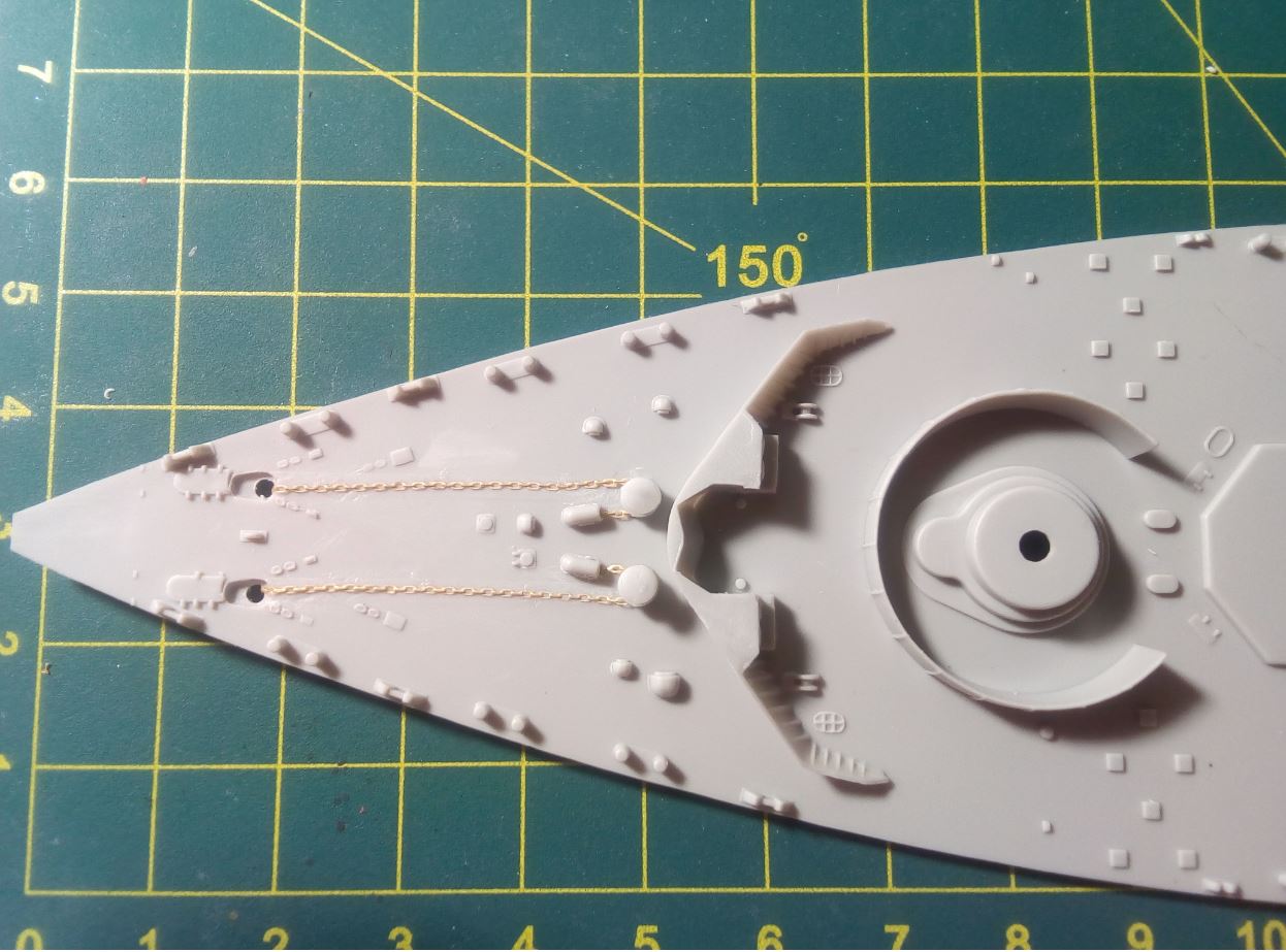 С пластиковой детали удалил отливку якорных цепей, чтобы вместо нее установить цепи из фототравления, для чего рассверлил клюзы на палубе