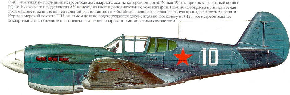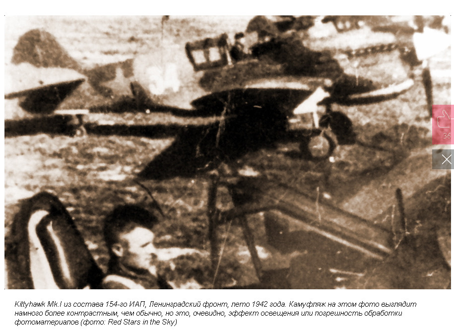 Есть информация, что арктическим конвоем поступили из Британии "Киттихауки" Мк.1 (они же Р-40Е-1), которые теоретически должны отличаться от Р-40Е изогнутой трубкой пито и прицелом... Но - есть фото британских машин с пито американского образца! И не видел ни одного фото "британца" в СССР. К тому же их поступило мало.и скорее всего до Карелии они не дошли, а переданы там же в состав СФ, или ПВО Мурманска. Во всяком случае среди нескольких известных самолетов полка (фото прилагаю) - перечисленных признаков не видно, т.е. предполагаю, что самолет шел через Иран.