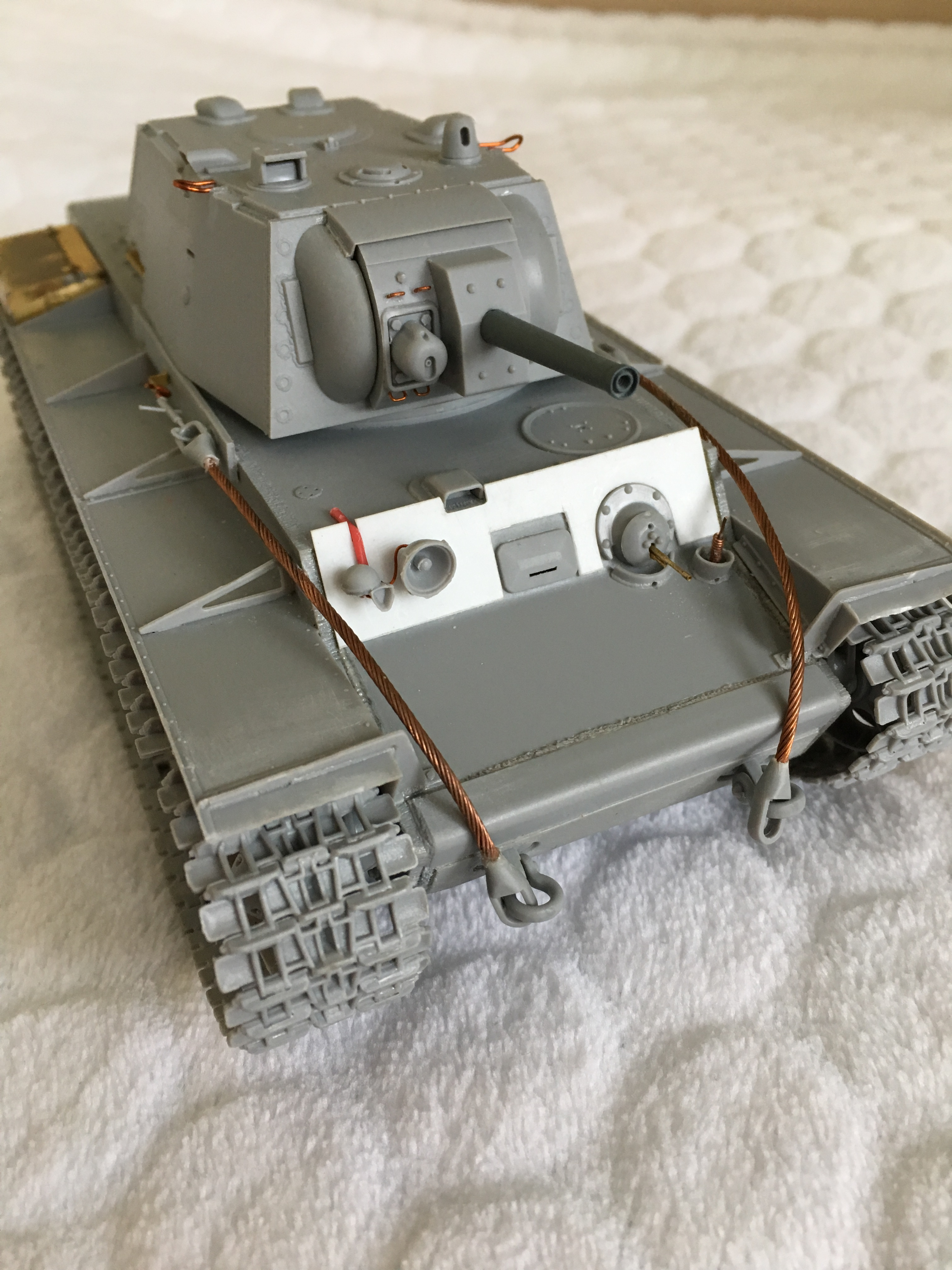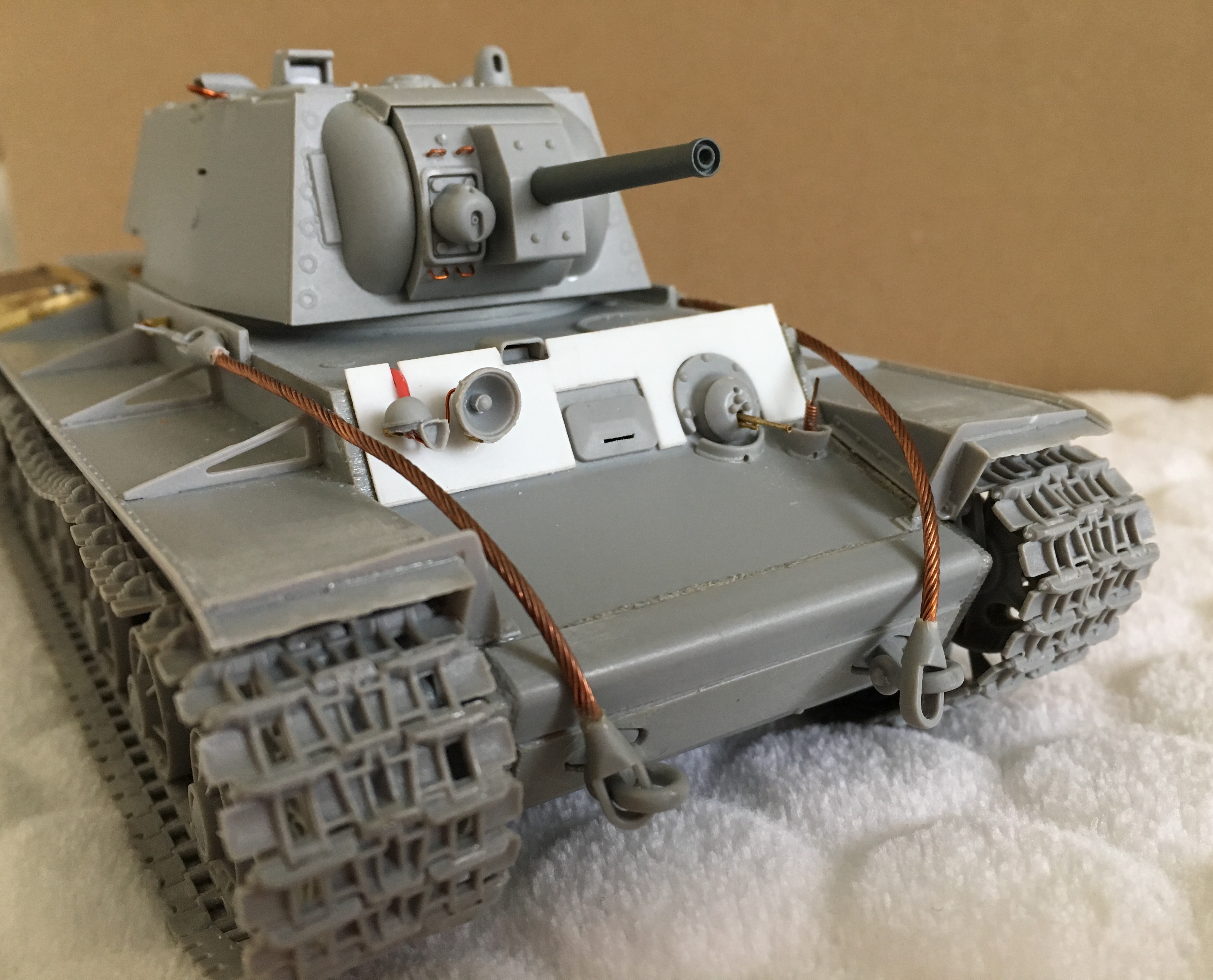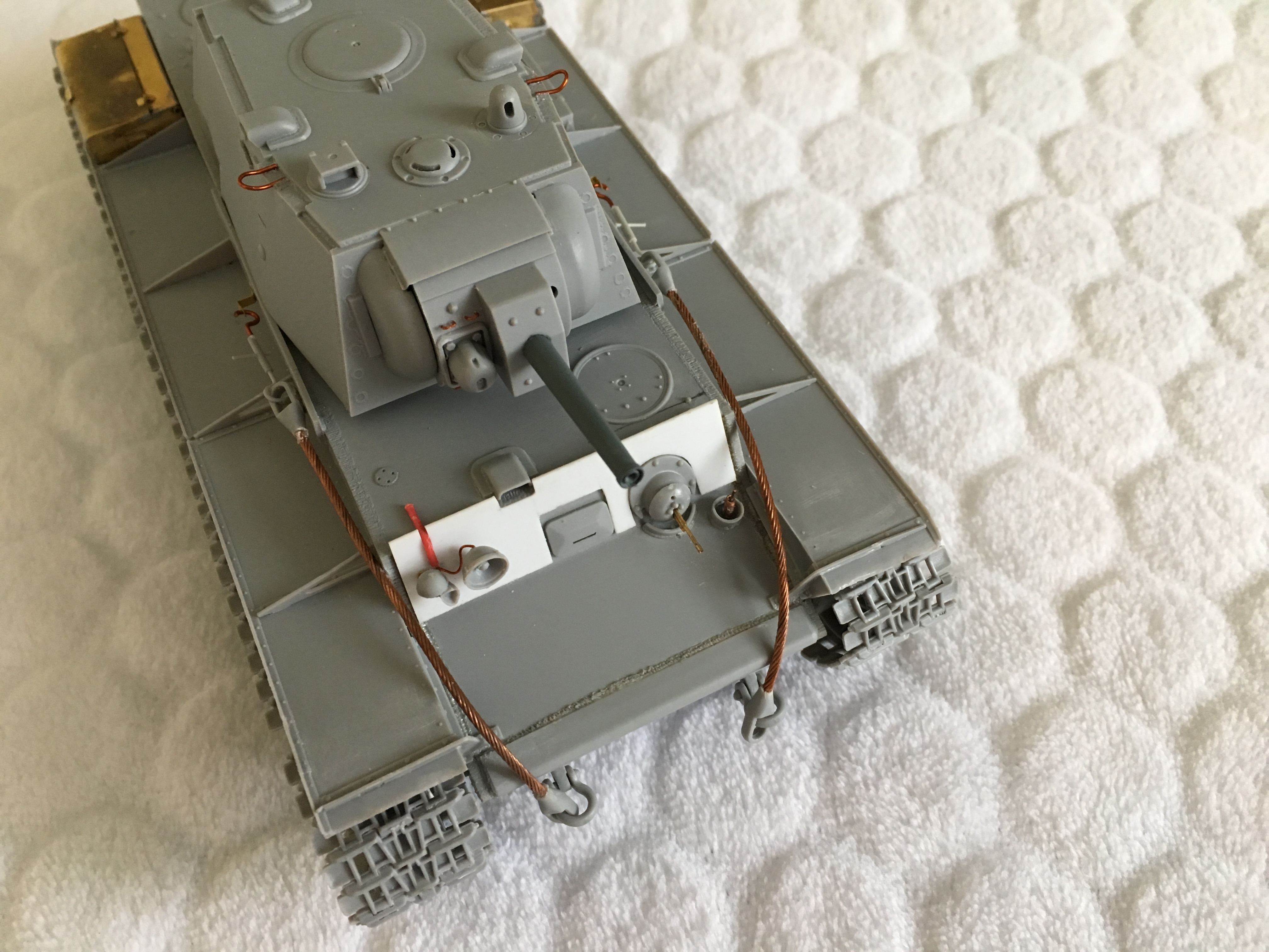 Сделал отверстия для стоков воды в чашах пулемета и антенны и петли на маске орудия, так же вклеил фару и сигнал с проводкой. Осталось закруглить крепление буксировочных рым.