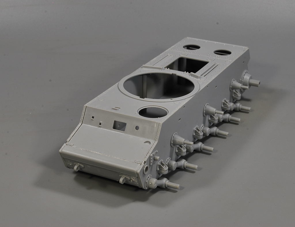 На данный момент частично собран корпус, с балансирами и редукторами, выполнена имитация резки листов металла с торцов и сварные швы (за исключением передней части).