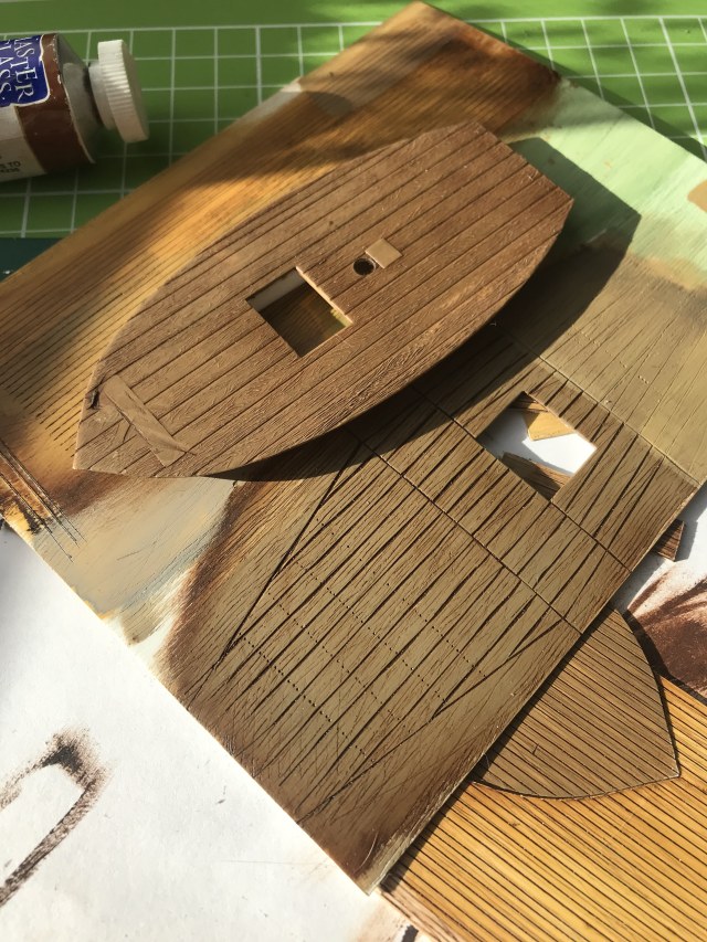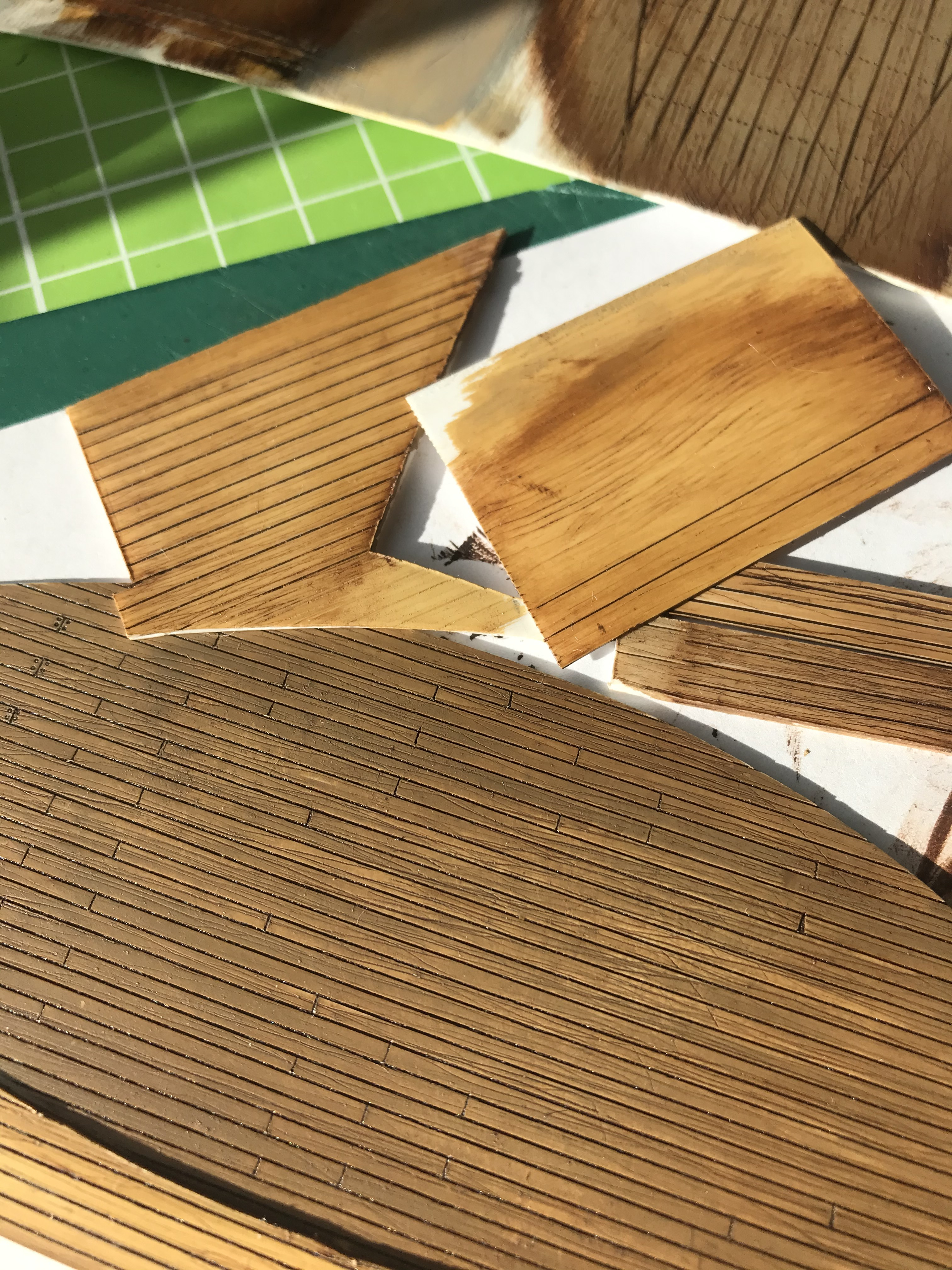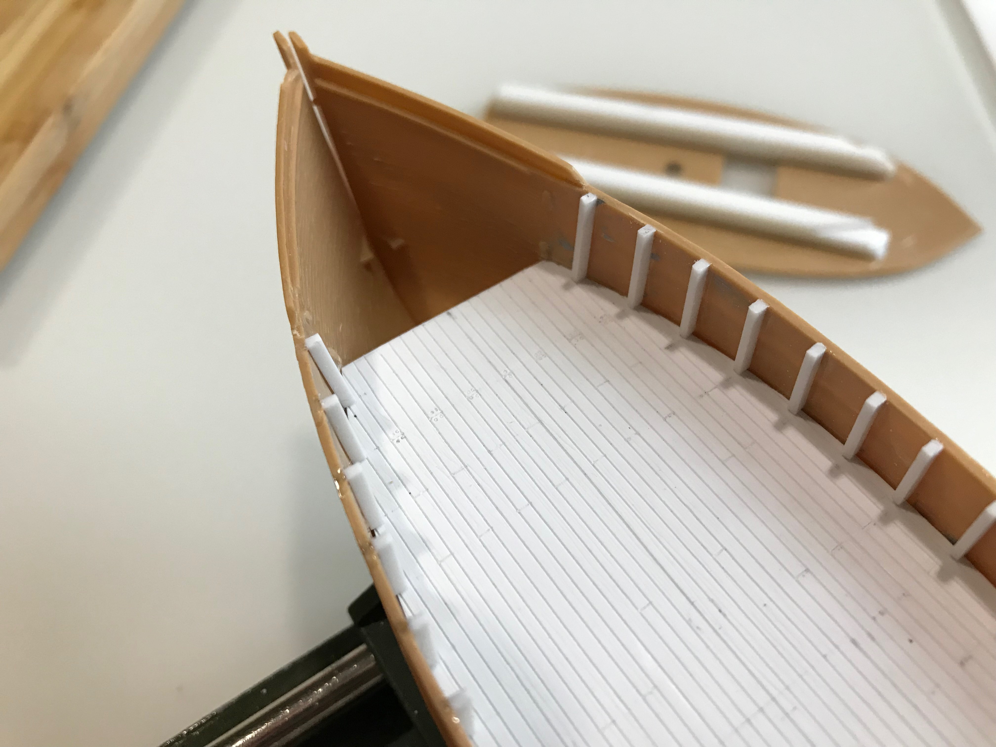 Изучение фоток сразу выявило немасштабность палубной доски - уж больно она на модели широкая - почти 4 мм. На всех фотках доски узкие - в пересчете на масштаб примерно 1,5мм. Значит что? Правильно - делаем новую палубу, благо пластик есть.