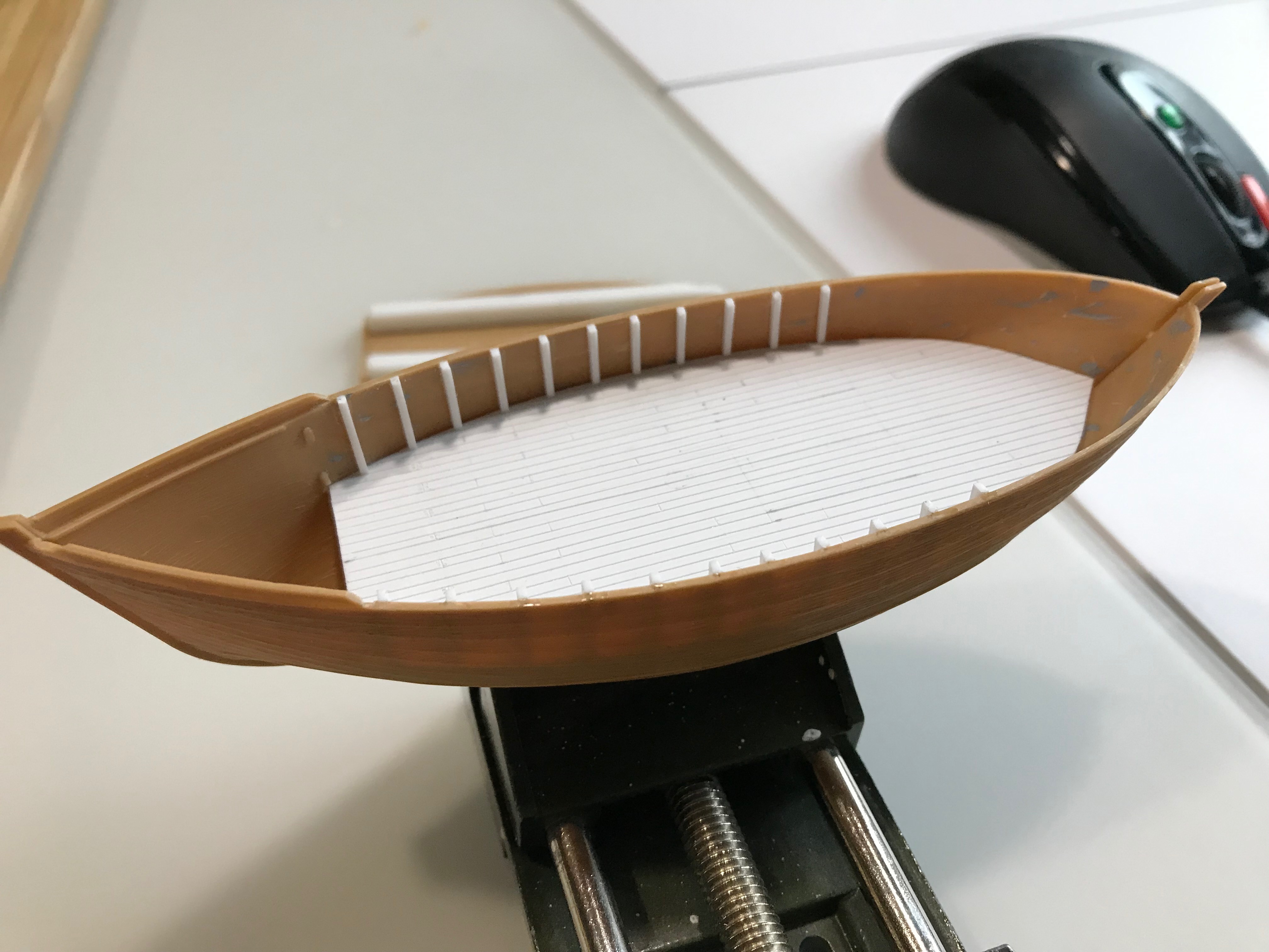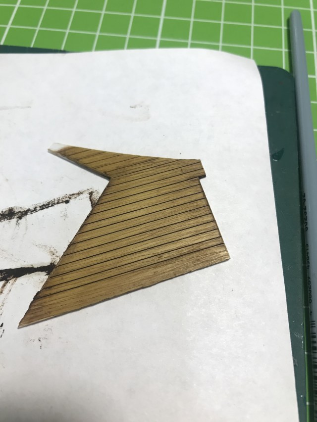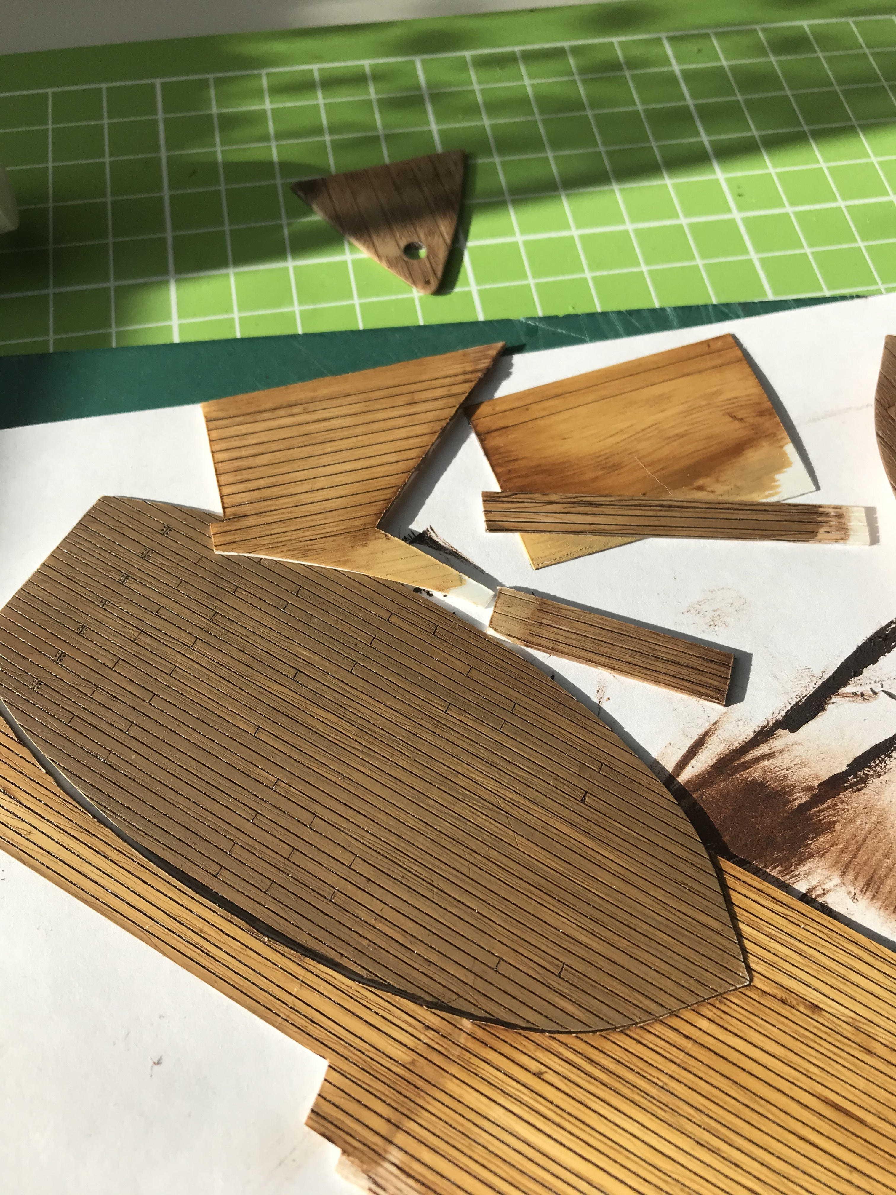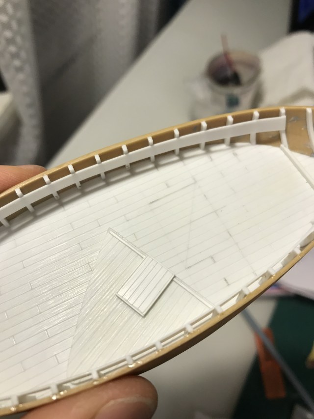 Изучение фоток сразу выявило немасштабность палубной доски - уж больно она на модели широкая - почти 4 мм. На всех фотках доски узкие - в пересчете на масштаб примерно 1,5мм. Значит что? Правильно - делаем новую палубу, благо пластик есть.