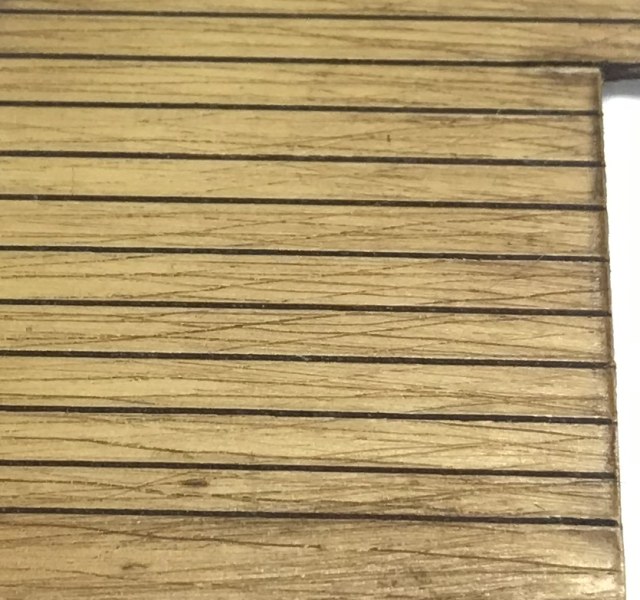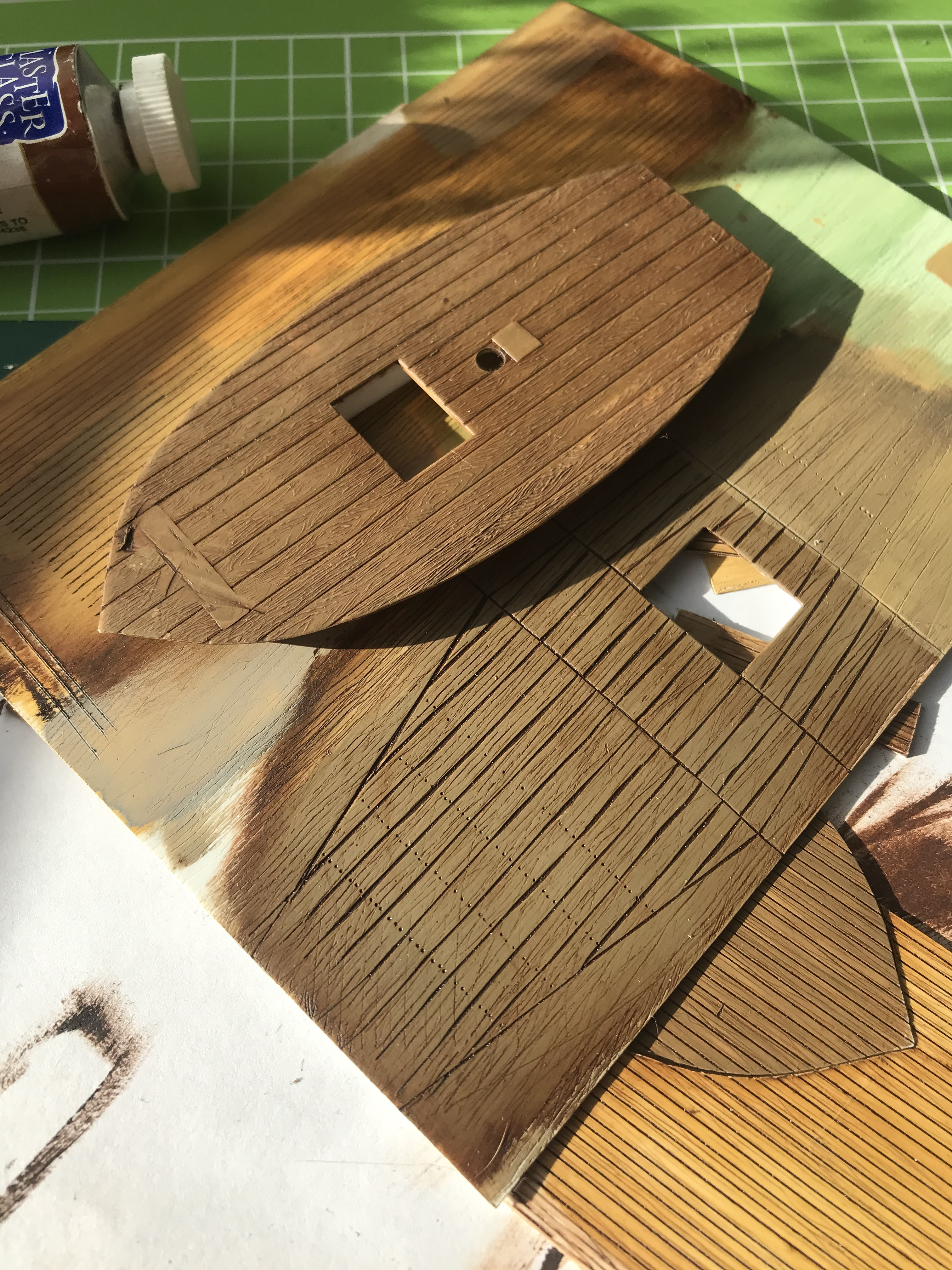 Ну и сделал новую палубу для которой сначала пришлось делать скрайбер для расшивки из куска полотна по металлу. Сначала сымитировал на куске пластика рисунок дерева, а затем "расшил" пластик под доски шириной 1,5мм. Потом уже по шаблону (по родной хеллеровской палубе, которая сидит на модели, как влитая) вырезал новую палубу и вот тут меня ждало разочарование номер 1! Оказывается, у этой теплой ламповой модели палуба не симметрична и я, получается, вырезал палубу зеркально. Сначала не мог понять в чем дело - складываю 2 палубы "доски к доскам" - абсолютно одинаковые! Но родная на модели сидит, как влитая, а моя - с зазорами О_о Вот уж где я подставы-то и не ожидал
