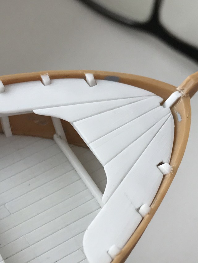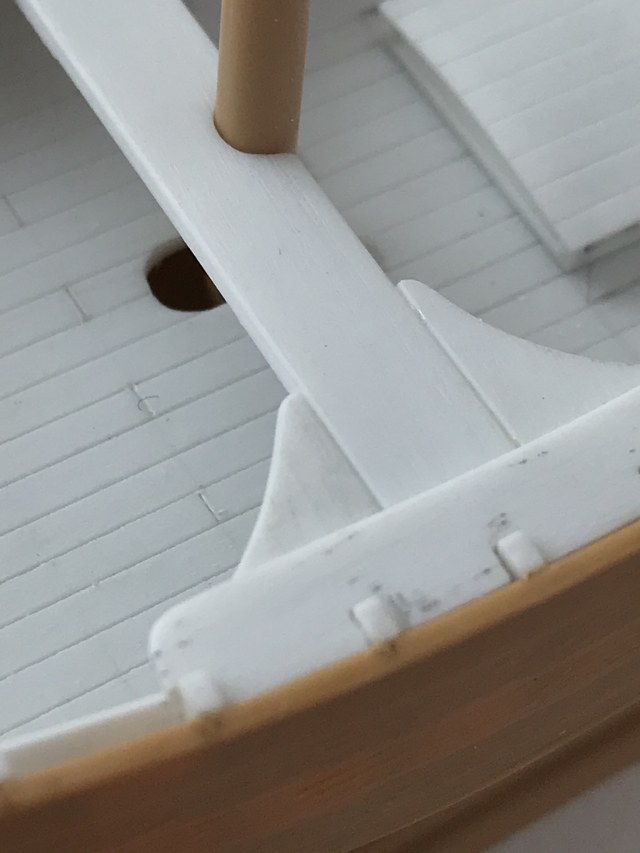 По фото: тут видно, что промахнулся с отверстием под мачту, но этого косяка не будет видно, т.к. основание мачты закрывается П-образной коробкой, которая всё скроет. Палуба бака не вклеена, мачты и прочие элементы - аналогично