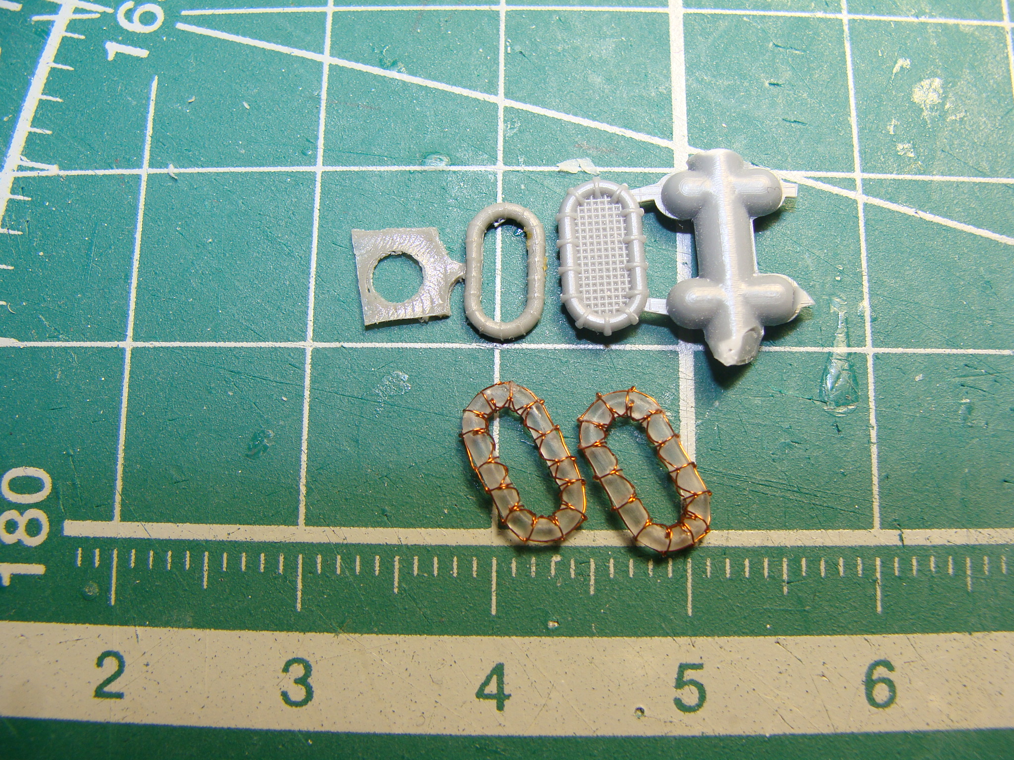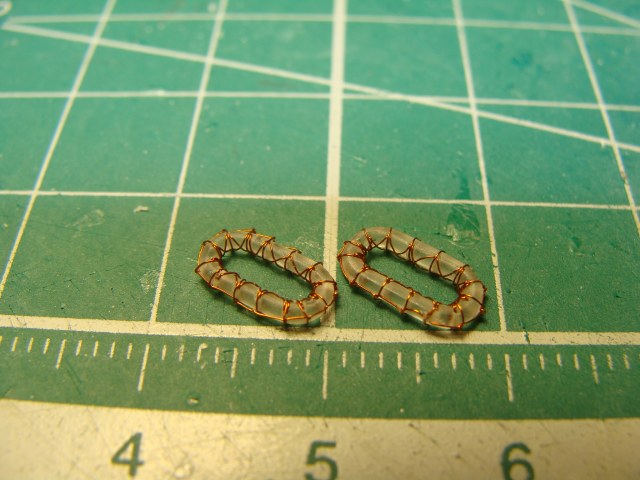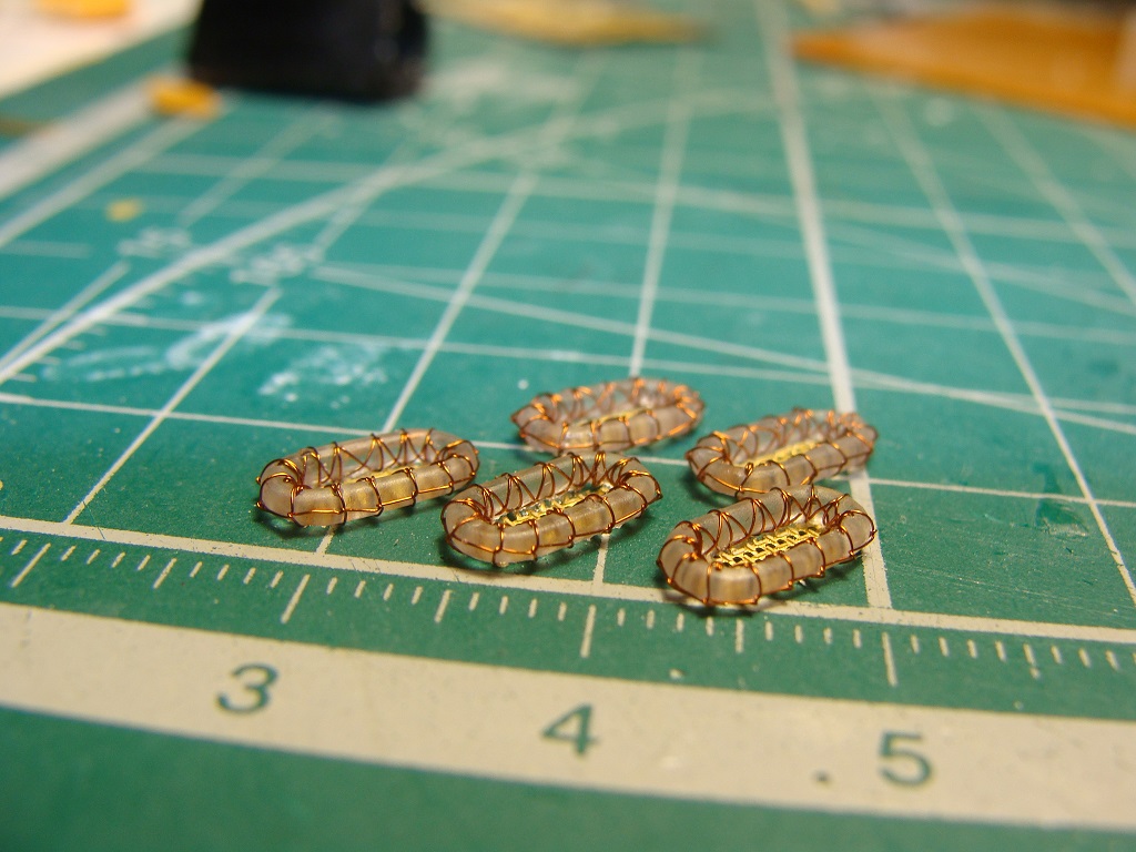 Решено было делать с нуля мастер-модель и пробовать отливать в резинку из смолы.Сам бублик выпилен из 1.2мм оргахи ,засверлен 0.25 сверлом и обвязан 0.08 медной проволокой, сразу скажу идея не моя а подсмотрена у голландского моделиста Яна Фоета при его изготовление больших плотов для Худа.На первой фотографии как-раз все три варианта...Тамия,Флайхок..и моё скромное творение....