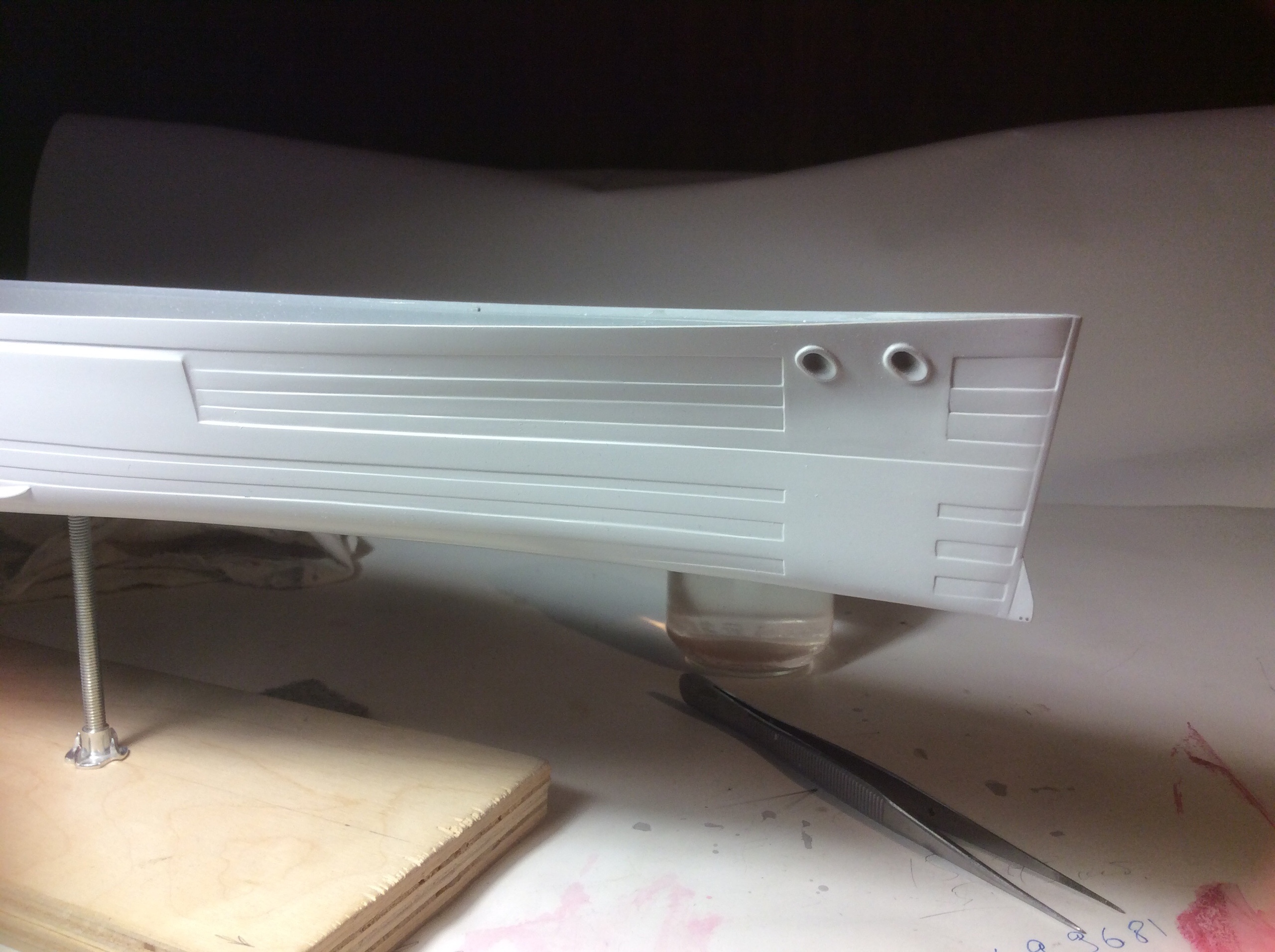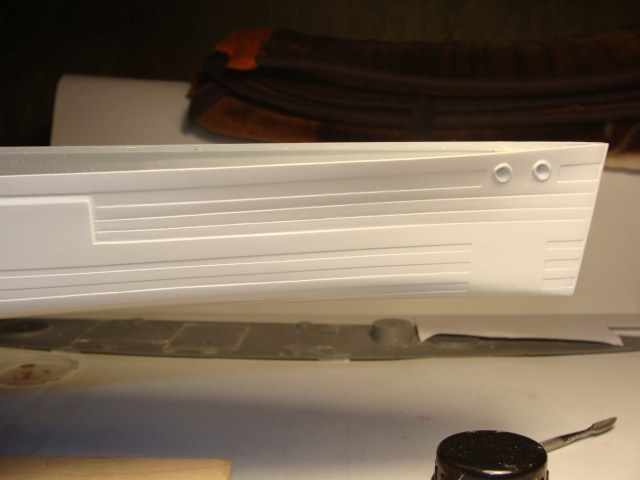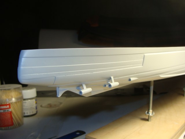 Ну и сразу что-бы не держать читателей в напряжение (если таковые найдутся ),то сразу перейду ко второй части мытарств с корпусом....Моя первая ошибка была -Это использования тамиевского супер жидкого клея для полосок..через некоторое время при шлифовки начали появляться пузыри "непроклея" (хорошо хоть что до грунтовки) но всё это потребовало проколов,заполнения клеем и вышкуривания..которое начинало меня слегка уже доставать,также были подточены були(ну не знаю как они называются правильно) выхода валов винтов.Весь это геморой с корпусом продолжался наверно месяц.......и контрольная грунтовка для выявления косяков корявых ручек