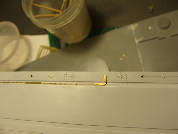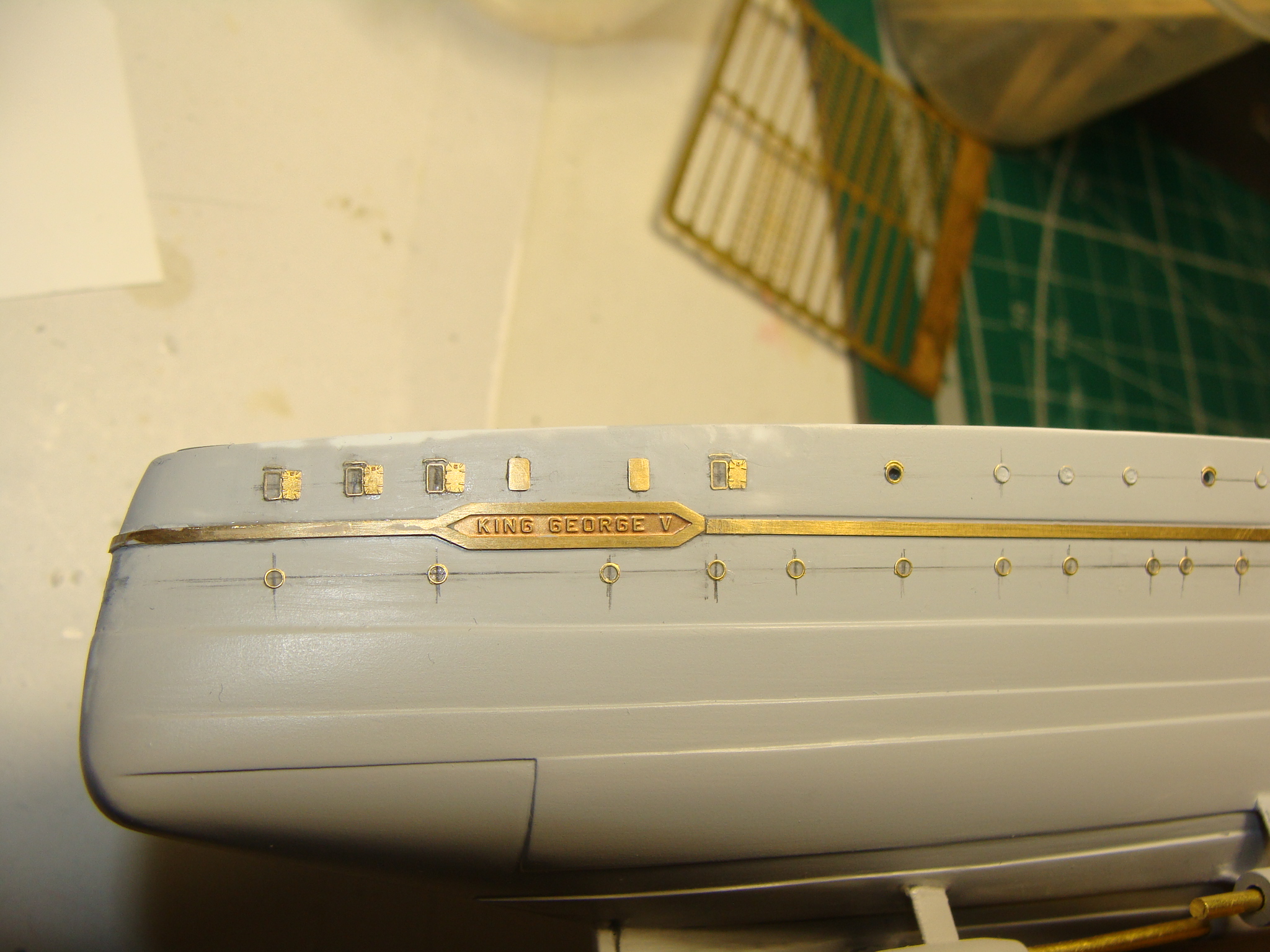 После двух-трех тонких слоев грунтовки с последующим вышкуриванием ,решено было начать украшать его иллюмиками,размагничивающим кабелем,и прочей лабудой,Иллюминаторы использовались North Star 48-ые...те что 1мм в просвет с козырьками и без. На 43-ий год большая часть иллюминаторов по борту была заварена заглушками.,после перебирания всех вариантов изготовления Кругляшков.(травленые заглушки для японцев оказались очень большими)...решено было просто устанавливать иллюминаторы без козырьков и заполнять их грунтовкой в несколько приемов с последующей шлифовкой