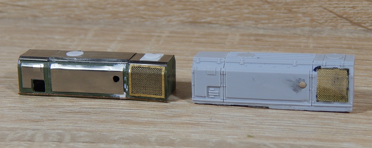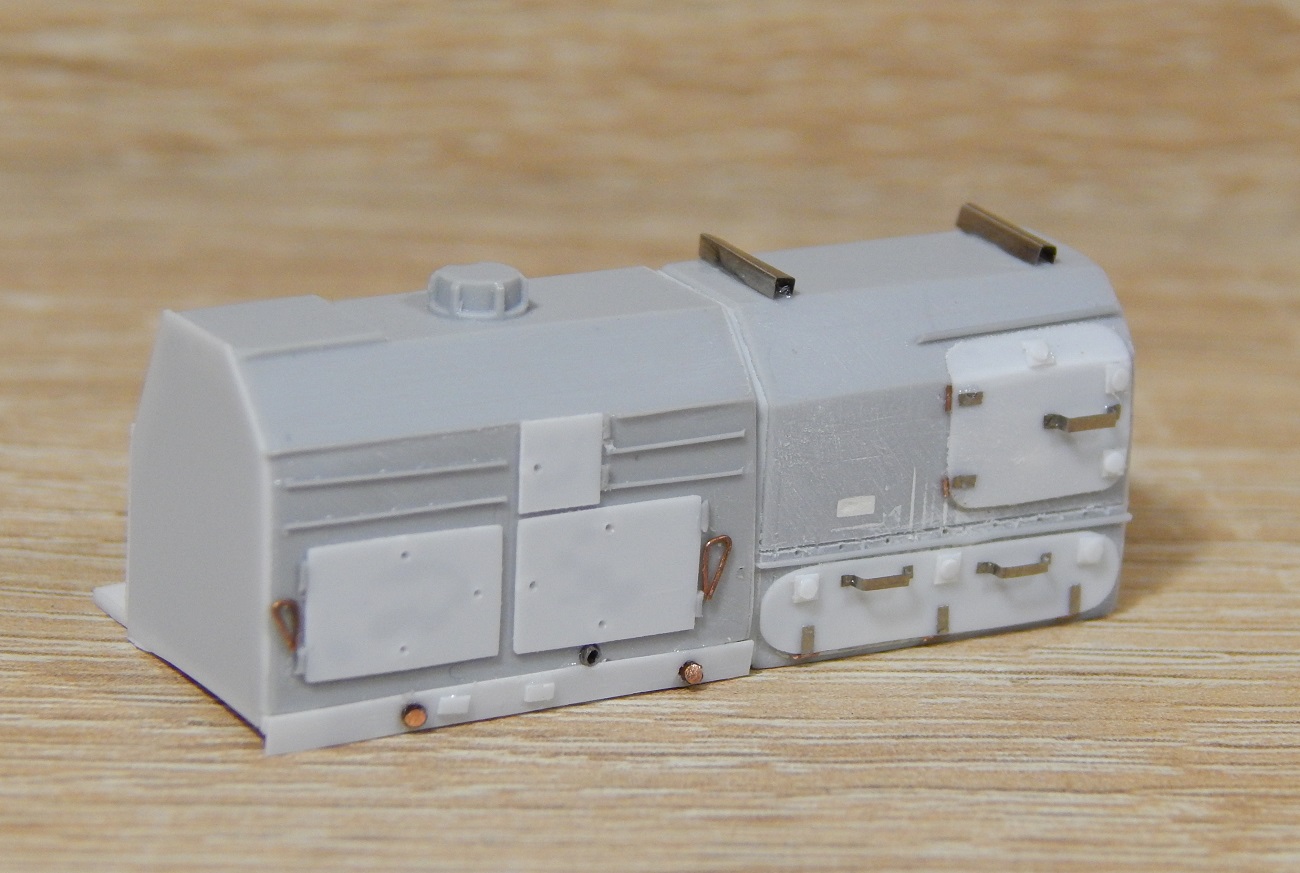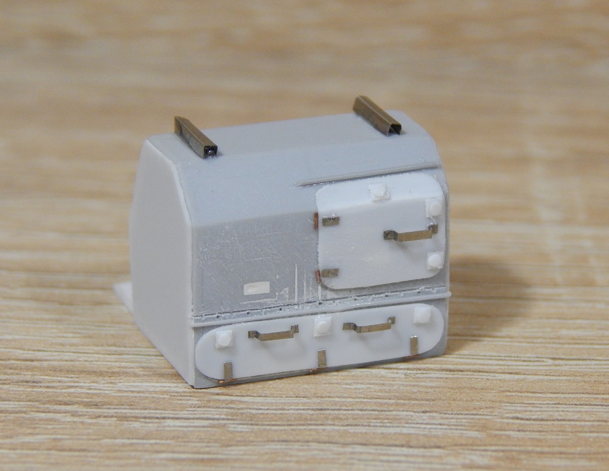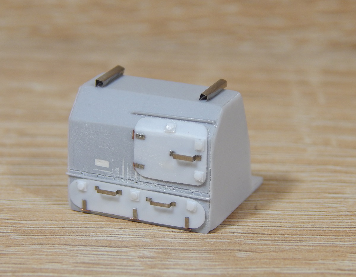 После предварительной установки бункеров выяснилось что они слишком широкие и положить раму ТПК между правыми и левыми бункерами невозможно. Тут конечно можно было сточить у бункеров задние стенки и проблема решена, но дальше изучив детально фото прототипа оказалось что геометрия, и рельеф ряда бункеров производителя не соответствуют действительности. Было решено использовать бункера от Звезды и потратить кучу времени чтобы заново уже самому отрисовать лицевые стенки бункеров для изготовления в травле.