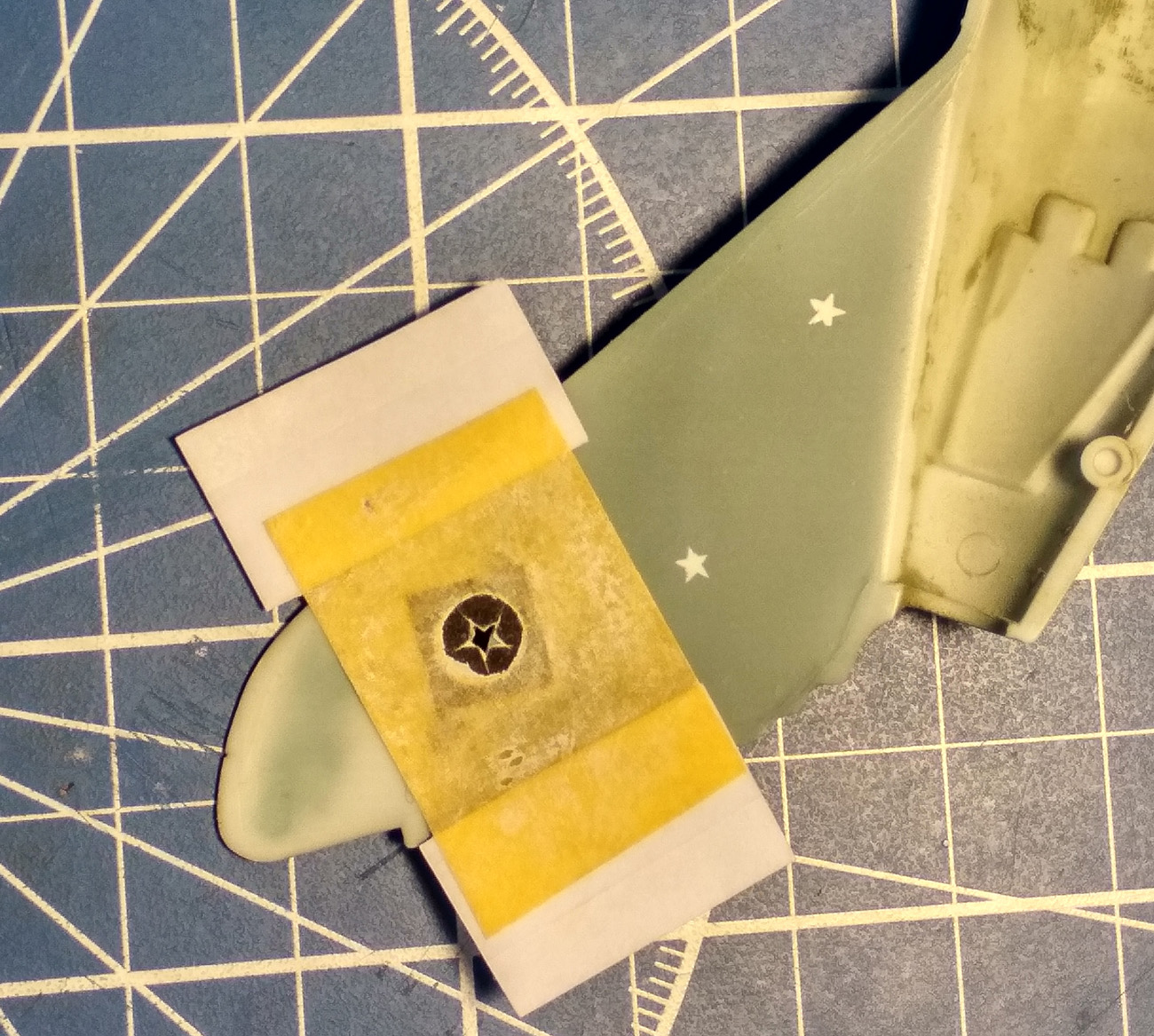 ...распечатал белых звезд на черном фоне, сверху наклеил прозрачный скотч, вырезал острым ножом, более или менее получилось только на четвертой, потом с помощью скотча наклеил на гуммированную бумагу и задул с аэрографа, потом как декаль перенес на самолет.