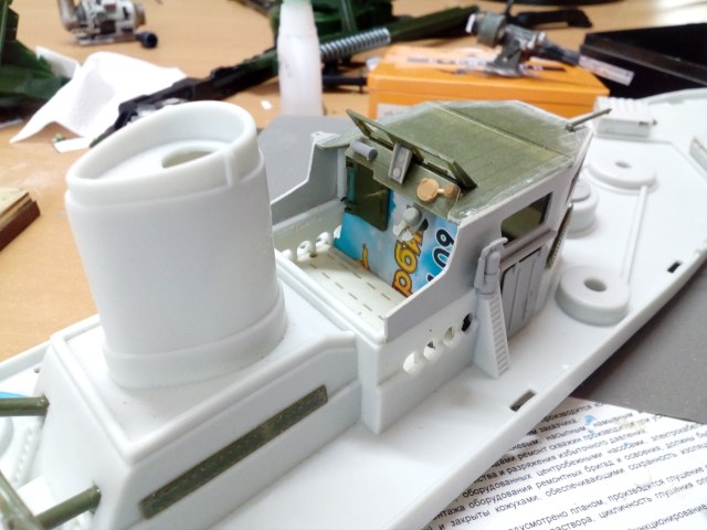 Кажется "долепил" палубу и прилегающие к оной территории. Задул грунтом. Ну... вроде неплохо, могло быть и хуже конечно. Собрал внутренний пост ходовой рубки и штурвальную колонку на наружный. Делать из обычных "баранок" (МаЗ-537 и ГаЗ-66) классические штурвалы не стал - клей шибко текучий.