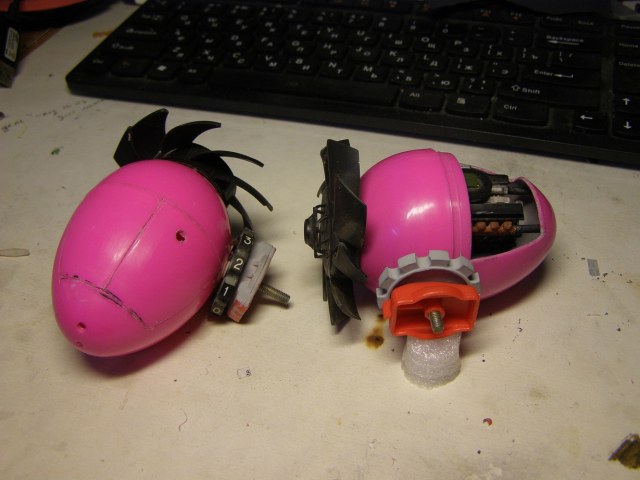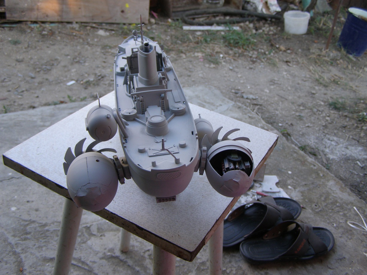 Реверсивные винто-вентиляторные установки, а вернее их предварительные макеты вроде как готовы и присобачены/прикотячены, а местами даже присовокуплены к корпусу! Оказалось, что "по центру" мотогондолы это не значит параллельно продольной линии судна (это я о положении мотора в корпусе оной и это заметно... Ну) Попробуем исправить. Еще пару деталек доклеить на корпуса и... думаю - может какие вертикальные плоскости присобачить (оперение).