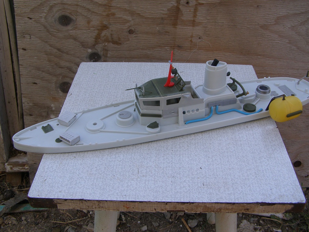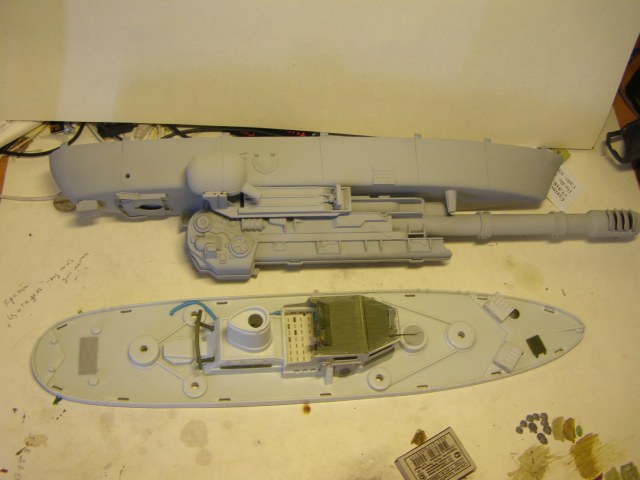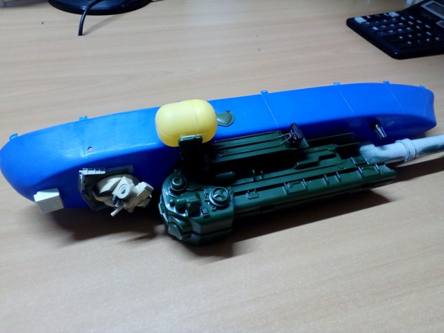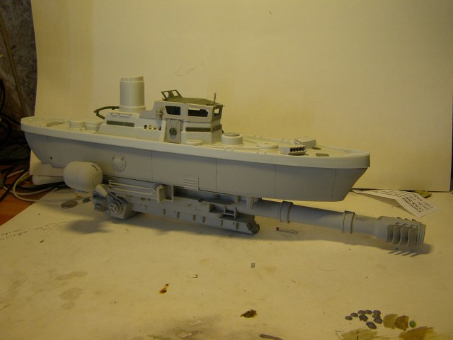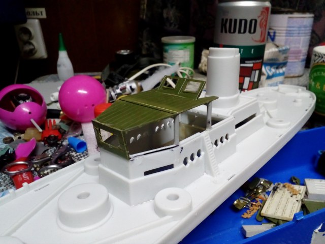 Кровельными саморезами и суперклеем соединил орудие и корпус катера, налепил всякого хлама для пущей детализации и даже попробовал немного расшить корпус.