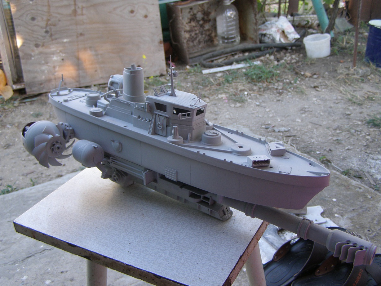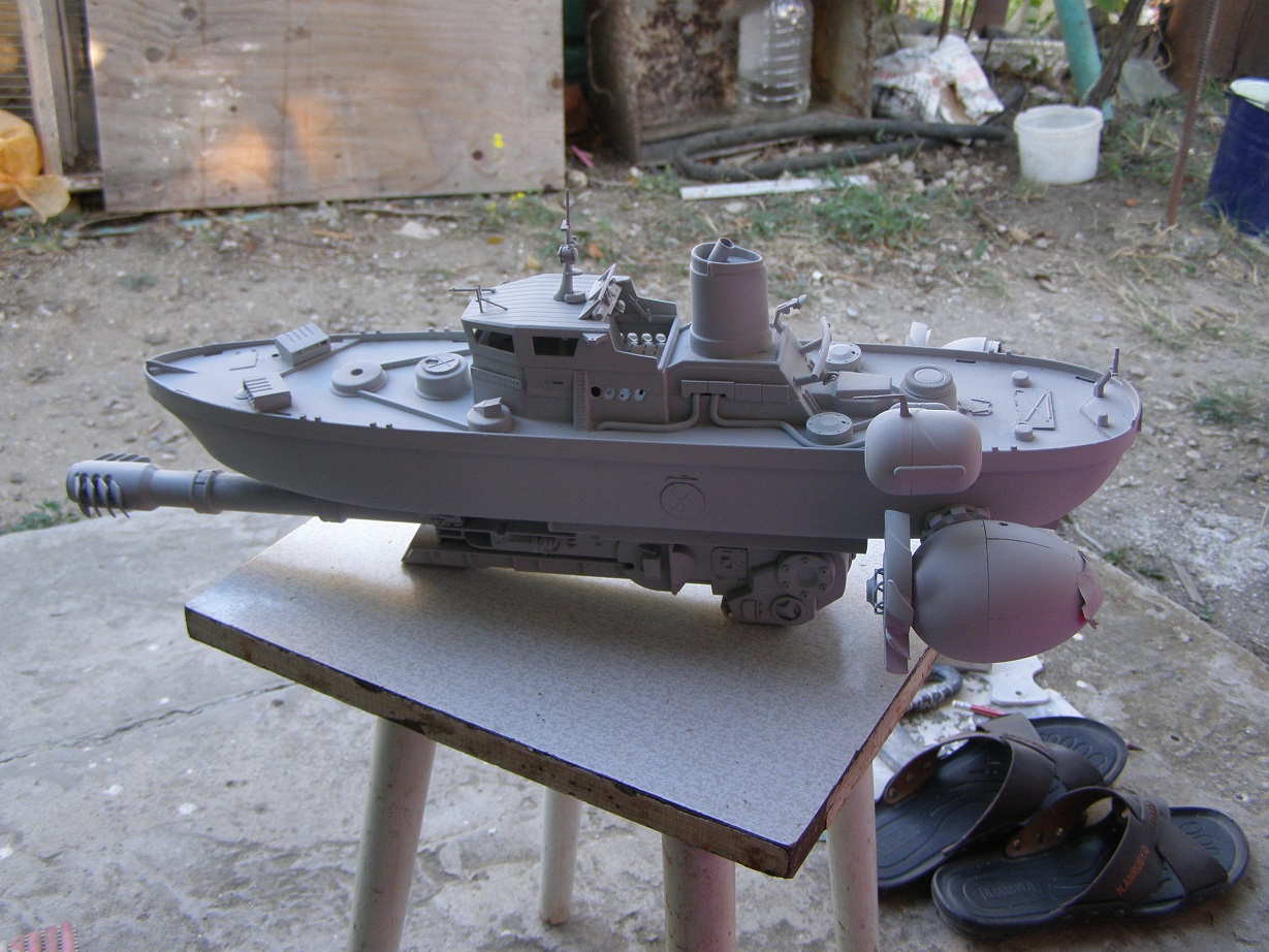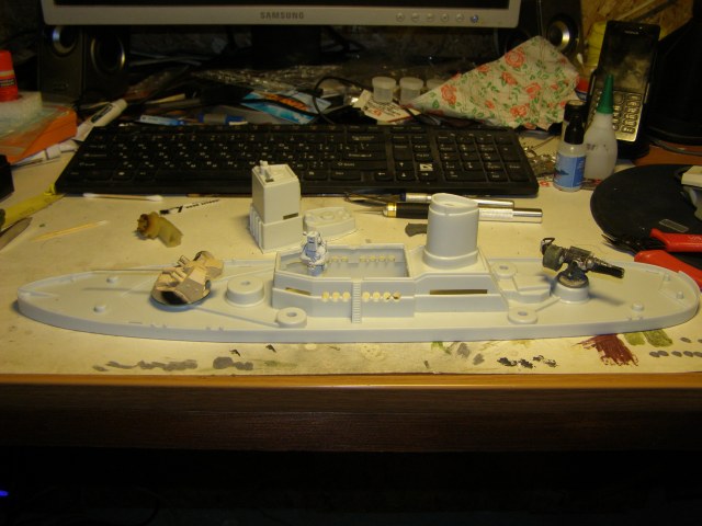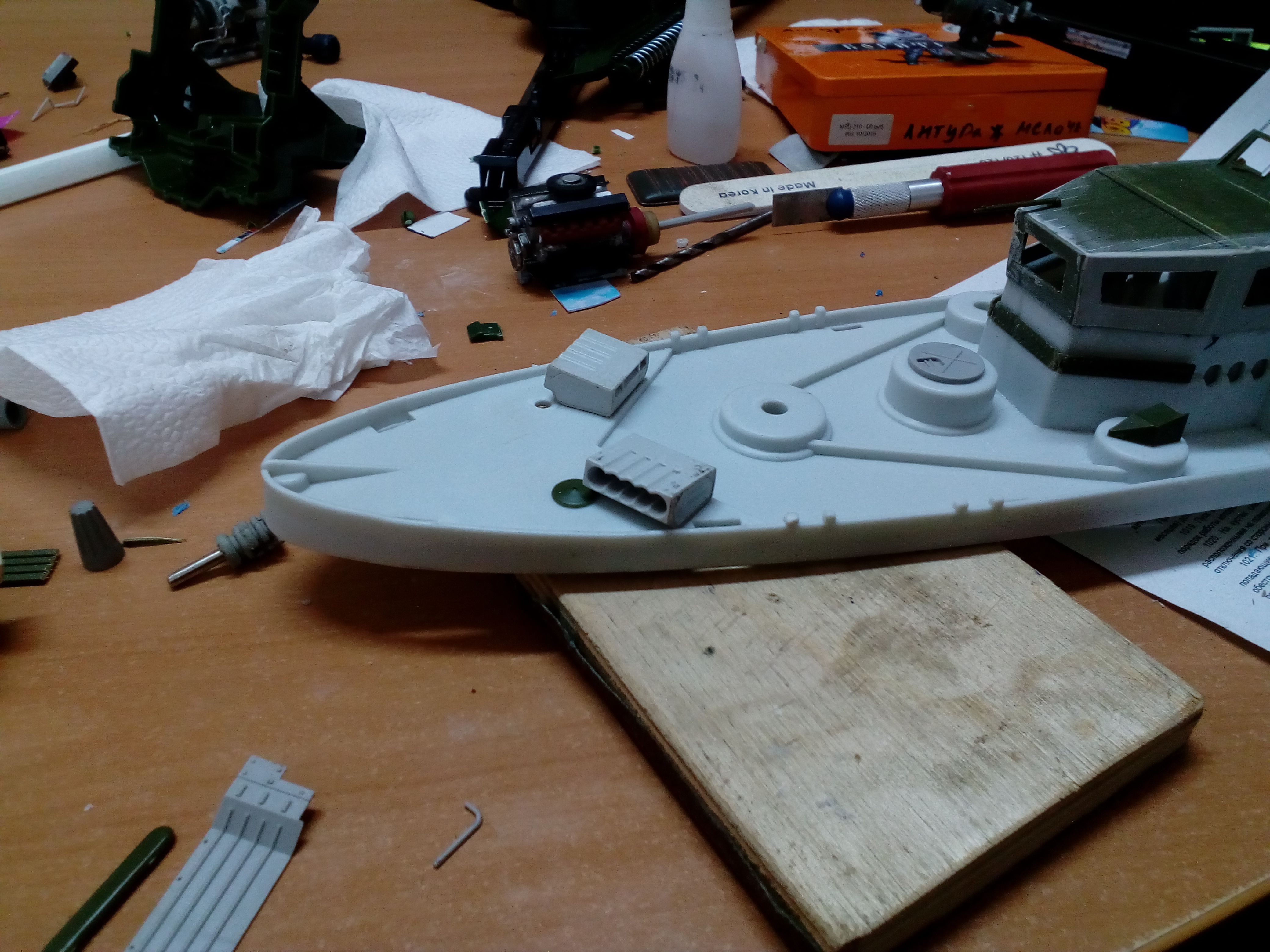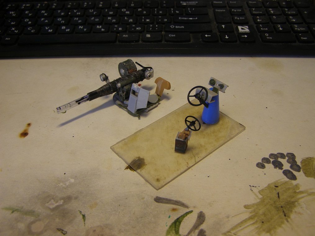 Снял ужасные пушки и отрезал часть надстройки. Приставил самодельные фигурки с основой из набора Звезды (ЗиС) в 35 масштабе понял - это будет бронированный катер (далее БК) и масштаб - как раз.