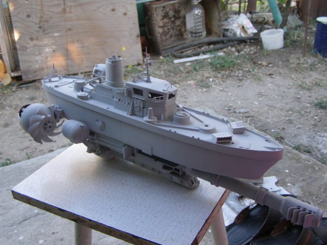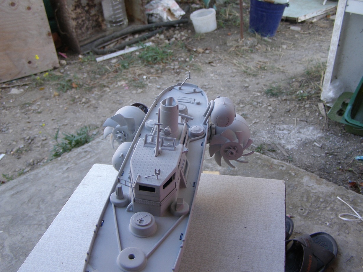 Загрунтовал. Кормовую турельку решил перенести под корпус судна.