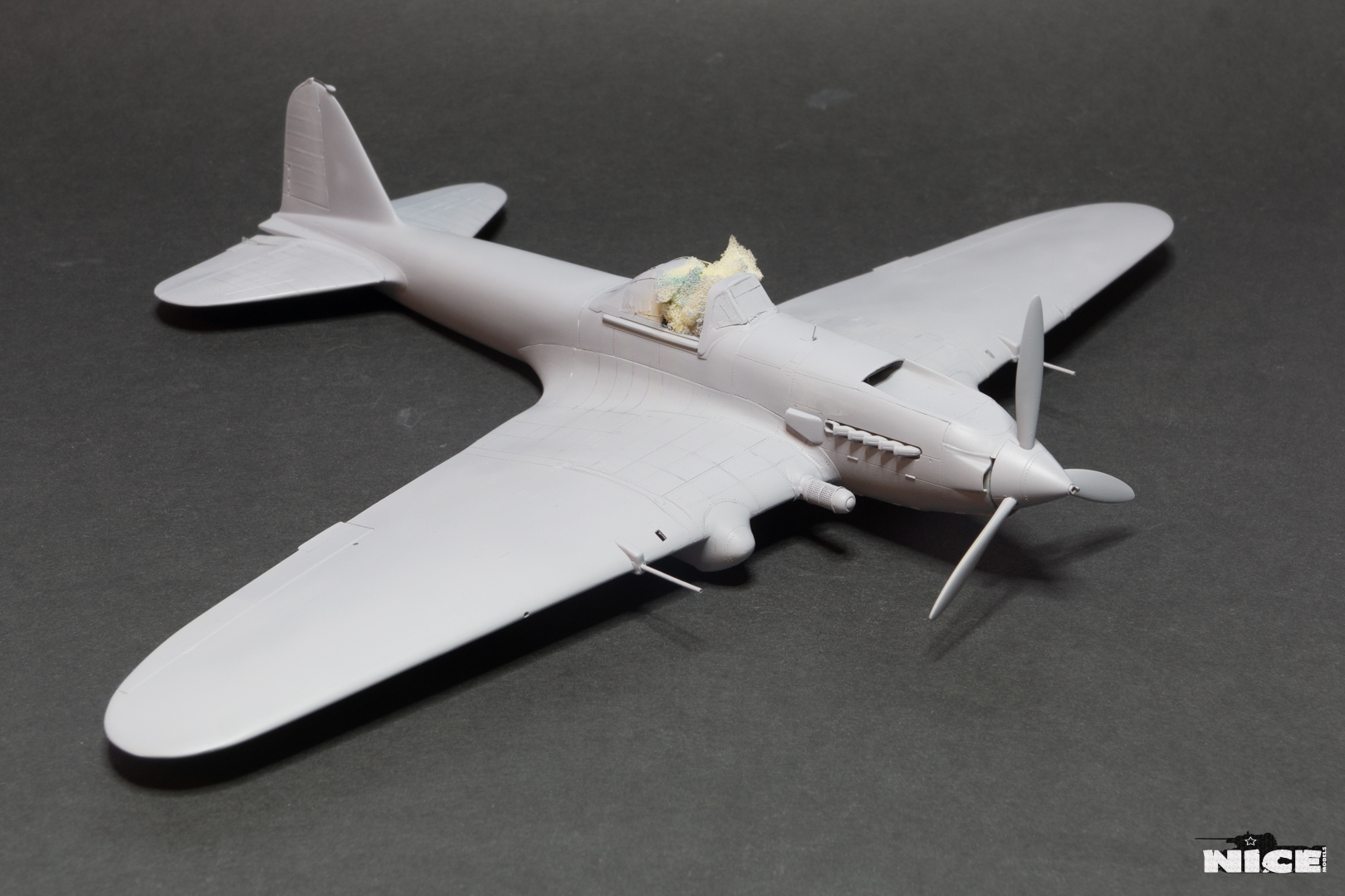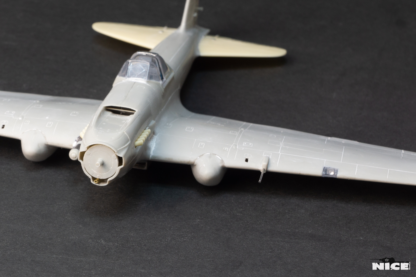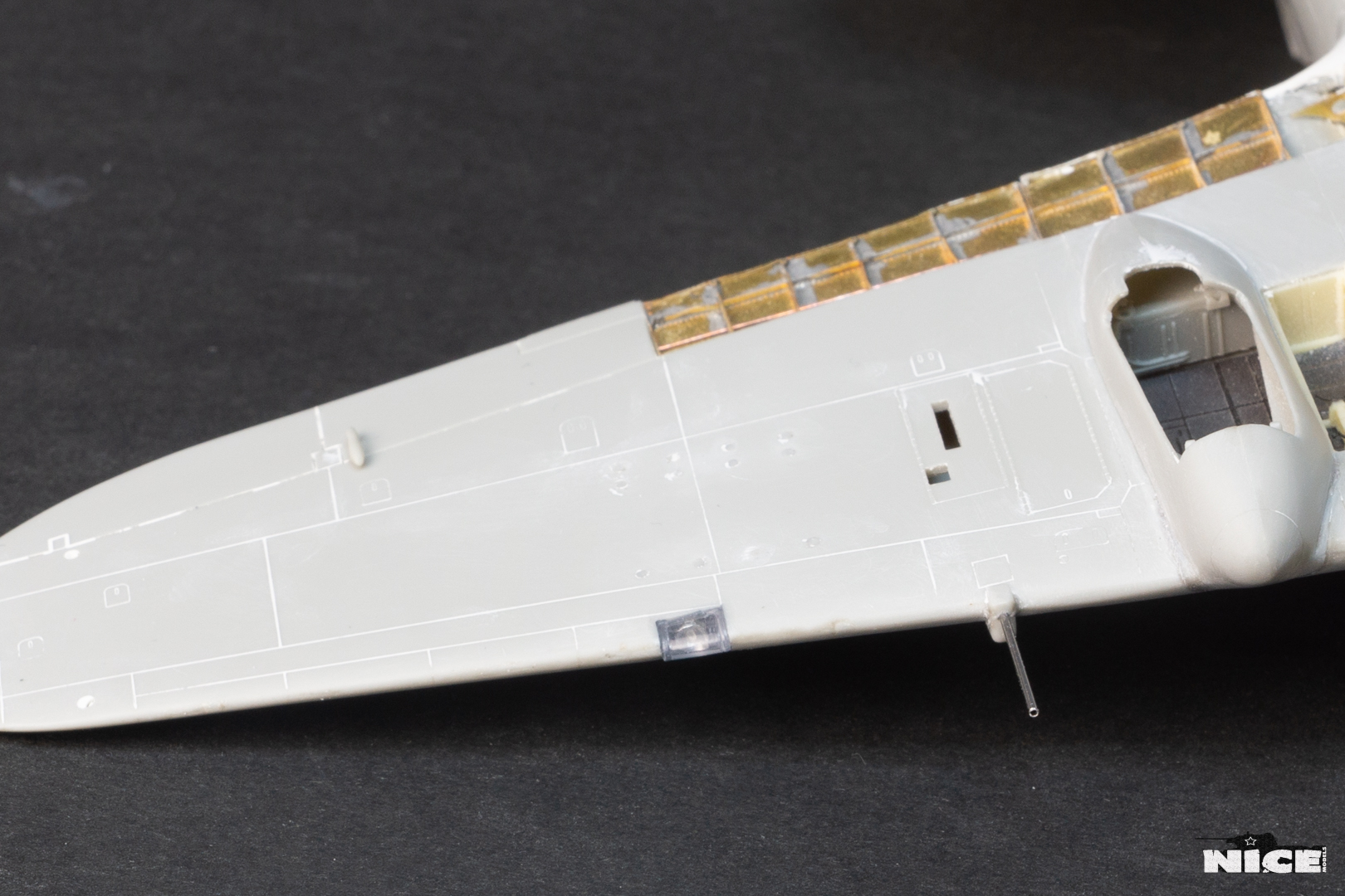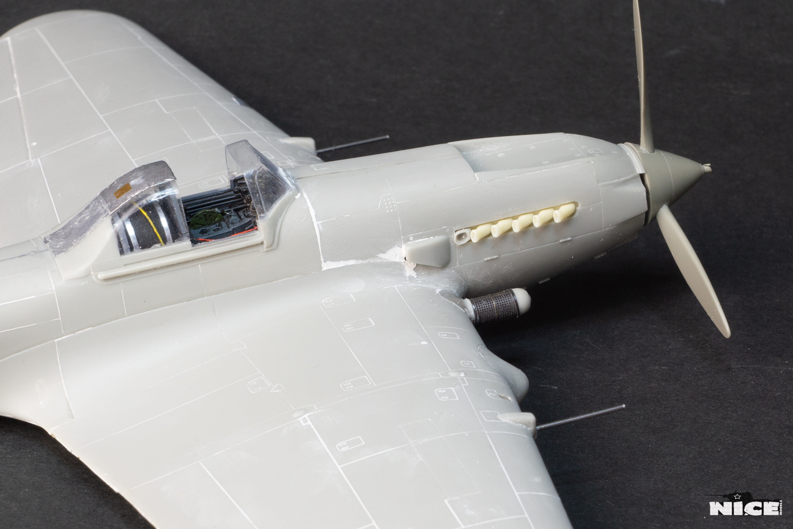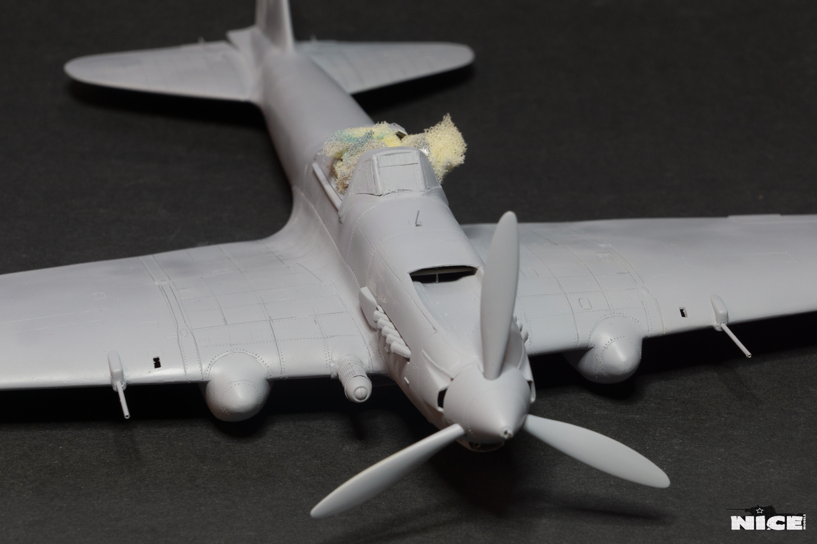 Далее несколько вечеров грунтовал модель с промежуточной шлифовкой т.к. повылазило много неприятных моментов. Грунтую грунтовкой Mr.Surfacer 1000. Шлифую наждачной бумагой ЗМ и Тамия зернистостью от 400 до 1200, естественно, с водой. Затем восстановил расшивку и накатал клепку. Установлен прицел и дренажную трубку перед бомболюком. За качество фото извиняйте- сломал ногу у штатива(