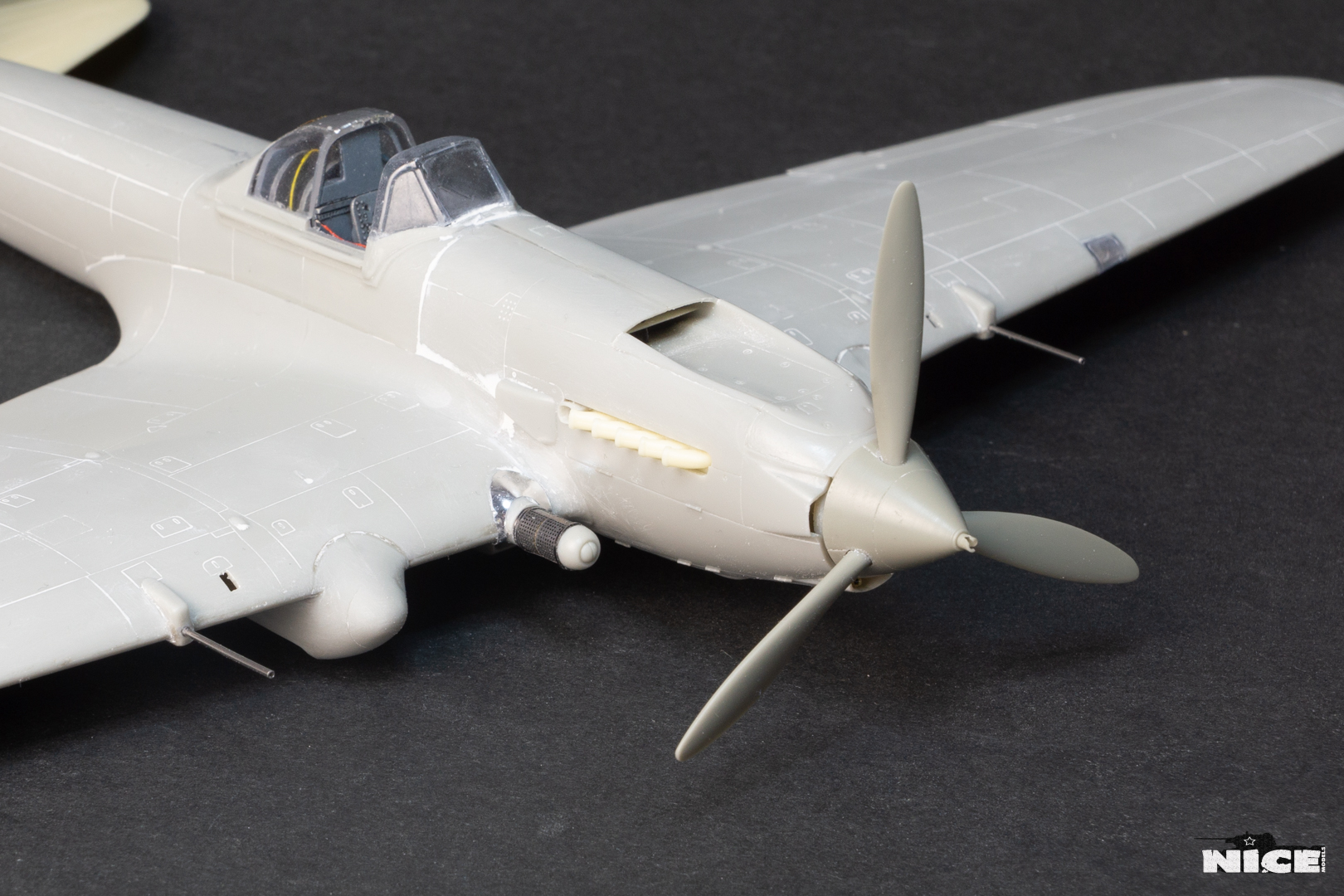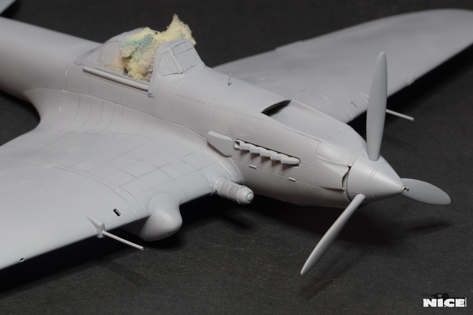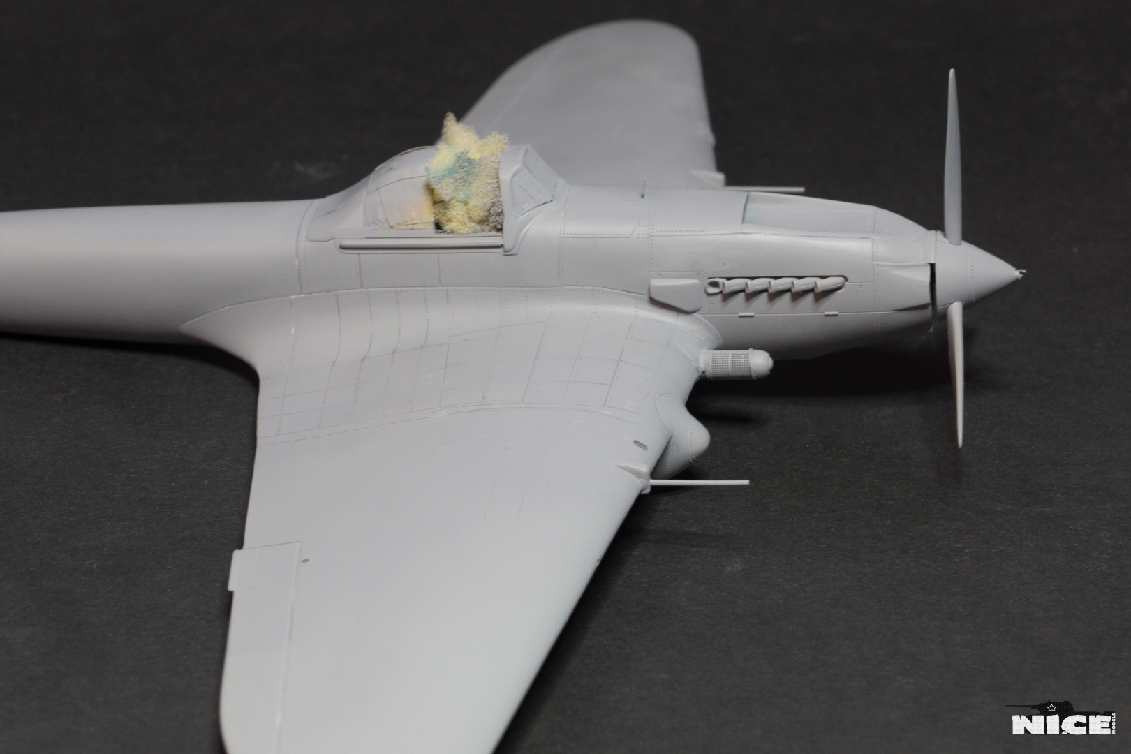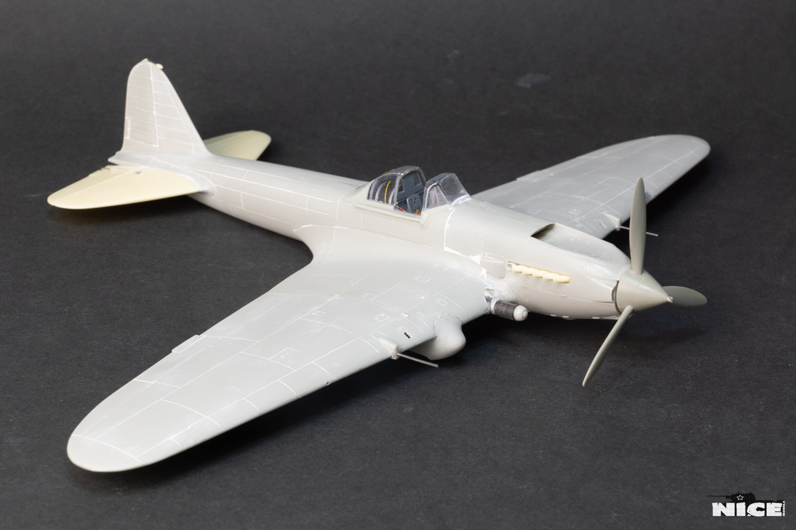 Далее несколько вечеров грунтовал модель с промежуточной шлифовкой т.к. повылазило много неприятных моментов. Грунтую грунтовкой Mr.Surfacer 1000. Шлифую наждачной бумагой ЗМ и Тамия зернистостью от 400 до 1200, естественно, с водой. Затем восстановил расшивку и накатал клепку. Установлен прицел и дренажную трубку перед бомболюком. За качество фото извиняйте- сломал ногу у штатива(