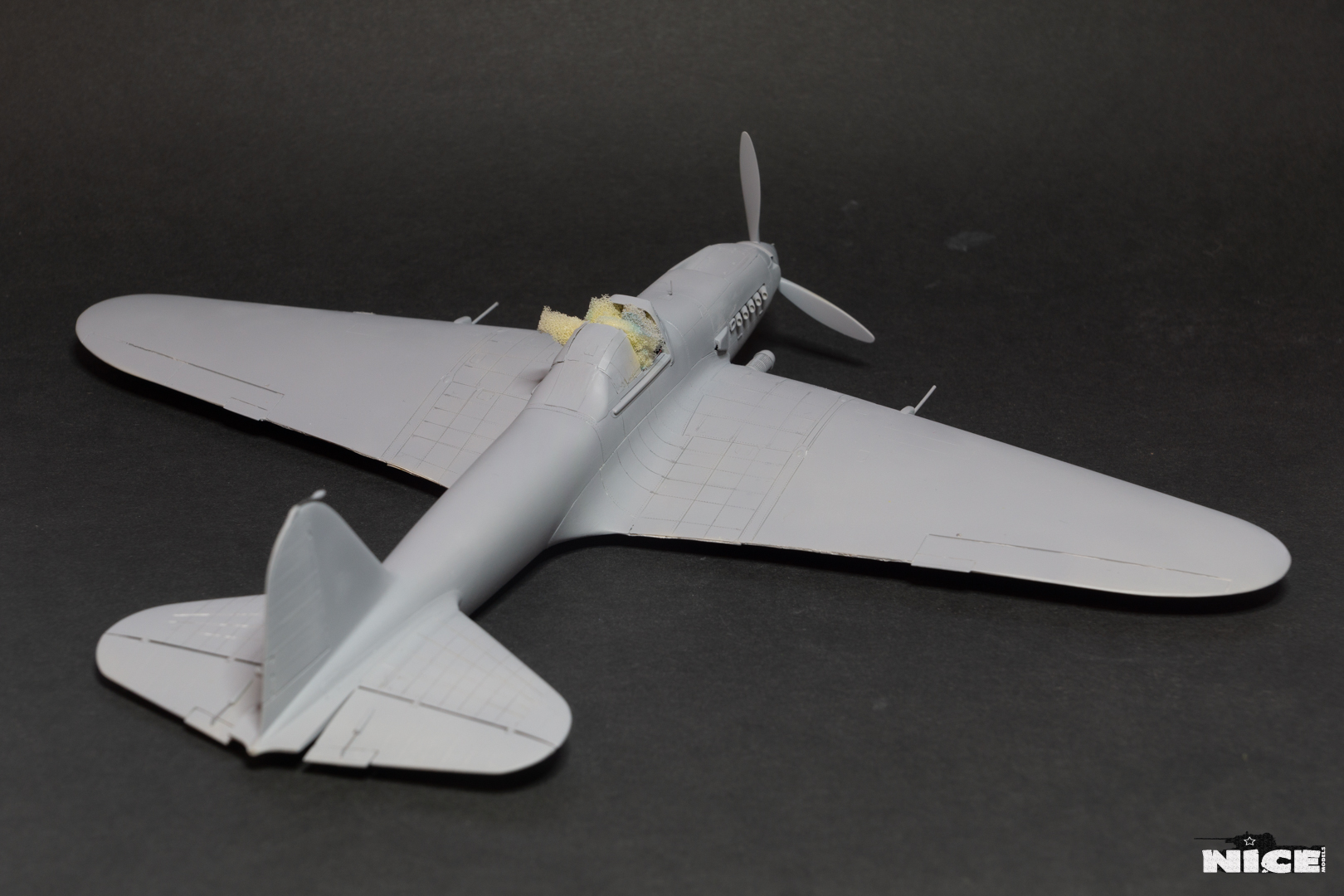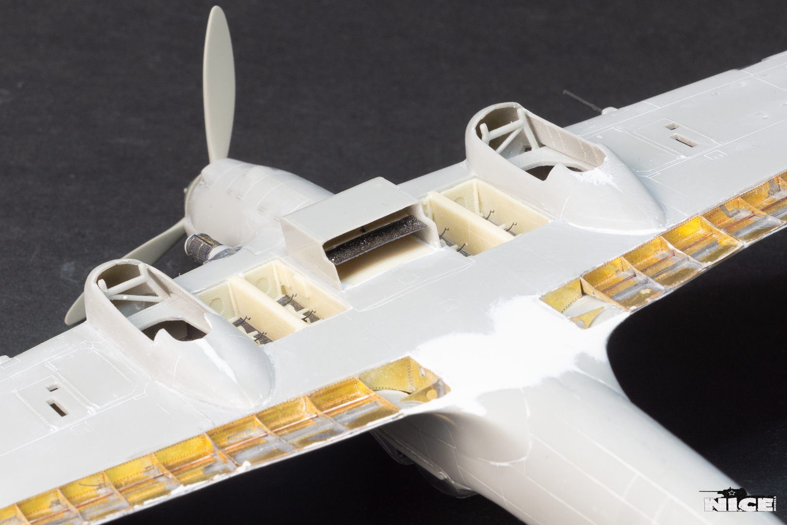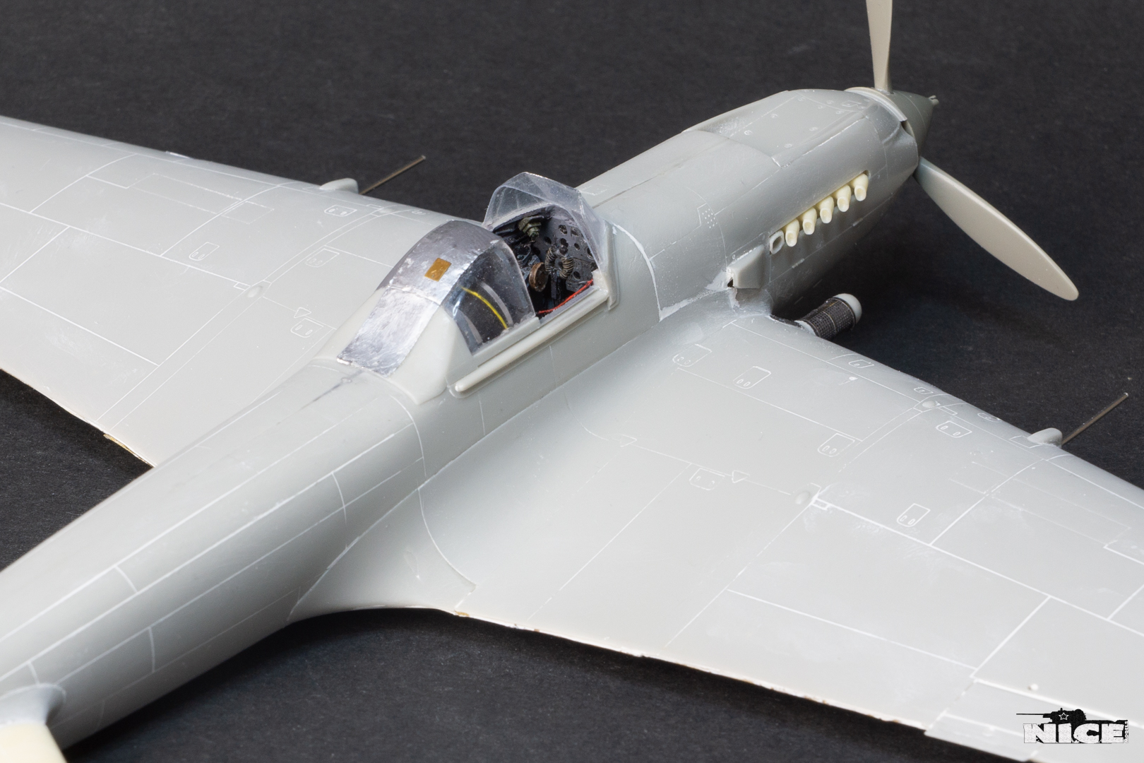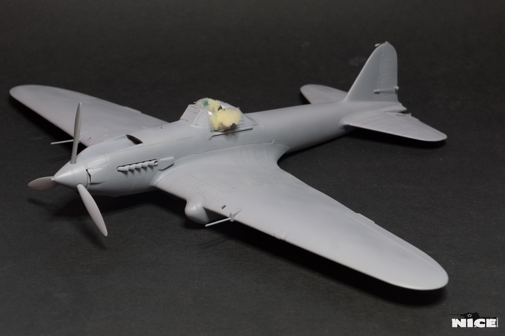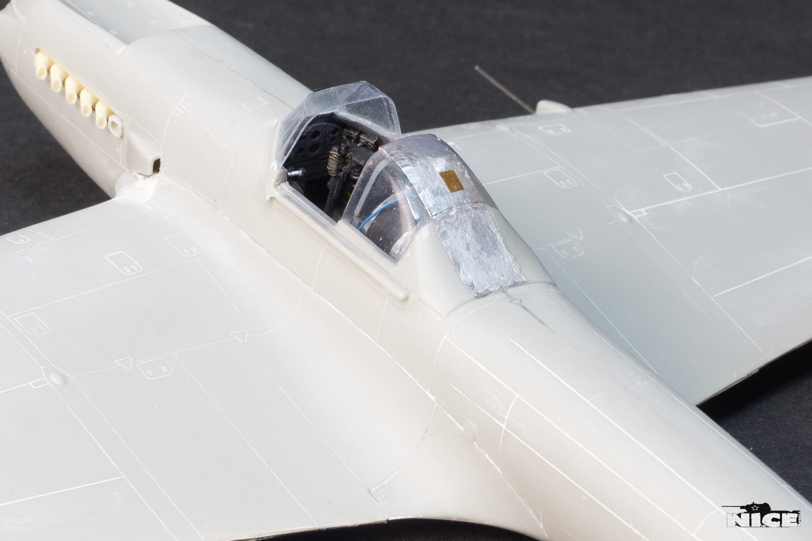 Далее несколько вечеров грунтовал модель с промежуточной шлифовкой т.к. повылазило много неприятных моментов. Грунтую грунтовкой Mr.Surfacer 1000. Шлифую наждачной бумагой ЗМ и Тамия зернистостью от 400 до 1200, естественно, с водой. Затем восстановил расшивку и накатал клепку. Установлен прицел и дренажную трубку перед бомболюком. За качество фото извиняйте- сломал ногу у штатива(