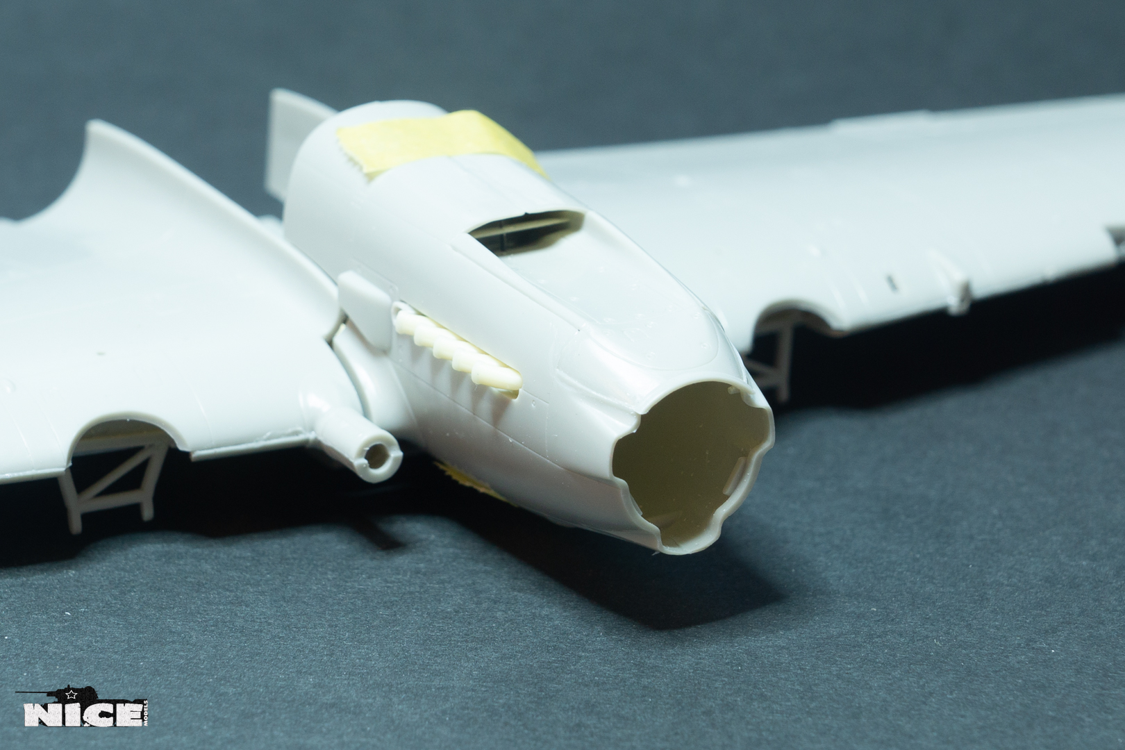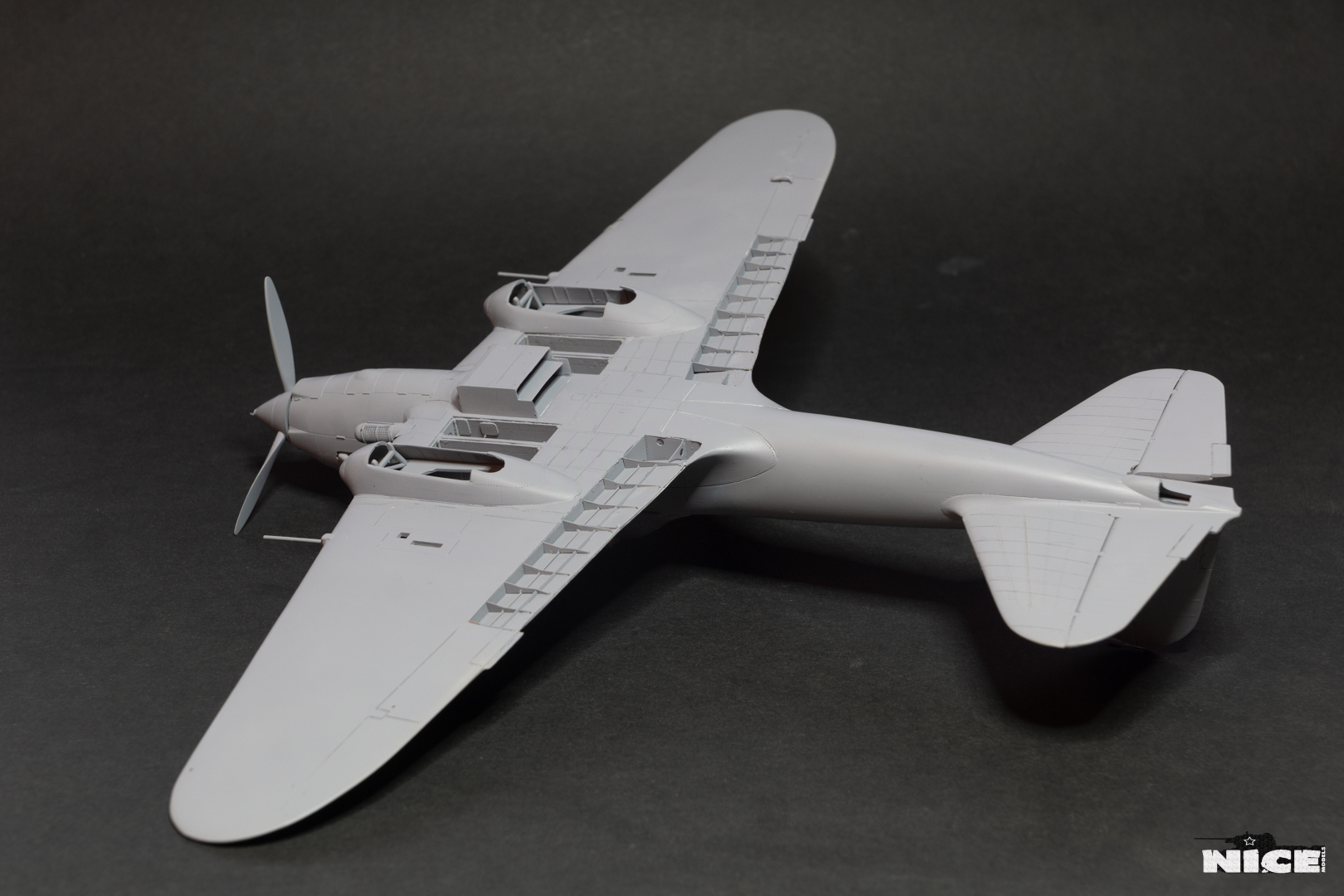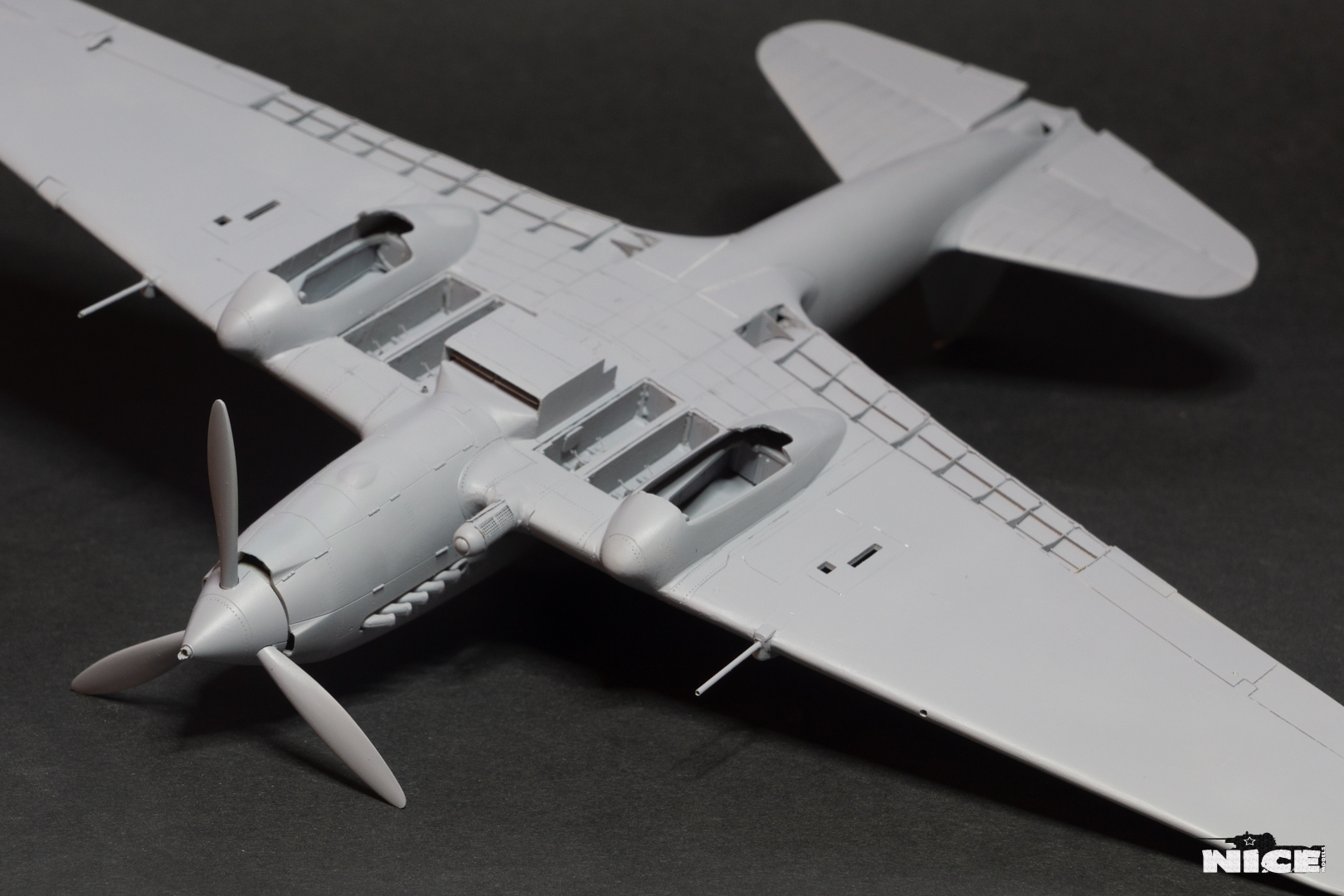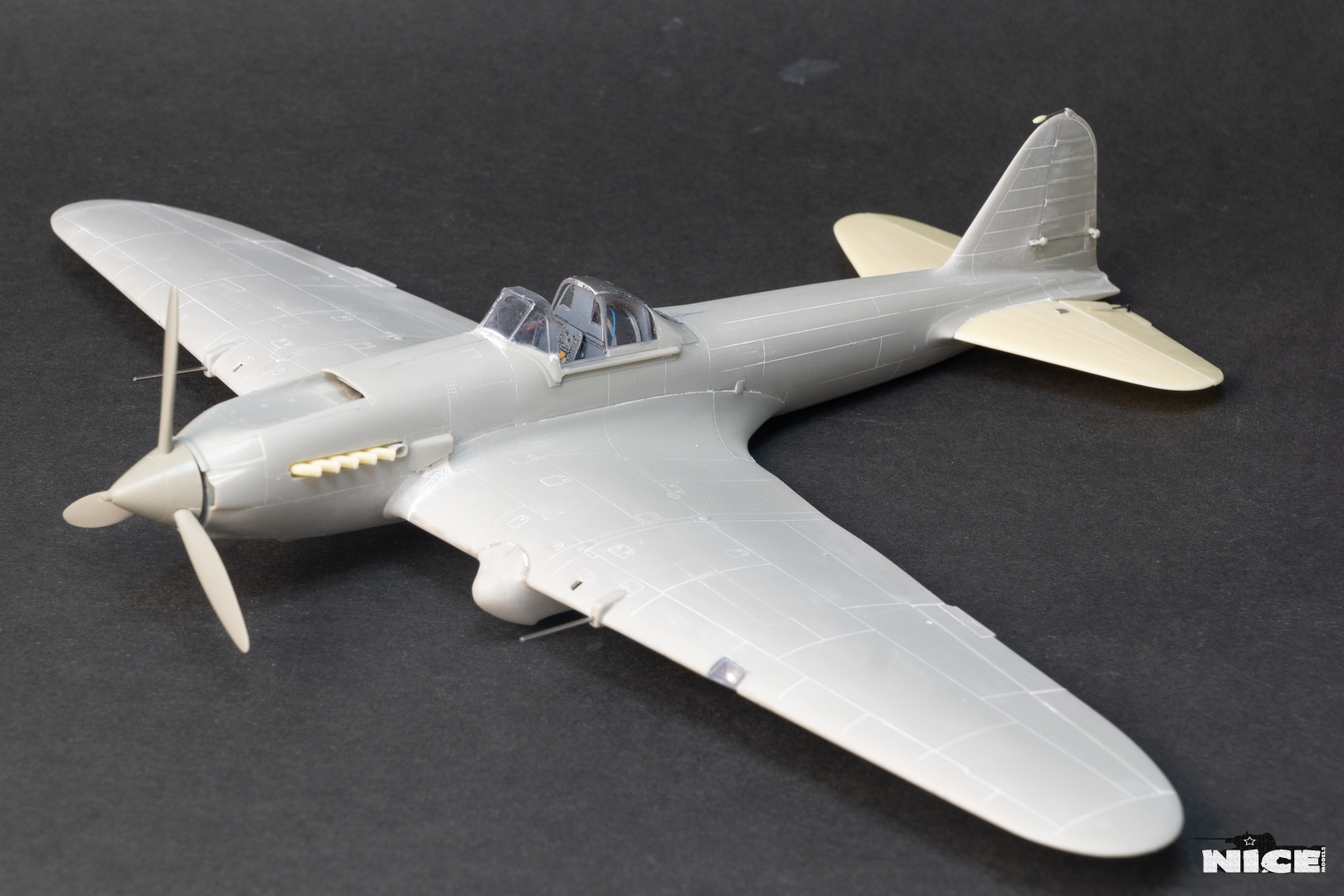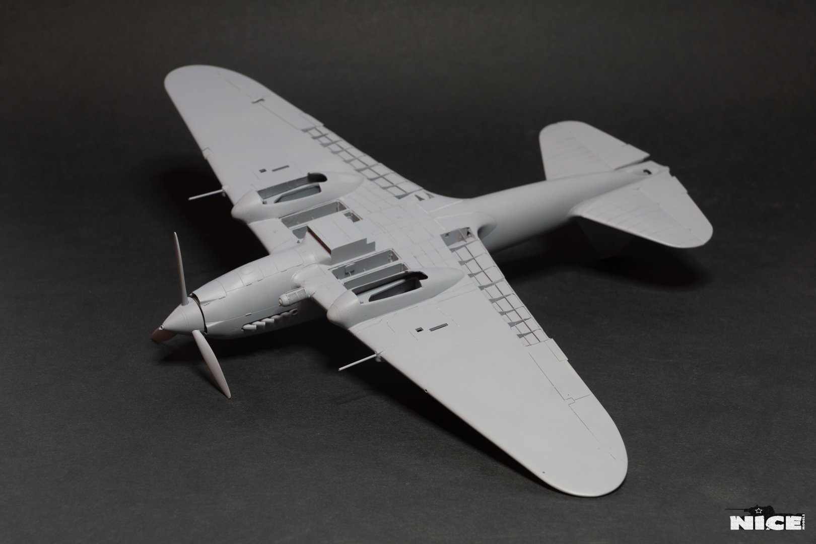 Далее несколько вечеров грунтовал модель с промежуточной шлифовкой т.к. повылазило много неприятных моментов. Грунтую грунтовкой Mr.Surfacer 1000. Шлифую наждачной бумагой ЗМ и Тамия зернистостью от 400 до 1200, естественно, с водой. Затем восстановил расшивку и накатал клепку. Установлен прицел и дренажную трубку перед бомболюком. За качество фото извиняйте- сломал ногу у штатива(