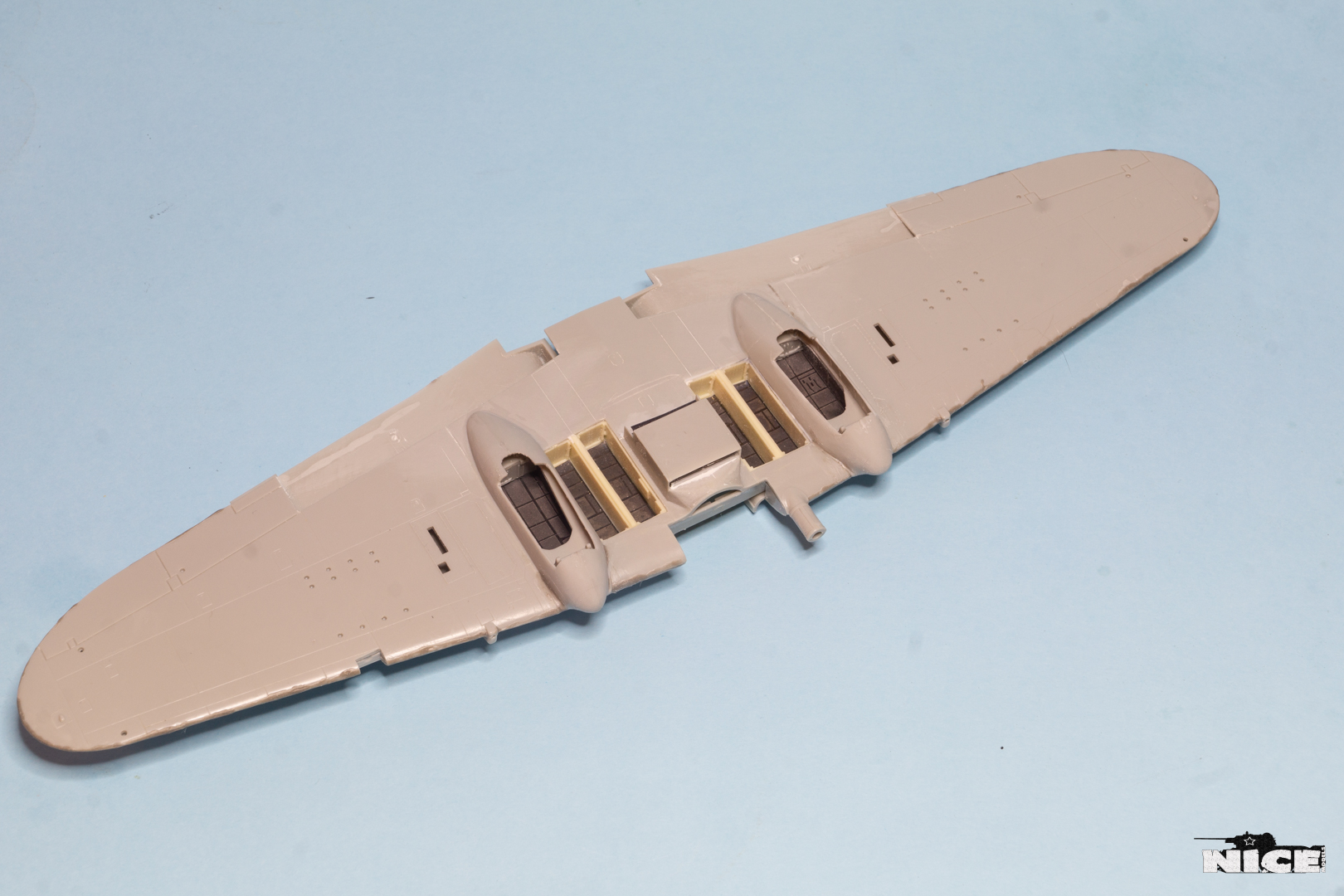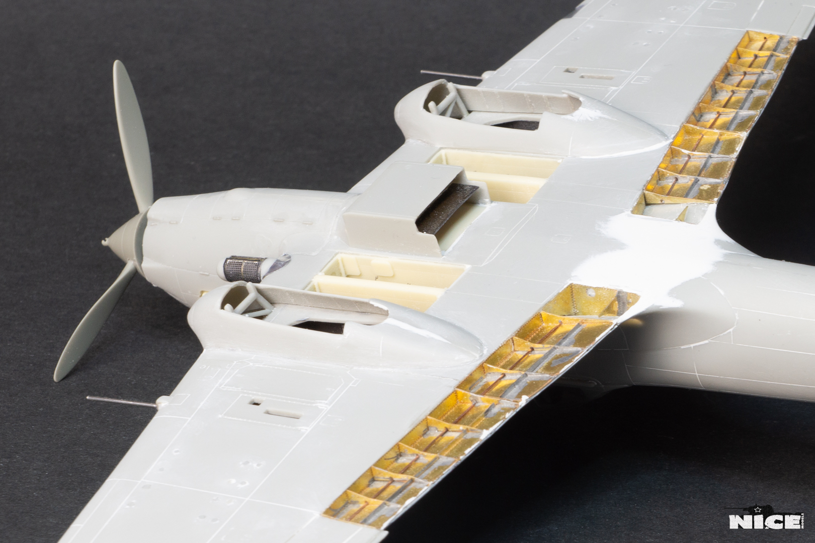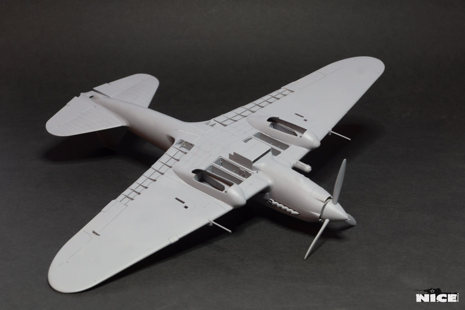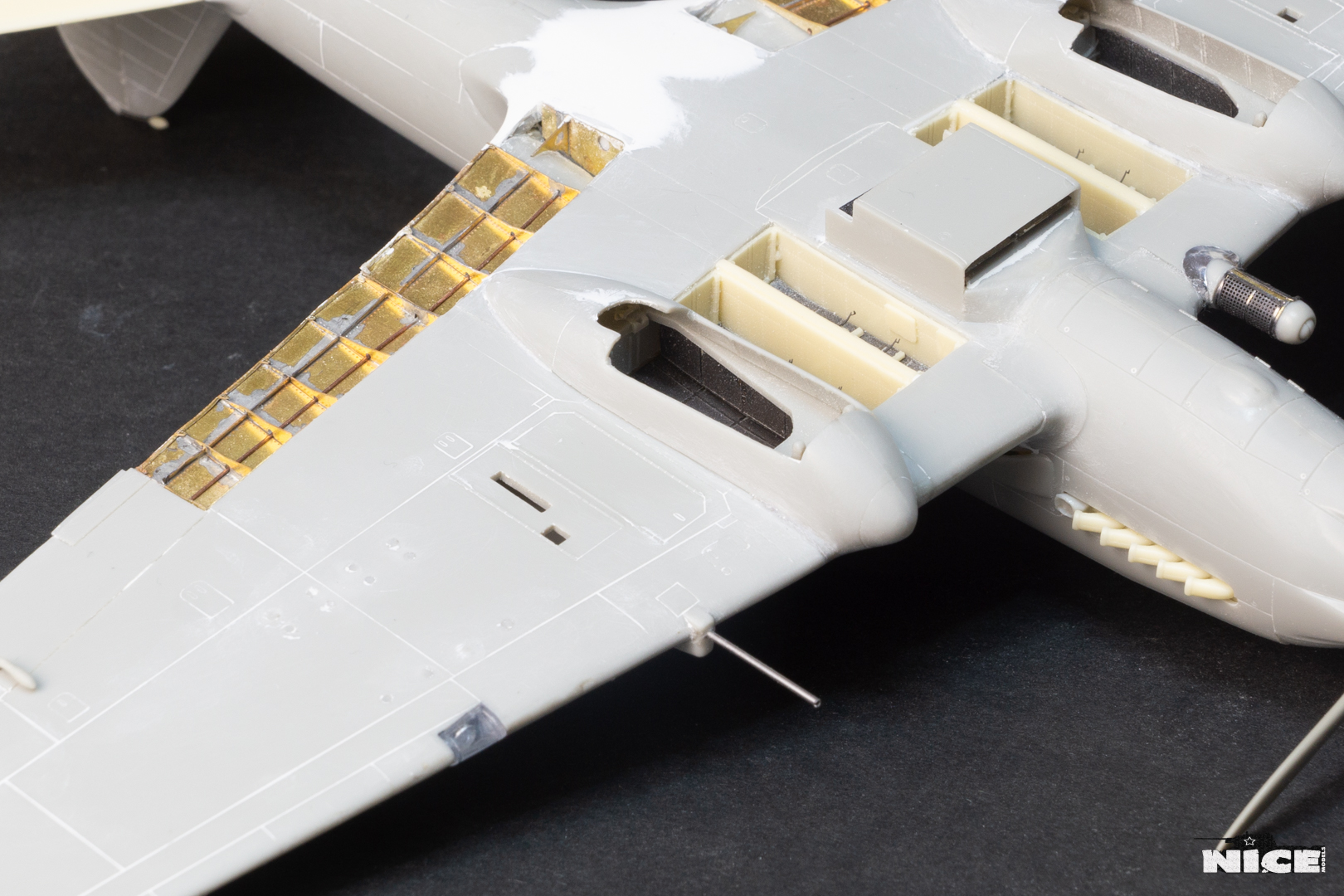 Далее несколько вечеров грунтовал модель с промежуточной шлифовкой т.к. повылазило много неприятных моментов. Грунтую грунтовкой Mr.Surfacer 1000. Шлифую наждачной бумагой ЗМ и Тамия зернистостью от 400 до 1200, естественно, с водой. Затем восстановил расшивку и накатал клепку. Установлен прицел и дренажную трубку перед бомболюком. За качество фото извиняйте- сломал ногу у штатива(
