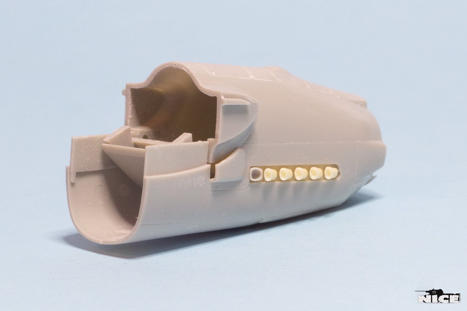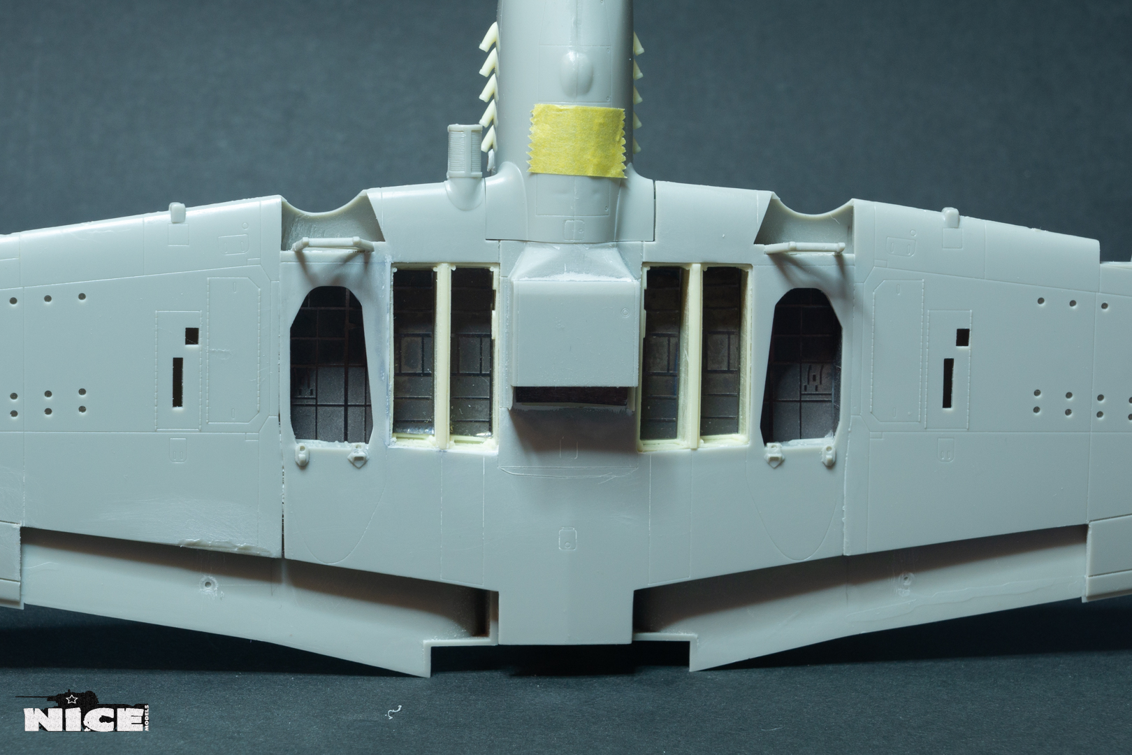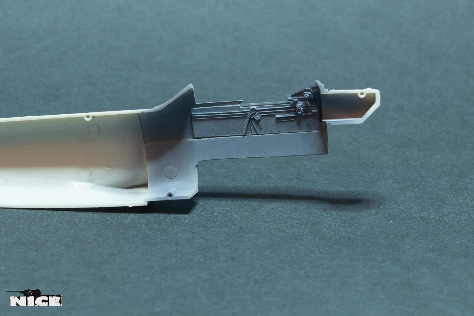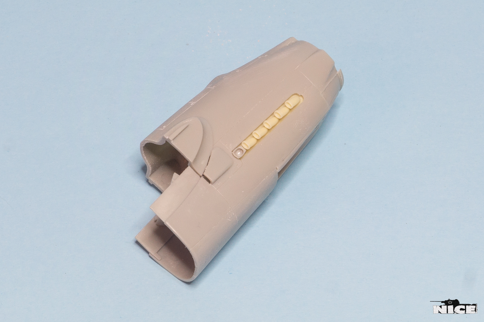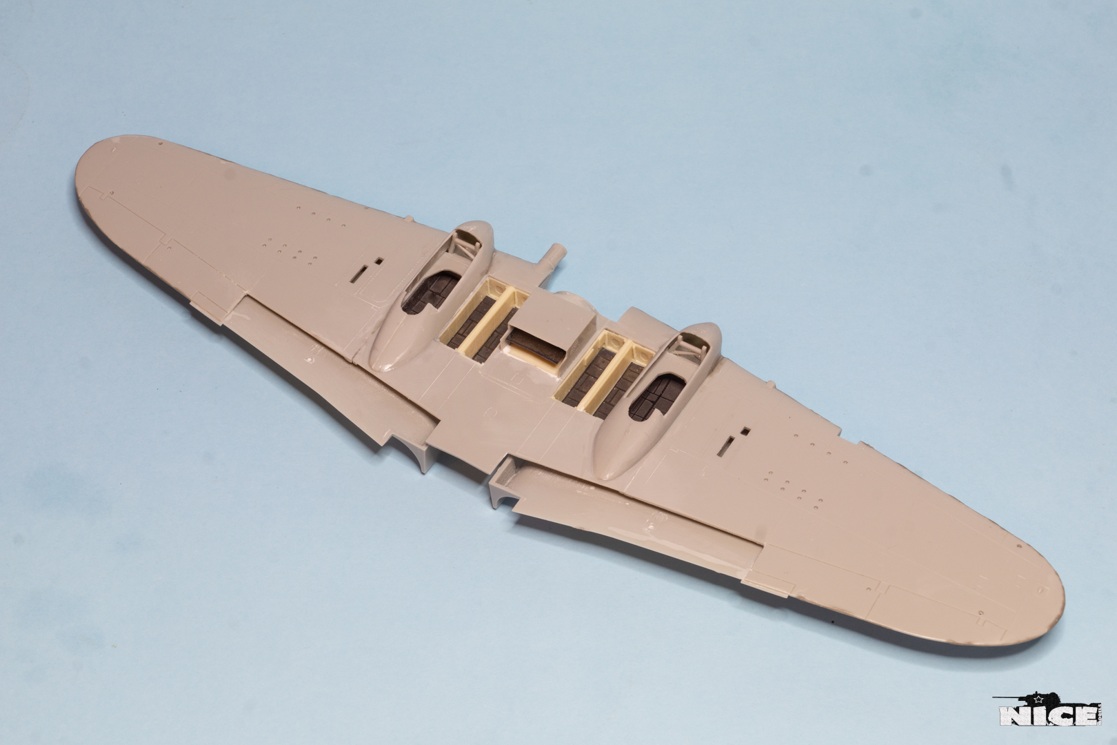 Далее несколько вечеров грунтовал модель с промежуточной шлифовкой т.к. повылазило много неприятных моментов. Грунтую грунтовкой Mr.Surfacer 1000. Шлифую наждачной бумагой ЗМ и Тамия зернистостью от 400 до 1200, естественно, с водой. Затем восстановил расшивку и накатал клепку. Установлен прицел и дренажную трубку перед бомболюком. За качество фото извиняйте- сломал ногу у штатива(