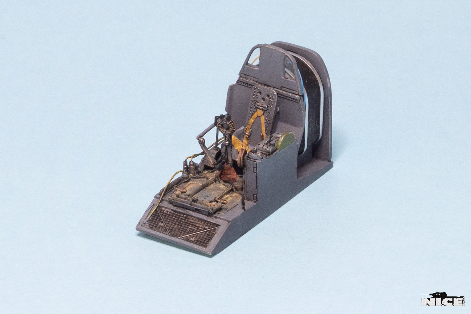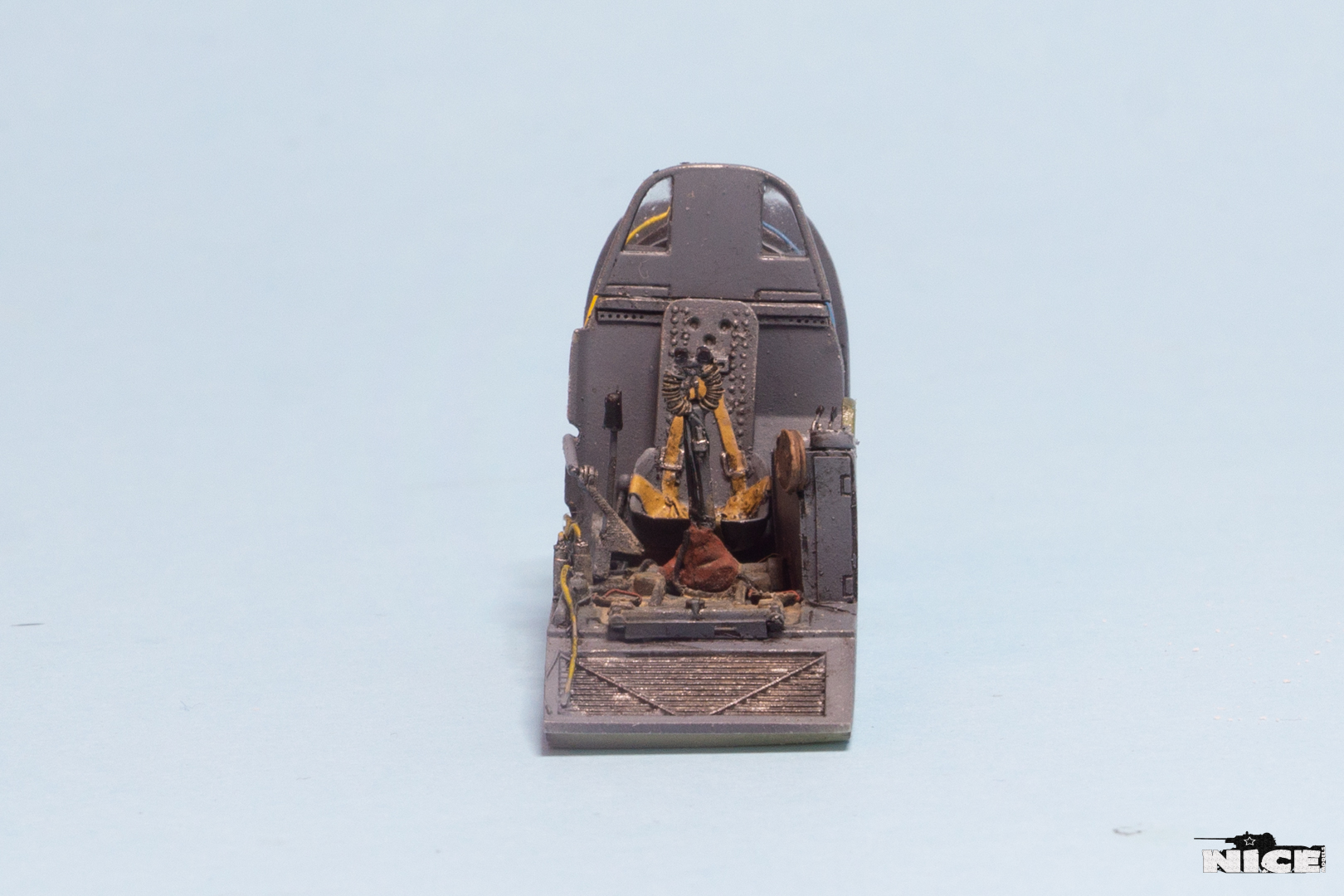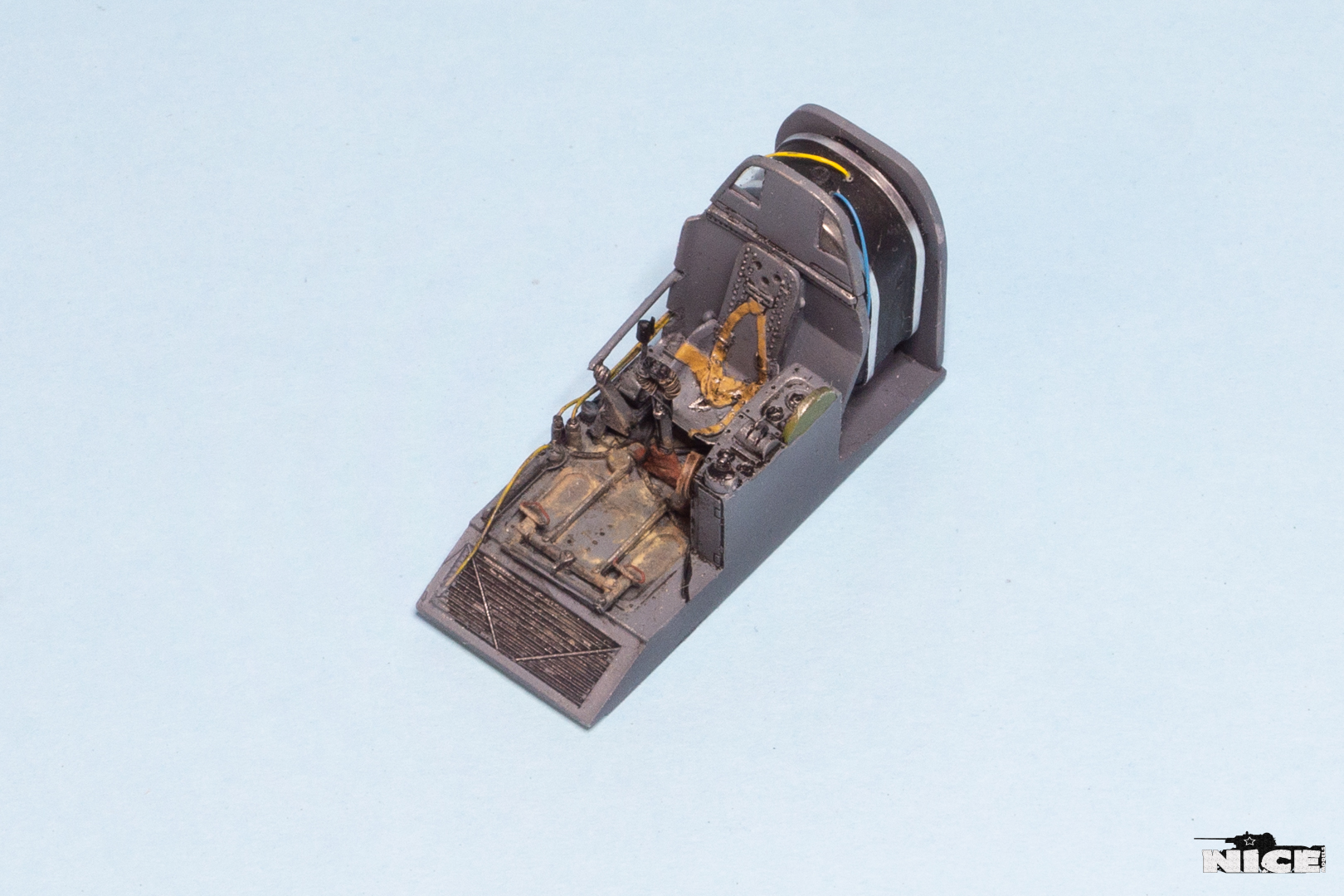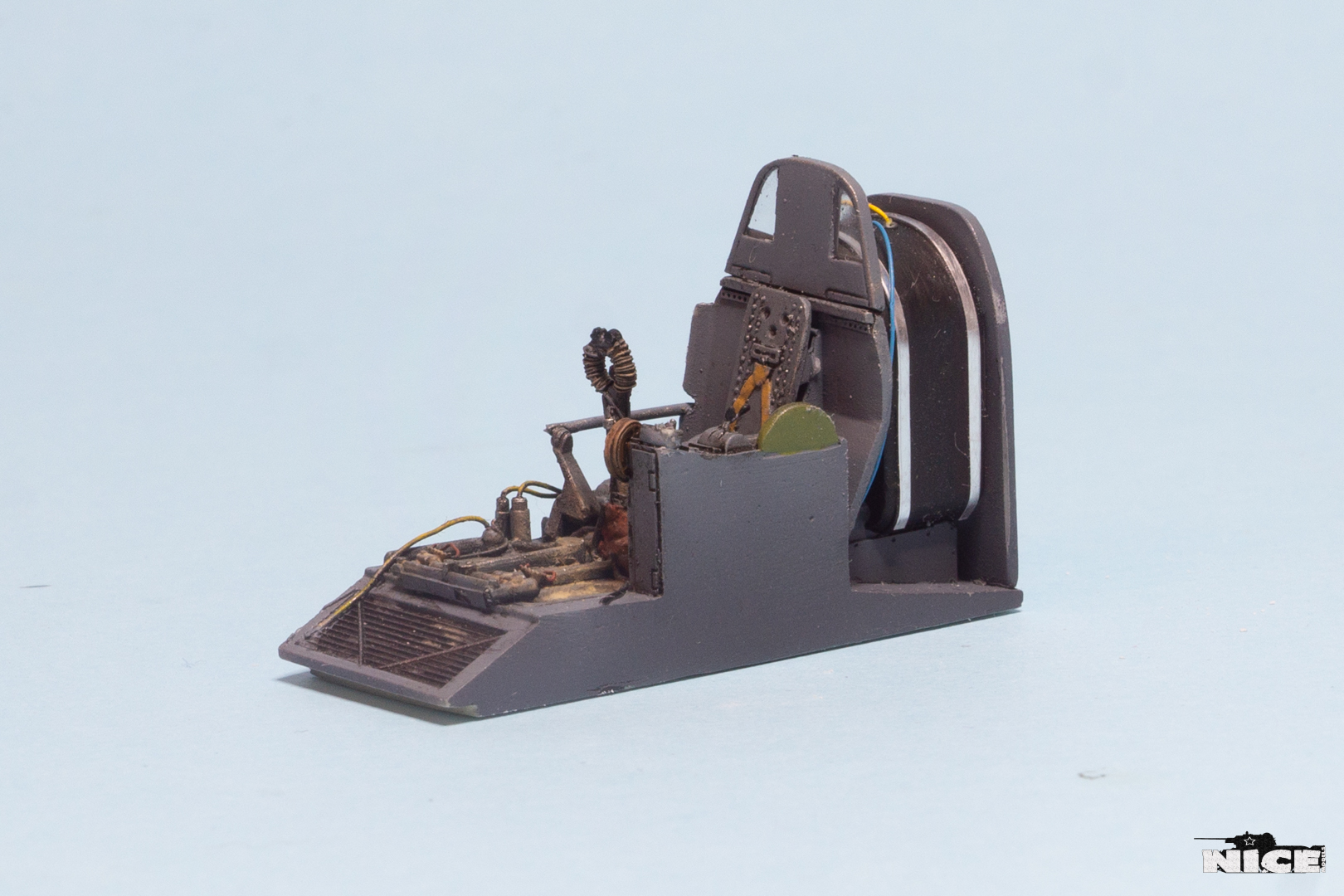 В первую очередь занялся кабинетом. Сделал оплетку на ручке, добавил травленые гашетки, из проволоки провода и шланги. На баке срезал смоляные шланги, потом сделаю из проволоки. Установил травленые педали и ручки. Доработал китовую ручку АСШ. Срезал смоляную бронеспинку выше кресла пилота и заменил ее на стеклянную.